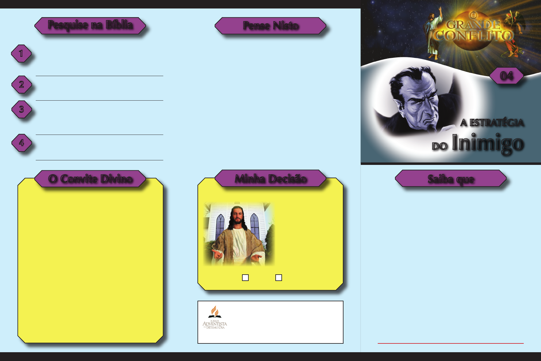 A ESTRATÉGIA DO Inimigo SIM NÃO Quantas nações beberam o vinho de Babilônia? Apocalipse 18:3. Quem se prostituiu com ela? Apocalipse 18:3. Quem se enriqueceu à custa da sua luxúria? Apocalipse 18:3. Pelo que as nações foram seduzidas? Apoc. 18:23. 1 2 3 4 Pesquise na Bíblia Pense Nisto O tema de hoje é impressionante! Assim como Deus tem um plano de salvação, Satanás tam- bém tem um plano, só que o plano dele é para destruir o ser humano. Vamos estudar sobre a estratégia do inimigo no grande conflito O Diabo trabalha de maneira sutil para ten- tar destruí-lo. Ele faz isso por meio de outros instrumentos dando a impressão que não é ele; faz isso exatamente para tentar enganar todas as pessoas. Deus nos ama tanto que revelou na Sua Pa- lavra, a Bíblia, qual é a estratégia do inimigo para não cairmos nas suas ciladas. Saiba que 04 A profecia de Apocalipse 17 nos revela que o Diabo usaria a Igreja Romana e suas “filhas”, as Igrejas que saíram dela, para misturar a verdade com a mentira. Muitas vezes as pessoas aceitam qualquer pre- gação, e na hora do desespero seguem qualquer re- ligião. Tome cuidado! Nem tudo que reluz é ouro e nem todo que diz Senhor, Senhor, entrará no Reino dos Céus. Você precisa seguir o caminho certo. Satanás usa esta estratégia para jogar a verda- de por terra... será que a verdade também não foi lançada por terra no seu coração? Você já passou por algum tipo de engano? Saiba que Satanás quer enganar você, mas em nome de Jesus você não será enganado, porque agora você conhece a verdade, você vai se firmar na verdade e Jesus vai libertá-lo. Quando a Terra for iluminada com a glória de Deus, ou seja, quando a luz da verdade chegar a todos os sinceros que hoje estão no lugar errado, quando estas pessoas saírem do erro então vai se cumprir a Escritura que diz: “...caiu, caiu, a grande Babilônia.” Apocalipse 18:2. A Igreja Romana é uma mistura de paganismo, espiritismo e cristianismo. É o vinho prostituí- do que Satanás usa para embriagar e confundir as pessoas. É através deste poder religioso e po- lítico que o diabo pretende alcançar seu obje- tivo e, pior ainda, jogar a verdade por terra. O conselho de Deus é: “...Retirai-vos dela povo meu.” Apocalipse 18:4. O Convite Divino Minha Decisão Quero sair do erro e fazer parte da igreja verdadeira, porque esta é a vontade de Deus para a minha vida. ©Reprodução permitida com autorização da Igreja Adventista do 7º Dia - Sede Sul-Americana - www.dsa.org.br A Profecia Apocalipse 17:3 a 6 apresenta a estratégia de Satanás por meio dos seguintes símbolos proféticos: Uma mulher prostituta. Uma besta escarlate. 7 cabeças e 10 chifres. Adornada com ouro e jóias. Tinha um cálice com abominação, imundícia e prostituição. Seu nome: grande Babilônia. Mãe das meretrizes e abominações. Embriagada com o sangue dos san- tos e das testemunhas de Jesus. O Significado Em Daniel 8:12 encontramos algo impres- sionante: “...e deitou a verdade por terra; e o que fez, prosperou”. Aqui está a estratégia de Satanás: jogar a verdade por terra. Satanás não pode jogar Deus, Jesus, o Espírito Santo, a Bíblia e os Mandamentos por terra, claro que não, mas em sua estratégia ele tenta por meio de mentira e engano confundir a verdade para que as pessoas se afastem dela. Romanos 1:25 revela-nos a maneira como Satanás tentaria jogar a verdade por terra: “Pois eles mudaram a verdade de Deus em mentira, adorando e servindo a criatura em lugar do Criador, o qual é bendito eterna- mente, amém”. Esta é a estratégia, misturar a verdade com a mentira. Mulher Prostituta Adornada com Ouro e Jóias Abominação, Imundícia, Protituição Mãe das Meretrizes e das Abominações • Mulher = Igreja: Efésios 5:23,32. • Mulher Prostituta = Igreja Infiel a Cristo Embriagada com Sangue dos Santos • Ouro e Jóias = Corrupção Religiosa: Atos 8:20. • Abominações = Fugir da Lei: Apoc. 21:27; Prov. 28:9. • Imundícias = Idolatria: Ezequiel 36:25 a 28. • Prostituição = Mudança da verdade em mentira, adorando e servindo a criatura em lugar do Criador: Romanos 1:25. • Meretrizes = Igrejas caídas: Efésios 5:23. • Abominações = Erros espirituais: Prov. 28:9. Na época da Inquisição, mataram muitos cristãos, derramaram sangue inocente. Apoc. 16:6. O Diabo substituiu o culto verdadeiro por uma falsa forma de culto, bem como um ensino enga- noso quanto ao plano da salvação e ao ministério mediador de Cristo no céu; tudo isto por meio de uma igreja juntamente com outras que a profecia chama de filhas desta igreja infiel. Vejamos abaixo os detalhes: Besta Escarlate • Besta = Reino Poderoso: Daniel 7:23. 7 Cabeças e 10 Chifres • 7 Cabeças = 7 Colinas de Roma: Apoc. 17:9. • 10 Chifres = 10 Reinos (países) da Europa da Idade Média. Grande Babilônia • Babilônia = Salvação por obras e confusão: Gên. 11:3-7. Sete Colinas de Roma