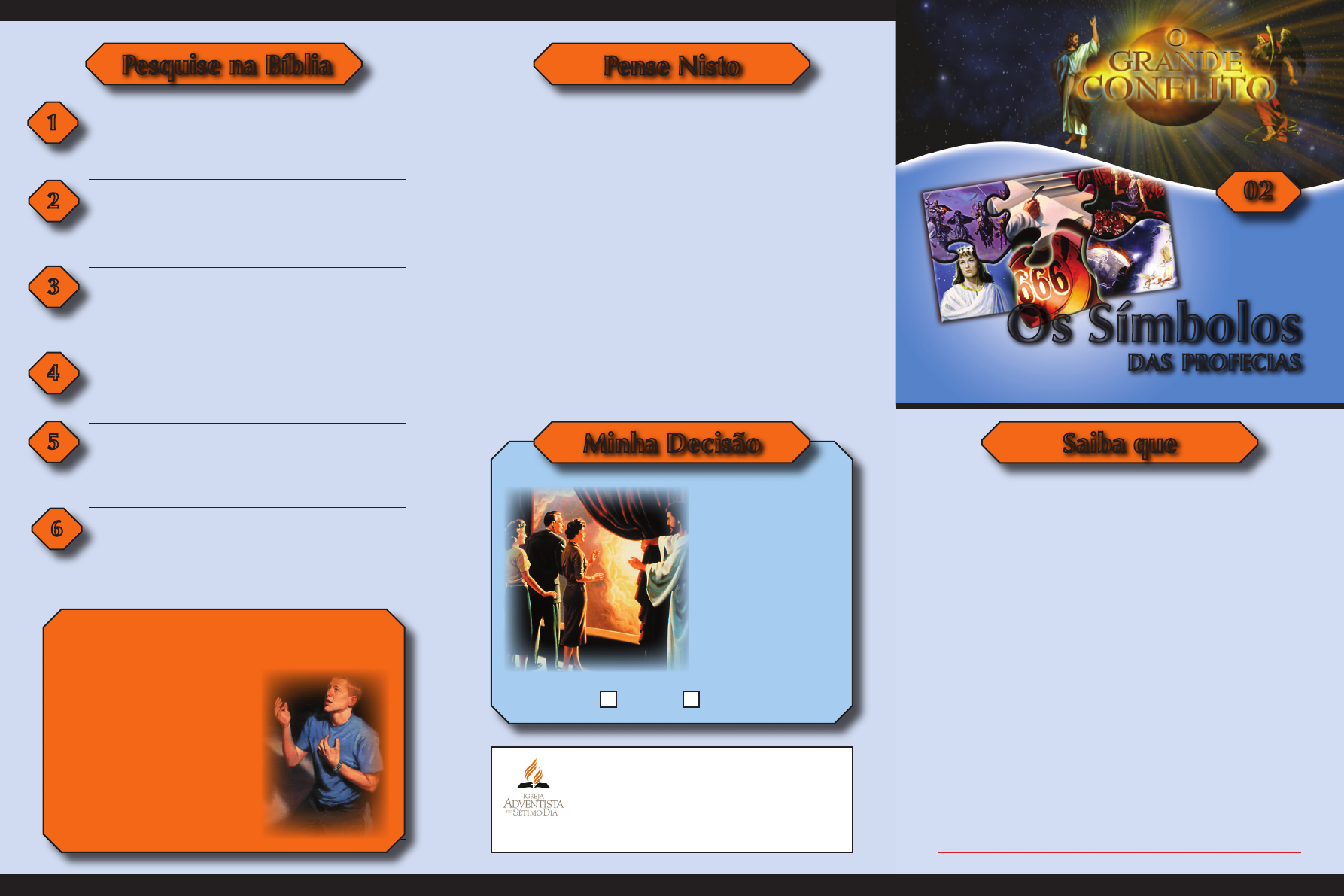 Os Símbolos DAS PROFECIAS Sei que Deus tem um lindo plano para a minha vida e agora quero co- nhecer as verdades de Deus de acordo com as profecias da Bíblia. Quero continuar fiel aos ensinos da Bíblia. SIM NÃO Em todos os tempos, por meio de quem Deus tem falado? Amós 3:7. O que ocorre com as pessoas se não há profe- cia? Provérbios 29:18. Os ensinos da Bíblia são apenas para pessoas muito estudadas? Mateus 11:25. Por que as pessoas erram? Mateus 22:29. Qual é o conselho de Jesus para todos nós? João 5:39. O que fazer quando não entender a Bíblia? Apocalipse 1:3. 1 2 3 4 5 6 Pesquise na Bíblia Pense Nisto “A História que o grande EU SOU assinalou em Sua Palavra, unindo-se cada elo aos de- mais na cadeia profética, desde a eternidade no passado até a eternidade no futuro, diz-nos onde nos achamos hoje, no prosseguimento dos séculos, e o que se poderá esperar no tem- po vindouro. Tudo o que a profecia predisse como devendo acontecer, até a presente épo- ca, tem-se traçado nas páginas da História, e podemos estar certos de que tudo que ainda há de vir se cumprirá em sua ordem” – Ellen White, Educação, p. 178. Vamos descobrir a maneira correta de entender as profecias Saiba que 02 É muito importante você conhecer a Bíblia Sa- grada, mas Satanás não quer que você conheça a Palavra de Deus; ele não quer que você entenda as profecias... Por isso a dificuldade para você estudar a Bíblia. Fazer este curso já é uma vitória para você; já é uma bênção para sua vida espiritual, mas Deus quer revelar muito mais... Ele quer revelar a você o plano da salvação. À medida que você estudar a Bíblia, a luz da verdade irá iluminar a sua mente, as trevas irão se dissipar, e Deus vai tirar as trevas e trazer luz ao seu coração! Estudando a Bíblia, a verdade vai expulsar o ini- migo da sua vida e a luz do evangelho fará de você um vitorioso no conflito entre o mal e o bem. Minha Decisão “E conhecereis a verdade e a verdade vos libertará”. João 8:32. Jesus vai libertar você... ...do pecado, ...da dúvida, ...do medo, ...da insegurança, ...do mal, ...do orgulho, ...do vazio interior, e das garras de Satanás. ©Reprodução permitida com autorização da Igreja Adventista do 7º Dia - Sede Sul-Americana - www.dsa.org.br Como Estudar a Bíblia: A Palavra de Deus deve ser examina- da com muita oração e muito cuida- do. João 5:39. O profeta Isaías apresenta um prin- cípio que nos ajuda a buscar a inter- pretação da profecia. Este princípio é: A BÍBLIA INTERPRETA-SE A SI MESMA. “Porque é preceito sobre preceito, preceito e mais preceito; regra sobre regra, regra e mais regra; um pouco aqui, um pouco ali.” Isaías 28:10. As profecias relacionadas com o Grande Conflito entre o mal e o bem são apresenta- das em forma simbólica - Os livros de Daniel e Apocalipse - mas podemos compreender plenamente se deixarmos a Bíblia falar por si mesma, se estu- darmos o santo livro com o coração aberto à verdade de Deus. Tabelinha de Conversão Animal Mulher Um Dia Águas Daniel 7:17 e 23. “Bem-aventurado aquele que lê e aquele que ouve as palavras da profecia e guarda as coisas nela escritas, pois o tempo está próximo.” Apocalipse 1:3. Ventos Efésios 5:23 e 32. Ezequiel 4:6-7. Apocalipse 17:15. Jeremias 51:1 a 5. Chifres Tempos Dragão Cordeiro Apocalipse 17:12. Cauda Daniel 11:13. Apocalipse 12:9. João 1:29. Isaías 9:15. Estrelas Apocalipse Apocalipse 12:4 e Daniel 12:3. Apocalipse 1:3.