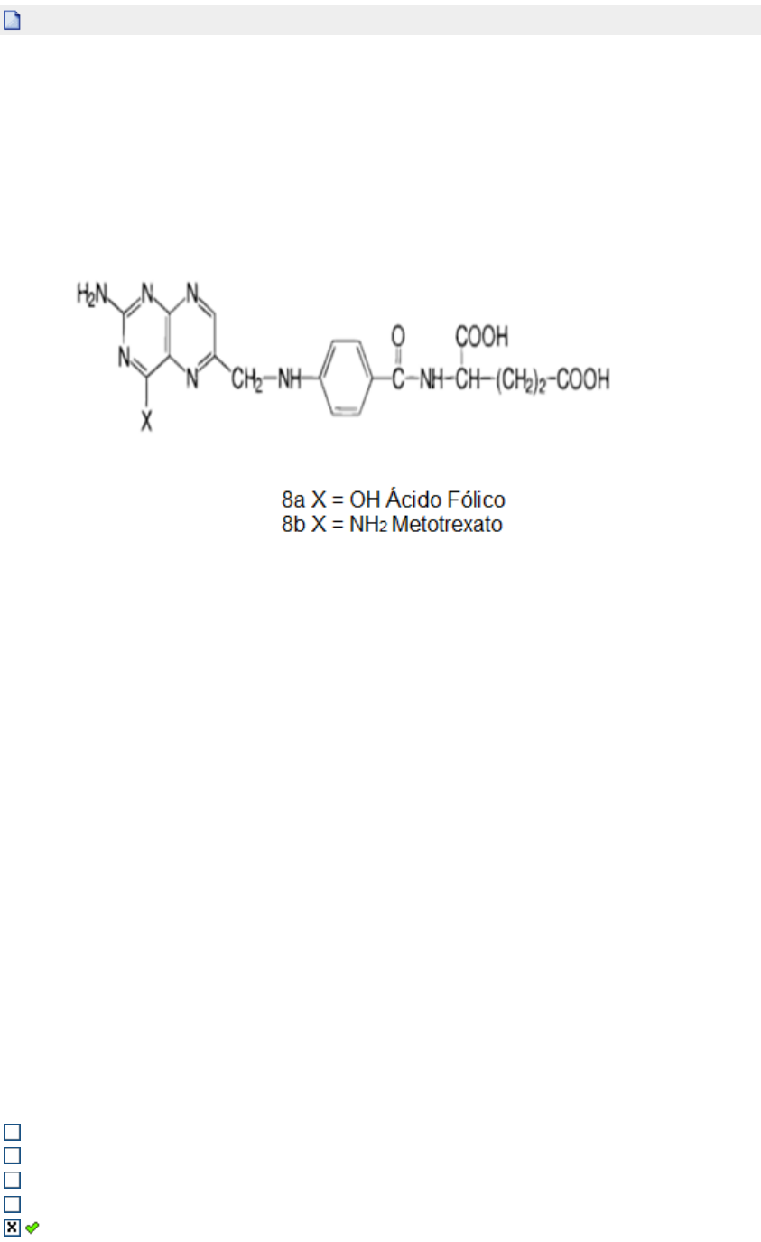 1a Questão (Ref.:201309103378) Pontos: 0,1 / 0,1 O bioisosterismo é uma técnica de modificação molecular referentes a subunidades estruturais de compostos bioativos que apresentam volumes moleculares, formas, distribuições eletrônicas e propriedades físico-químicas semelhantes. A figura a seguir representa um exemplo de substituição bioisosterica utilizada na síntese do metotrexato. Fonte: PATANI, G.A., LAVOIE, E.J. bioisosterism: A rational approach in drug design. Chem. Rev. N. 96, 3147 ¿ 3176, 1996. (Adaptada) Com base nos conceitos e propriedades envolvidas na técnica de modificação bioisosterica, analise as sentenças a seguir: I. A substituição bioisostérica da hidroxila pelo grupo amina, conforme realizada na síntese da molécula do metotrexato, enquadra-se no tipo de bioisosterismo clássico monovalente. II. A similaridade do tamanho esterico, arranjo espacial e habilidade em atuarem como aceptores e doadores de hidrogênio são características que garantem o sucesso no uso da hidroxila e da amina como bioisosteros. III. Os grupos bioisosteros hidroxila e amina não apresentam o mesmo número de elétrons de valência, não são, portanto, isoeletrônicos. Estão corretas: I apenas I, II e III. III apenas II apenas I e II apenas 2a Questão (Ref.:201308146810) Pontos: 0,1 / 0,1 A atorvastatna (1) é um fármaco inibidor da biossínetese de colesterol, atua na inibição da enzima HMG- CoA redutase, apresentando como vantagem suplementar aos outros membros da classe disponíveis no mercado, a propriedade de reduzir também a concentração plasmática de lipoproteínas de baixa densidade, em menor dose e mais rapidamente, permitindo um melhor ajuste à posologia. Em 2008, pesquisadores da Pfizer, em Ann Arbor, EUA, identificaram propriedades antilipêmicas superiores àquelas da atorvastatina nos sais sódicos de isósteros pirazólicos, protótipo (2). Avaliando as possibilidades de metabolismo da atorvastina e do protótipo (2), verificamos que a literatura [J. -E. Park a ; K. -B. Kim b ; S. K. Bae c ; B. -S. Moon a ; K. -H. Liu bd ; J. -G. Shin bc , Contribution of cytochrome P450 3A4 and 3A5 to the metabolism of atorvastatin, Xenobiotica, Volume 38, Issue 9 September 2008 , pages 1240 - 1251] descreve dois principais metabólitos oriundos da atividade da CYP3A4, descritos abaixo. Analisando os metabólitos da atorvastatina podemos inferir que a reação envolvida foi uma hidroxilação benzílica que também poderia ocorrer no protótipo 2. Analisando os metabólitos da atorvastatina podemos inferir que a reação envolvida foi uma hidroxilação aromática que também poderia ocorrer no protótipo 2. Analisando os metabólitos da atorvastatina podemos inferir que a reação envolvida foi uma hidroxilação benzílica que não poderia ocorrer no protótipo 2 devido a presença da metila benzílica. Analisando os metabólitos da atorvastatina podemos inferir que a reação envolvida foi uma hidroxilação aromática que não é favorecida no protótipo 2 já que a posição para do anel esta metilada. Analisando os metabólitos da atorvastatina podemos inferir que a reação envolvida foi uma hidroxilação alifática que não é favorecida no protótipo 2 já que a posição para do anel esta metilada. 3a Questão (Ref.:201308146971) Pontos: 0,1 / 0,1 Qual o grau de ionização do losartan em meio ácido (pH =1 ) sabendo que o pKa 4,5 desta droga ? 0,030% 99,46% 10,23% 13,23% 5,45% 4a Questão (Ref.:201309037892) Pontos: 0,1 / 0,1 O Flubiprofeno é um anti-inflamatório que atua inibindo a enzima prostaglandina endoperóxido sintase (PGHS) ao interagir com o sítio receptor da subunidade 120 da Arginina. Com base na figura a seguir, pode-se afirmar que as interações do flubiprofeno com o receptor representado pelas setas são: Fonte: Eliezer J. Barreiro - Química Medicinal - As Bases Moleculares Da Ação Dos Fármacos, 2ª Edição (adaptada) Dipolo-dipolo Apenas ligações iônicas Forças de van der Waals e interação de hidrogênio Interação de hidrogênio e ligação iônica Apenas interações de hidrogênio 5a Questão (Ref.:201309065573) Pontos: 0,1 / 0,1 Sobre os fármacos apresentados, assinale a alternativa incorreta: Com o bioisosterismo destes fármacos, pode se adquirir melhor biodisponibilidade, maior seletividade e menores efeitos colaterais para estes fármacos Lansoprazol e o pantoprazol apresentam a função haleto de hidrocarboneto À partir de suas estruturas apresentam um bioisosterismo de função, o que distingue a estrutura química de cada fármaco Todos os fármacos apresentam uma tio cetona nas suas estruturas Apresentam a sua farmacodinâmica antagonizando a bomba de prótons H+/K+ ATPase