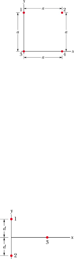 Física Geral II 4ª Lista de Exercícios – Cargas Elétricas e Campos Elétricos 1) Na figura ao lado, as cargas das partículas são q1 = –q2 = 100 nC e q3 = –q4 = 200 nC. O lado do quadrado é a = 5,0 cm. Determine (a) a componente x e (b) a componente y da força eletrostática a que está submetida a partícula 3. (ref. Exercício 09 – Cap. 21 – 8ª ed) 2) Três partículas são mantidas fixas sobre um eixo x. A partícula 1, de carga q1, está em x = −a e a partícula 2, de carga q2, está em x = +a. Determine a razão q1/q2 para que a força eletrostática a que está submetida a partícula 3 seja nula (a) se a partícula 3 estiver no ponto x = +0,5a e (b) se partícula 3 estiver no ponto x = +1,5a. (ref. Exercício 10 – Cap. 21 – 8ª ed) 3) Duas partículas são mantidas fixas em um eixo x. A partícula 1, de carga 40 μC, está situada em x = –2,0 cm, a partícula 2, de carga Q, está situada em x = 3,0 cm. A partícula 3 está inicialmente no eixo y e é liberada, a partir do repouso, no ponto y = 2,0 cm. O valor absoluto da carga da partícula 3 é 20 μC. Determine o valor de Q para que a aceleração inicial da partícula 3 seja (a) no sentido positivo do eixo x e (b) no sentido positivo do eixo y. (ref. Exercício 18 – Cap. 21 – 8ª ed) 4) Na figura ao lado, as partículas 1 e 2, de carga q1 = q2 = +3,2×10-19 C, estão sobre o eixo y, a uma distância d = 17,0 cm da origem. A partícula 3, de carga q3 = +6,4×10-19 C, é deslocada ao longo do eixo x, de x = 0 até x = 5,0 m. Para que valor de x o módulo da força eletrostática exercida pelas partículas 1 e 2 sobre a partícula 3 é (a) mínimo e (b) máximo? Quais são os valores (c) mínimo e (d) máximo do módulo? (ref. Exercício 21 – Cap. 21 – 8ª ed) 5) Três partículas carregadas formam um triângulo: a partícula 1, com uma carga Q1 = 80 nC, está no ponto (0; 3,0 mm); a partícula 2, com uma carga Q2 está no ponto (0; –3,0 mm) e a partícula 3, com uma carga q = 18 nC, está no ponto (4,0 mm; 0). Em termos dos vetores unitários, qual é a força eletrostática exercida sobre a partícula 3 pelas outras duas partículas (a) para Q2 = 80 nC e (b) para Q2 = –80 nC? (ref. Exercício 59 – Cap. 21 – 8ª ed) 6) Na figura, duas pequenas esferas condutoras de mesma massa m e mesma carga q estão penduradas em fios não-condutores de comprimento L. Suponha que o ângulo θ é tão pequeno que a aproximação tan senθ θ≈ pode ser usada. (a) Mostre que a distância de equilíbrio entre as esferas é dada por 1 32 02 q Lx mgπε = (b) Se L = 120 cm, m = 10 g e x = 5,0 cm, qual é o valor de |q|? (ref. Exercício 54 – Cap. 21 – 8ª ed) 7) Na figura as quatro partículas formam um quadrado de lado a = 5,0 cm e têm cargas q1 = +10,0 nC, q2 = −20,0 nC, q3 = +20,0 nC e q4 = −10,0 nC. Qual é o campo elétrico no centro do quadrado, em termos dos vetores unitários? (ref. Exercício 9 – Cap. 22 – 8ª ed) 8) Na figura, as três partículas são mantidas fixas no lugar e têm cargas q1 = q2 = +e e q3 = +2e. A distância a = 6,0 μm. Determine (a) o módulo e (b) a direção do campo elétrico no ponto P. (ref. Exercício 13 – Cap. 22 – 8ª ed) 9) A figura mostra dois anéis não-condutores paralelos com os centros sobre a mesma reta perpendicular aos planos dos anéis. O anel 1, de raio R, possui uma carga uniforme q1, o anel 2 também de raio R possui uma carga uniforme q2. Os anéis estão separados por uma distância d = 3R. O campo elétrico no ponto P situado na reta que passa pelos centros dos anéis, a uma distância R o anel 1, é zero. Determine a razão q1/q2. (ref. Exercício 23 – Cap. 22 – 8ª ed) 10) Na figura ao lado, uma barra final de vidro forma uma semicircunferência de raio r = 5 cm. Uma carga +q = 4,5 pC está distribuída na metade superior da barra, e uma carga –q = –4,5 pC está distribuída uniformemente na metade inferior. Determine (a) o módulo e (b) a orientação (em relação ao semi- eixo x positivo) do campo elétrico E no ponto P, situado no centro do semicírculo. (ref. Exercício 24 – Cap. 22 – 8ª ed) 11) Na figura, uma barra não-condutora de comprimento L = 8,15 cm tem uma carga –q = –4,23 fC uniformemente distribuída. (a) Qual é a densidade linear de cargas da barra? Determine (b) o módulo e (c) a direção (em relação ao semi-eixo x positivo) do campo elétrico produzido no ponto P, situado no eixo x, a uma distância a = 12 cm da extremidade da barra. Determine o módulo do campo elétrico produzido em um ponto situado no eixo x, a uma distância a = 50 m do centro da barra, (d) pela barra e (e) por uma partícula de carga –q = –4,3 fC colocada no lugar anteriormente ocupado pelo centro da barra. (ref. Exercício 27 – Cap. 22 – 8ª ed) 12) A figura mostra dois anéis concêntricos de raios R e R’=3R, que estão no mesmo plano. O ponto P está no eixo central z, a uma distância D = 2R do centro dos anéis. O anel menor possui uma carga uniformemente distribuída +Q. Em termos de Q, qual deve ser a carga uniformemente distribuída no anel maior para que o campo elétrico no ponto P seja nulo? (ref. Exercício 28 – Cap. 22 – 8ª ed) 13) Uma barra fina não-condutora, com uma distribuição uniforme de carga positiva Q, tem a forma de um círculo de raio R. O eixo central do anel é o eixo z, com a origem no centro do anel. Determine o módulo do campo elétrico (a) no ponto z = 0 e (b) no ponto z = ∞. (c) Em termos de R, para que valor positivo de z o módulo do campo elétrico é máximo? (d) Se R = 2,0 cm e Q = 4,0 µC, qual é o valor do campo? (ref. Exercício 30 – Cap. 22 – 8ª ed) 14) Na figura, uma barra não-condutora “semi-infinita” (ou seja, infinita apenas em um sentido) possui uma densidade linear de cargas uniforme λ. Mostre que o campo elétrico PE no ponto P faz um ângulo de 45º com a barra e que esse resultado não depende da distância R. (ref. Exercício 33 – Cap. 22 