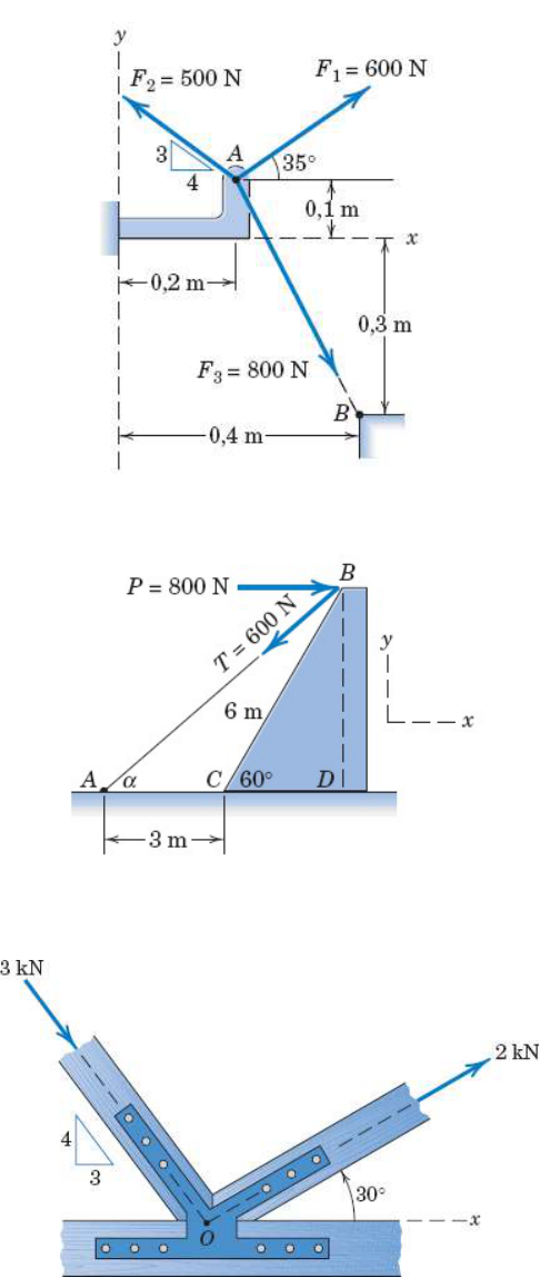 1ª Lista de exercícios – Mecânica Estática Professor: Markssuel Marvila Seção da Aula 01: Forças resultantes em 2D. 1) As forças F1, F2 e F3, todas atuando no ponto A do suporte, são especificadas de três modos diferentes. Determine a força resultante que age no ponto A. 2) Combine em uma única força equivalente R as duas forças P e T, que atuam no ponto B da estrutura fixa. 3) Os dois elementos estruturais, um sob tração e o outro sob compressão, exercem as forças indicadas no nó O. Determine o módulo da resultante R das duas forças e o ângulo θ que R faz com o eixo x positivo. 4) Um anel em forma de D é costurado em uma mochila para prender objetos do lado de fora da mochila. Se o anel tem três cordas amarradas a ele e as cordas suportam as forças mostradas, determine a força resultante aplicada no anel em D pelas cordas, expressando o resultado como um vetor. 5) Determine a direção da força resultante obtida pela soma de F1, F2 e F3. 6) Determine a direção da força resultante obtida pela soma de F1, F2 e F3. Seção da Aula 02: Forças resultantes em 3D. 7) Determine a força resultante proveniente da soma das três forças indicadas. Determine também os ângulos diretores da força resultante. 8) Determine a força resultante que atua na viga, bem como seus ângulos diretores. 9) O suporte está sujeito as duas forças indicadas. Determine a intensidade da força resultante e seus ângulos diretores. Seção da Aula 03: Vetor direção, Força escrita pela direção e Produto escalar. 10) Uma força F de módulo 100 N é aplicada na origem O dos eixos x-y-z, como mostrado. A linha de ação de F passa por um ponto A cujas coordenadas são 3 m, 4 m e 5 m. Determine a força F na sua forma vetorial. 11) Expresse uma força F de 900N vetorialmente em termos dos vetores unitários i, j e k. 12) Determine o vetor direção de A para B, através da figura a seguir. 13) Expresse F como um vetor cartesiano e determine seus ângulos diretores. 14) Determine a intensidade e os ângulos diretores da força resultante que age no ponto A. 15) Determine a intensidade e os ângulos diretores da força resultante que age no ponto B da árvore ilustrada na figura. 16) Determine a intensidade e os ângulos diretores do vetor resultante da soma das forças indicadas na figura. 17) Determine o ângulo entre os dois vetores. 18) Determine o ângulo entre os dois vetores. Bibliografia utilizada: Hibbeler – Estática: Mecânica para engenharia. 10ª edição. Meriam - Mecânica para engenharia: Estática. 7ª edição. Plesha – Mecânica para engenharia: Estática. 1ª edição.