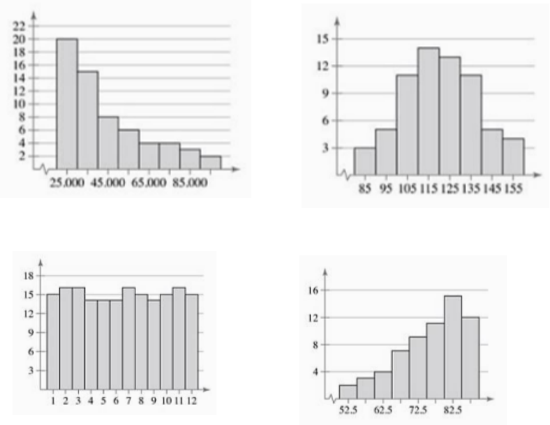 Exercícios de Estatística Unidade 2 – Medidas de Posição e Medidas de Dispersão 1) Determine se a frase é verdadeira ou falsa. Se for falsa, reescreva-a de forma que seja verdadeira: (a) A média é a medida de tendência central que mais pode ser afetada por um valor discrepante. (b) Todo conjunto de dados deve ter uma moda. (c) Alguns conjuntos de dados quantitativos não têm mediana. (d) Quando todas as classes de dados tem a mesma frequência, a distribuição é assimétrica à direita. (e) Quando a média é maior que a mediana, a distribuição é assimétrica à direita. 2) Construa um conjunto de dados que tenha as seguintes característica: (a) A mediana não representa um número típico no conjunto de dados. (b) A mediana e a moda são as mesmas. 3) Determine se a forma aproximada da distribuição no histograma é simétrica, uniforme, assimétrica à esquerda, assimétrica à direita ou nenhuma das anteriores: (a) (b) (c) (d) 4) Encontre a média, a mediana e a moda dos dados, se possível. Se quaisquer dessas medidas não puderem ser encontradas, explique o porquê: (a) O número máximo de lugares em uma amostra de 13 utilitários esportivos. 6 6 9 9 6 5 5 5 7 5 5 5 8 (b) O tempo (em segundos) para uma amostra de sete carros esportivos para ir de 0 a 60 milhas por hora. 3,7 4,0 4,8 4,8 4,8 4,8 5,1 (c) Os pontos médios por jogo marcados por cada time durante a temporada regular de 2006. (d) As respostas de uma amostra de 1.040 pessoas que foram perguntadas se a qualidade do ar em sua comunidade está melhor ou pior do que 10 anos atrás. Melhor: 346 Pior: 450 Igual: 244 (e) A velocidade máxima (em milhas por hora) para uma amostra de sete carros esportivos 187,3 181,8 180,0 169,3 162,2 158,1 155,7 (f) O preço recomendado (em dolares) para diversas ações que os analistas preveem que irão produzir pelo menos 10% de retornos anuais. 41 20 22 14 15 25 14 40 17 14 (g) O número de semanas que uma amostra de 14 pacientes com distúrbios alimentares tratados com psicoterapia psicodinâmica e técnicas de comportamente cognitivo leva para atingir o peso-alvo. 2,5 20,0 11,0 10,5 17,5 16,5 13,0 15,5 26,5 2,5 27,0 28,5 1,5 5,0 5) No gráfico a seguir, as letras A, B e C estã marcadas no eixo horizontal. Descreva a forma dos dados. Em seguida, determine qual letra corresponde à média, à mediana e à moda. Justifique. 6) Determine a média ponderada dos dados: (a) Fornecemos as notas e suas porcentagens na nota final de um aluno de estatística. Qual é a nota média do aluno? (b) Um estudante recebe as seguintes notas, com A valendo 4 pontos, B valendo 3 pontos, C valendo 2 pontos e D valendo 1 ponto. Qual a nota média? 7) Aproxime a média dos dados agrupados: (a) Altura de 18 estudantes do sexo feminino durante uma aula de educação física. (b) Idade dos moradores de uma cidade 8) Construa uma distribuição de frequências e o histograma de frequências correspondente para os dados, usando o número de classes indicado. Descreva a forma do histograma com simétrico, uniforme, assimétrico à esquerda, assimétrico à direita ou nenhum dos anteriores: (a) (b) 9) 10) Um serviço de testes ao consumidor obteve as seguintes distâncias percorridas por litro de combustível, em cinco testes de desempenho com três tipos de carros compactos: A amplitude total média é uma medida de tendência central raramente utilizada, mas muito fácil de ser calculada através da fórmula: (Entrada máxima de dados) + (Entrada mínima de dados) 2 ou seja, é a média aritmética das entradas de dados máxima e mínima. Neste caso, qual dos fabricantes de carros iria preferir usar a amplitude total média em seus anúncios? 11) Encontre a amplitude, a média, a variância e o desvio padrão dos conjuntos de dados: (a) Uma população com os seguintes dados: 12 9 7 5 7 8 10 4 11 6 (b) Uma amostra com os seguintes dados: 17 8 13 18 15 9 10 11 6 12) Explique como encontramos a amplitude de um conjunto de dados. Qual a vantagem de usarmos a amplitude como medida de variação? Qual a desvantagem? 13) Por que o desvio padrão é usado mais frequentemente do que a variância? 14) 15) 16) 17) 18) 19) 20) 21) 22) 23) 24) 25) 26) Encontre os três quartis para o conjunto de dados: 4 7 7 5 2 9 7 6 8 5 8 4 1 5 2 8 7 6 6 9 27) Os gols marcados, por jogo, por um time de futebol representam o primeira quartil para todos os times da liga. O que podemos concluir sobre os gols marcados por esse time, por jogo? 28) A nota de um estudante em um exame atuarial está no 78º percentil. O que podemos concluir sobre a nota desse estudante no exame? 29) Classifique as afirmações em veradadeira ou falsa. Se for falsa, reescreva-a de um modo que se torne verdadeira. (a) O segundo quartil é a mediana de um conjunto de dados ordenado. (b) O 50º percentil é quivalente ao Q1. 30) 31) Você pode encontrar o percentil que corresponde um valor de dados específico usando a fórmula a seguir, então, arredondando para o próximo número inteiro: Percentil de x = (número de entradas de dados menores que x )⋅100 (número total de entradas de dados) Somente quatro vencedoas do Oscar de melhor atriz eram mais velhas que Helen Mirren quando ganharam o prêmio. Encontre o percentil que corresponde à idade de Helen Mirren. 32) Os dados a seguir representam a altura (em polegadas) de alunos do curso de estatística: 52 54 55 56 56 56 58 59 60 61 61 63 65 67 68 68 70 71 72 (a) Encontre a altura que corresponde ao primeiro quartil. (b) Encontre a altura que corresponde ao terceiro quartil. (c) Encontre a amplitude interquartil. 33) Encontre a amplitude interquartil para o conjunto de dados: 42 36 39 42 44 45 42 42 36 38 34) Uma nota de 68 em um teste de um aluno representa o 77º percentil das notas. Qual porcentagem de alunos obteve mais do que 68? 35) Os números de tornados, por estado, em um ano recente, estão listados a seguir. Encontre o primeiro, o segundo e o terceiro quartis do conjunto de dados.