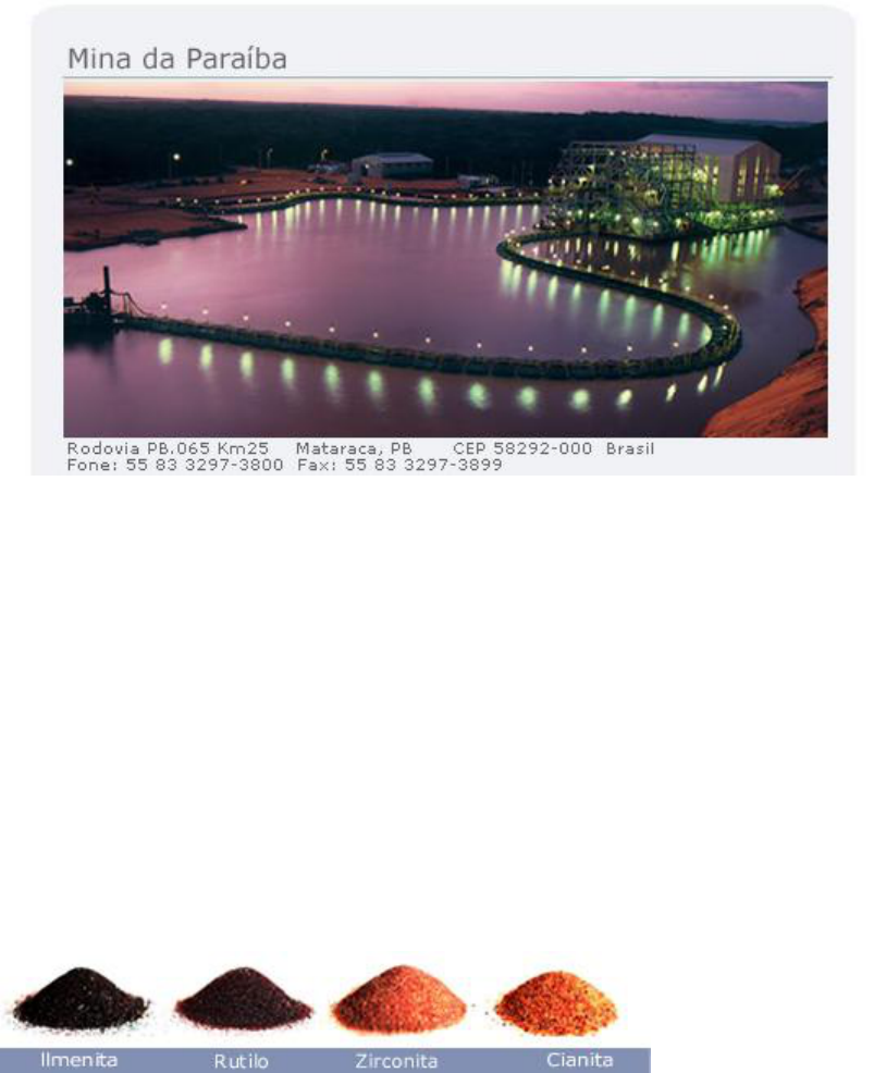 A Millennium Mineração Ltda, na Paraíba, é responsável pela extração do minério de Titânio do grupo Cristal Global no Brasil. A mina está localizada no Nordeste brasileiro, no município de Mataraca, na Paraíba, a cerca de 1.100 km da planta da Bahia - que é responsável pela transformação do minério em pigmento de TiO2. Ocupa uma área de 1.186 hectares. Consiste em um complexo de planta flutuante, draga e quatro plantas fixas que produz, além da Ilmenita, a Zirconita, usada para produção de cerâmicas e refratários, o Rutilo, aplicado em eletrodos de solda e ligas metálicas, e a Cianita, matéria-prima para refratários. Tem os seus sistemas de gestão certificados pelas normas ISO 9001:2008, ISO 14001:2004 e OHSAS 18001:2007. O programa de recuperação do meio ambiente desenvolvido pela mina da Paraíba é reconhecido nacionalmente, inclusive pelo Ibama, que o considera modelo para recomposição de dunas. Nesse trabalho, a Millennium devolve as características ambientais, recompondo a fauna e flora local. Do total de mudas nativas replantadas nas áreas mineradas, 80 por cento são produzidos pela comunidade local, num programa onde a empresa qualifica, fornece os insumos e compra as mudas, gerando renda para a população rural circunvizinha. AGREGANDO VALOR ECONÔMICO Aproximadamente 280 empregados e contratados em tempo integral Folha de pagamento e benefícios anuais de cerca de R$ 10 milhões Cerca de R$ 8,5 milhões são gastos com insumos e R$ 12 milhões em peças e serviços A Millennium A Millennium Inorganic Chemicals do Brasil SA é uma empresa do grupo Cristal Global, segundo maior produtor de pigmento de Dióxido de Titânio (TiO2) do mundo. A Cristal Global conta com oito fábricas de TiO2 distribuídas em cinco continentes, sendo três plantas nos Estados Unidos, uma na Inglaterra, uma na França, uma na Arábia Saudita, uma na Austrália e uma no Brasil. A fábrica brasileira está localizada no Km 20 da Estrada do Coco (BA 099), Camaçari, na Bahia. Essa é a única fábrica com produção integral do pigmento em toda a América Latina. A planta da Bahia utiliza como principal matéria-prima o minério de Titânio, ou Ilmenita, retirado da mina da Paraíba, de propriedade da Cristal Global. Para entender o que é o minério, basta examinar um punhado de areia da praia: nele, você encontrará grãos de diversas cores. O mais preto de todos é a Ilmenita, que é trazida da mina da Paraíba para a Planta da Bahia e transformado é um pigmento branco (TiO2) usado para dar cor, brilho e poder de cobertura a uma vasta gama de produtos como tintas, plásticos, papéis, borrachas e muitos outros. Além da Ilmenita, a mina da Paraíba também produz os minérios Zirconita, Cianita e Rutilo. O pigmento produzido na Bahia, ou trazido de outras plantas da Cristal no mundo, é comercializado no Brasil e em toda a América Latina pelo escritório comercial da empresa localizado em São Paulo.