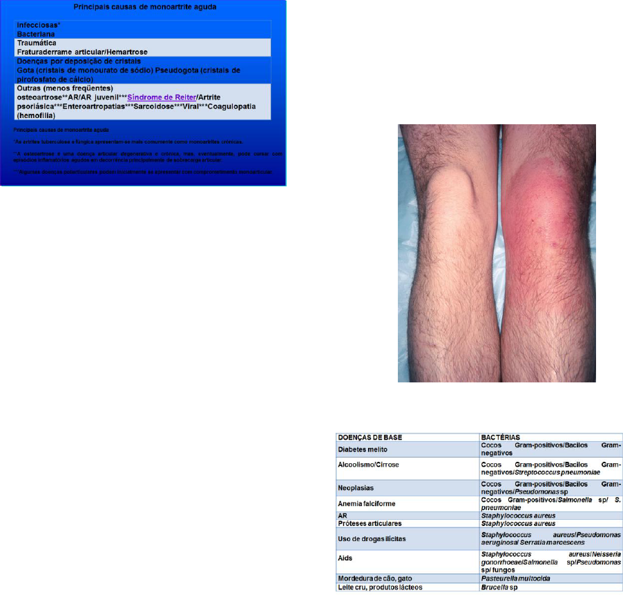 Artrite Infecciosa Definição É uma monoartrite causada por uma bactéria, podendo atingir articulações importantes como coluna vertebral, bolsas sinoviais, quadril. Etiologia Gonocócicas Neisseria Gonorrhae Não-gonocócicas Staphylococcus aureus ***Principal por traumas na pele. Streptococcus Gram negativos Obs.: Em crianças, as bactérias mais comuns, conforme a faixa etária são: - neonatos – Staphylococcus aureus, estreptococos, bacilos Gram-negativos; - < 2 anos – Haemophilus influenzae, Staphylococcus aureus; - 2-15 anos – Staphylococcus aureus, Streptococcus pyogenes Gonocócica É uma forma comum em pacientes jovens. Acomete principalmente mulheres, já que a infecção gonocócica nelas em grande parte é gonocócica. E já no homem tem característica de secreção intensa, que o leva ao tratamento. Transmissão Sexual por práticas de risco Esplenectomizados Deficiência do sistema complemento Manifestações clínicas Poliartralgia Poliartrite migratória Sinais sistêmicos de inflamação Tenossinovite – vermelhidão onde houver tendão Dermatite máculo papular Adenosinovite Não-gonocócica É uma monoarterite, mas pode acometer até 4 articulações (oligoarterite). A articulação do joelho é a mais comumente afetada (48%), a coxofemoral é a segunda em incidência (24%) Fatores de risco para desenvolver artrite séptica não-gonocócica Diminuição das defesas do hospedeiro – idosos, neoplasias, doenças crônicas graves (por exemplo, diabetes mellitus, cirrose, doença renal crônica, anemia falciforme), Uso de medicamentos imunossupressores (por exemplo, glicocorticóides, quimioterapia), Defeitos de fagocitose (deficiências do complemento); Inoculação por via hematogênica – uso de drogas ilícitas por via venosa, Procedimentos invasivos (cateteres intravenosos); inoculação iatrogênica – após artrocentese ou artroscopia. As infiltrações intra-articulares com corticosteróides podem, algumas vezes, ser responsáveis por artrite bacteriana (< 1%); Gota, artrite traumática; próteses articulares; AIDS Doença articular prévia – principalmente AR, LES, Osteoartrose Manifestações clínicas Monoarterite de início súbito Febre e calafrios importantes – pela bacteremia Sinal de alerta Diagnóstico Artrocentese – na dúvida, a articulação deverá ser puncionada para análise do líquido sinovial. É o exame mais importante para o diagnóstico de artrite séptica. Aspecto turvo, amarelado ou verde acinzentada. Presença de polimorfonucleares e bactéria. Diminuição da glicose. USG, TC e RM A USG orienta até mesmo a artrocentese Procura de osteomielite na TC e RM e radiografia TC e RM para avaliar partes moles. Hemograma Leucocitose com desvio para a esquerda. Hemocultura – bacteremia Mais comum na não-gonocócica Tratamento O tratamento é guiado pelo resultado da hemocultura. A via de administração deverá ser intravenosa. Tratamento hospitalar Drenagem da articulação Por vezes cirúrgica Analgésicos Fisioterapia Evitar a imobilização