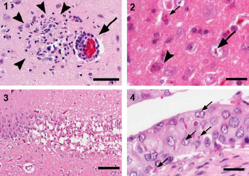 Universidade de Caxias do Sul Curso de Medicina Veterinária Histopatologia Veterinária Nome: Liane Dalpiaz Turma: 36 CINOMOSE Lesões Microscópicas: nos pulmões espessamento das paredes dos alvéolos devido a infiltrados mononucleares intersticiais e hiperplasia dos pneumócitos tipo II. No SNC: desmielinização, hiperplasia e hipertrofia astrocítica, corpúsculos de inclusão intranucleares, neurônios necróticos (vermelho) e células inflamatórias mononucleares. Lâmina 1: manguito perivascular; lâmina 2: corpúsculos de inclusão intracitoplasmáticos; lâmina 3: necrose e degeneração do estrato córneo no giro dentado; lâmina 4: corpúsculos de inclusão no epitélio da bexiga.