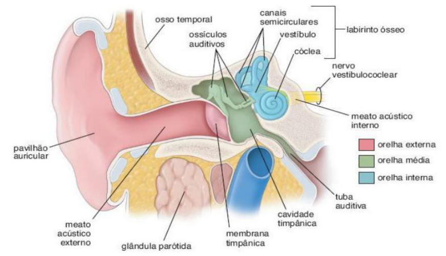 Histologia e Embriologia da Orelha Estrutura geral da orelha e suas funções Constituído pelo aparelho auditivo ou órgão vestibulococlear Funções: Audição e Equilíbrio dinâmico e estático do corpo ■ Orelha externa, que recebe as ondas sonoras ■Orelha média, no qual essas ondas são transformadas em vibrações mecânicas e transmitidas ao ossículos ■Orelha interna, em que as vibrações estimulam os receptores e sofrem transdução para impulsos nervosos que alcançarão o sistema nervoso central via nervo acústico. O ouvido interno também conta com as estruturas especializadas para o sentido do equilíbrio. X Labirintite – inflamação da cóclea (responsável pela audição e postura – orientação espacial) Sintoma principal é a tontura, pq está relacionado com a postura. X Som chega no tímpano, vibrando os ossículos que chegam na cóclea que é cheia de líquido, para movimentar e ative as células sensoriais para atingir o órgão de corte que leva a informação para o nervo vestibulococlear. Orelha externa Pavilhão da orelha: • Auxilia a captação do som • Tem forma irregular (orelhas diferentes) • Cartilagem elástica coberta por uma fina camada de pele • Glândulas sebáceas e poucas glândulas sudoríparas Meato acústico externo: • Canal de paredes rígidas com cartilagem elástica (terço distal) e osso temporal (terço médio e proximal) • Pele rica em pelos com glândulas sebáceas e ceruminosas (gl. Sudoríparas modificadas -> tubulosas enoveladas - ceras) **Histofuncionalidade: a secreção (cerume) destas duas glândulas confere proteção (ação bactericida) X Limpeza excessiva de cera (impede a entrada de microorganismos ), causa doenças, como otite, canal (tuba auditiva) que se liga a garganta diretamente ligado as tonsilar (órgão de defesa) Membrana timpânica: Organização histológica do tímpano • Camada externa: revestida por delgada camada de pele • Camada interna: revestida por epitélio cubico simples • Entre as duas camadas: fibras colágenas, fibroblastos e fibras elásticas • Organização radial – face voltada para camada externa • Organização circular – face voltada para camada interna ***No quadrante anterosuperior não existem fibras – parte flácida (membrana de Shrapnell) Orelha média • Localiza-se no interior do osso temporal: cavidade timpânica • Situada entre a membrana timpânica e a superfície óssea da cóclea • Presença da tuba auditiva • Comunica-se com cavidades preenchidas por ar no processo mastoide do osso temporal • Tipo epitelial: Epitélio simples pavimentoso (maior parte da cavidade), cuja lâmina própria adere ao periósteo do osso (periósteo que nutre o tecido) Colunar ciliado (próximo à tuba auditiva) à medida que se aproxima da faringe, há uma transição gradual para epitélio pseudoestratificado ciliado • Ossículos articulados: o martelo, a bigorna e o estribo, revestidos por um epitélio simples pavimentoso • Dois pequenos músculos estriados esqueléticos: o tensor do tímpano e o tensor do estribo – estapédio – que se inserem no martelo e no estribo, respectivamente. Orelha interna Também chamado de labirinto, é uma estrutura complexa formada por cavidades existentes na porção pétrea do osso temporal, nas quais se alojam sacos membranosos preenchidos por líquido Labirintos ósseo e membranoso Labirinto ósseo: conjunto de cavidades e canais inseridos no tecido ósseo do osso temporal Labirinto membranoso: conjunto de canais e bolsas delimitados pelas membranas Labirinto membranoso: • Paredes dos labirintos: Membranas conjuntivoepiteliais: Epitélio pavimentoso simples + tec. conjuntivo • Espaço entre os labirintos: Preenchido por perilinfa Espaço contínuo com o espaço subaracnóideo (meninges) Delgadas traves de tecido conjuntivo com vasos sanguíneos entre o periósteo e o labirinto membranoso • Interior do labirinto membranoso Preenchido por endolinfa (produzido pelo epitélio) Origem ectodérmica (vesícula ótica) O epitélio das paredes, em certas regiões, estabelece contato com os nervos vestibular e coclear, espessando-se e diferenciando-se em importantes estruturas dotadas de receptores sensoriais, que são as máculas, as cristas e o órgão espiral de Corti. Corte transversal de um canal semicircular O labirinto ósseo (LO) Labirinto membranoso (LM) Membrana de epitélio e tecido conjuntivo (setas) O sáculo, o utrículo e as cristas ampolares são os componentes do labirinto membranoso responsáveis pela sensação de movimento e equilíbrio, fazendo parte do aparelho vestibular. Sáculo e Utrículo Epitélio pavimentoso simples Preenchidos por endolínfa Presença de neuroepitélio formando as máculas do sáculo e do utrículo. Disposição perpendicular de cada máculas -> importância para a formação da sensação de movimento da cabeça e do corpo. Estrutura da mácula do sáculo e do utrículo Composição do neuroepitélio • Células de sustentação • Células receptoras ou sensoriais: - Células pilosas tipo I e tipo II Ambos contêm, na superfície, longos prolongamentos semelhantes a estereocílios, além de um cílio típico com seu corpúsculo basal, denominado cinetocílio. **Histofuncionalidade: As máculas do sáculo e do utrículo, nos mamíferos, respondem à aceleração linear (movimento). X Ligação para ocorrer movimentação conjunta, ao mesmo tesmpo. Quando ocorre a movimentação da endolinfa, os otólitos se movimentam e fazem com que a membrana se movimente causam a movimentação dos estereocílios, fazendo a conexão com o sistema nervoso. IMP dos otólitos promover a movimentação, perdendo equilíbrio e audição. Ductos semicirculares Paredes semelhante à do utrículo, isto é, epitélio pavimentoso simples e tecido conjuntivo Apresentam ampolas: áreas que contêm células receptoras situam-se em locais dilatados dos ductos, as ampolas, cada uma com um neuroepité