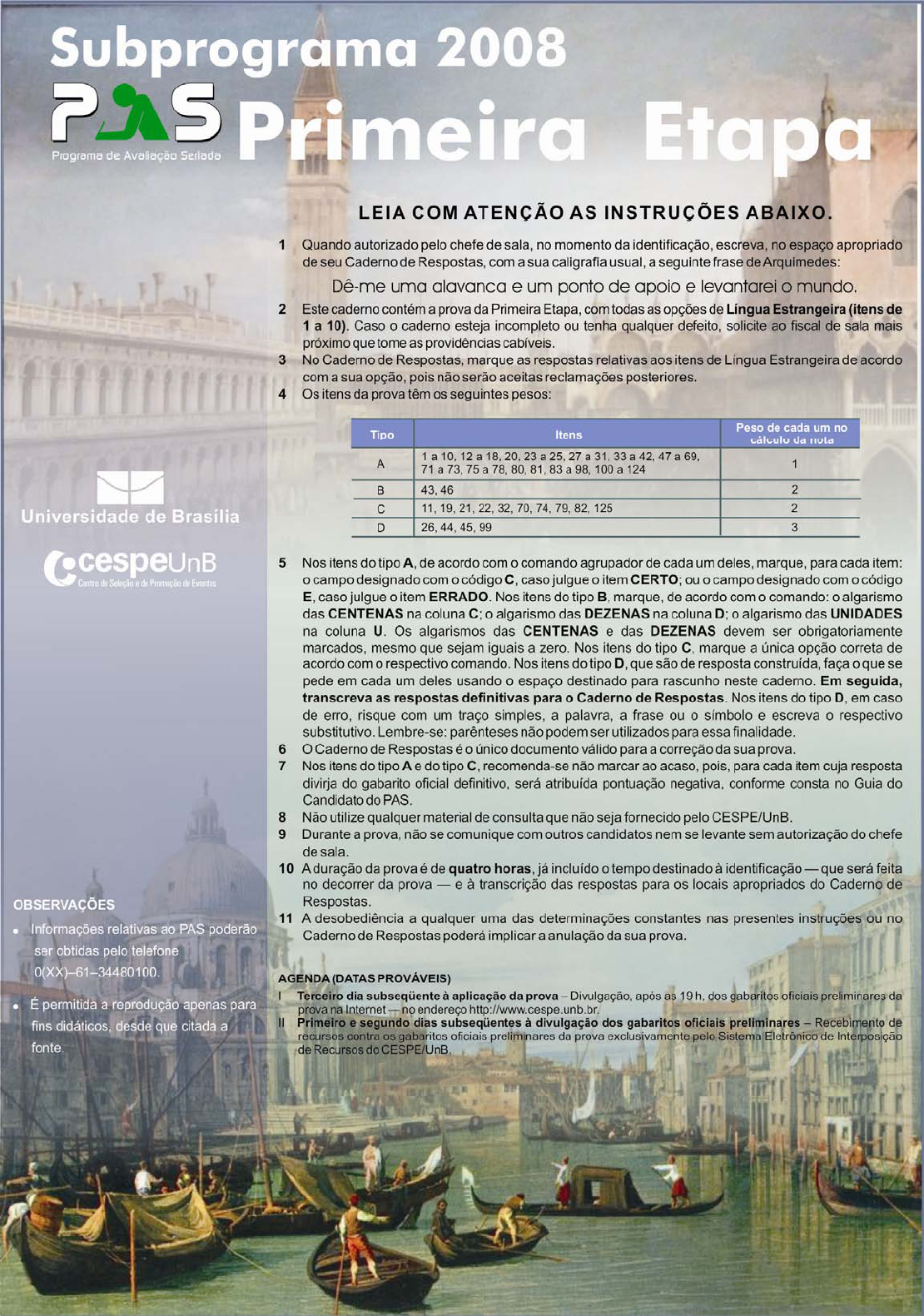 Subprograma 2008 – Primeira Etapa 1 PARTE I — LÍNGUA INGLESA Internet: <www.bancoimagenes.com> (adapted). Based on the picture and dialog above, judge the following items. 1 The conversation reflects contrast between the rural and the urban worlds. 2 The rural and the urban worlds are different, but they are mutually dependent and complement each other. 3 As shown in the text, with the evolution of technology, rural areas are expanding and urban space is shrinking. The GPS in agriculture Aided by a Global Positioning System (GPS) farmers can gather the necessary data to improve the use of land and of water. Farmers can also get other benefits such as making better use of fertilizers and other soil recovery treatments, and estimating costs for treating weeds and parasites while protecting, at the same time, the natural resources for future use. The precision of the GPS enables farmers to map their land with accurate measurements, to find roads and know the distance between points of interest, monitor the irrigation systems and planted areas which may be affected by diseases, enabling them to take prompt action and therefore avoid their spread, and it can lead them to the exact places in their fields, either to take soil samples or monitor the plantation. Internet: <agronotas.wordpress.com> (adapted). Based on the text above, it is correct to say that the GPS 4 predicts diseases on planted areas. 5 helps farmers to control their production expenses. 6 can help keep the balance of natural resources as well as use them wisely. harness yoke Oxford advanced learner’s dictionary, p. 570 and 1.487. Agricultural progress 1 4 7 10 13 16 19 22 Agriculture has developed over a long period of time, with positive effects on its production. Iron tools to work the land replaced those made of wood. This made the soil better prepared for planting because the iron tool could go deeper into the ground to turn over the soil. Draft animals, like horses, pulled farming tools and carried heavy loads with a harness on them made of straps, bands and other parts, which relieved the animals from the weight of the wooden yoke on their heads and eliminated the risk of suffocation. This made it possible to carry or pull heavier loads. Grain was the basis of the farm workers’ diet. They used to grind it in stone querns, or hand mills. Next came the waterwheel and the windmill. People could now grind large amounts of grain with very little human effort, turning grain into flour. Farmers learned that every three years the land must be allowed to have a rest period of one year. However, in certain regions, instead of allowing the land to have a rest period, farmers took advantage of such period to plant forage for cows and horses. This method helped to conserve and enrich the soil, giving farmers more possibilities of having more animals and natural fertilizers. Internet <www.kathrynhinds.com> (adapted). According to the text above, judge the items that follow. 7 The use of farming tools made of iron has no effect in the agricultural production. 8 In order to have good crops, observing the land’s rest period, farmers cannot plant in it for more than three years every ten years. 9 Even the land used for planting forage needs a rest period in order to enrich the soil. 10 The text presents at least two different techniques that can be used to turn grain into flour. In the city, there are lots of things to do. We have lots of places to go to and activities to choose from. In the country, we can find peace. Nobody disturbs us and we do not suffer from the evils of big cities. Everybody is happy here. Subprograma 2008 – Primeira Etapa 2 PARTE I — LÍNGUA FRANCESA Internet: <www.bancoimagenes.com> (adapté). D’après l’image et le texte ci-dessus, jugez les items suivants. 1 Le dialogue révèle le contraste entre le monde rural et le monde urbain. 2 Il est correct d’affirmer que les mondes rural et urbain sont différents, mais que chacun dépend de l’autre et le complète. 3 Le texte montre que le monde rural avec l’évolution des technologies, s’agrandit de plus en plus au détriment de l’espace urbain. L’utilisation du GPS dans la nouvelle agriculture Avec l’emploi du Système de Positionnement Global plus connu sous son sigle anglais de GPS, on peut réunir les informations nécessaires pour améliorer l’utilisation de la terre et de l’eau. Les agriculteurs peuvent obtenir d’autres avantages en recourant à des fertilisants et autres produits pour enrichir le sol, en déterminant le coût du traitement des parasites et des maladies et en protégeant en même temps les ressources naturelles. L’exactitude du GPS permet aux agriculteurs de faire des relevés topographiques de leurs champs avec des mesures précises, de localiser les routes et les distances entre les diverses zones d’activité, de surveiller les systèmes d’irrigation et de culture et d’intervenir partout en cas de besoin. Internet: <agronotas.wordpress.com> (traduit et adapté). On peut déduire du text que 4 le GPS peut prévoir les épidémies sur les plantations. 5 les agriculteurs avec le GPS peuvent mieux gérer les dépenses de leur productions. 6 le GPS peut aider à l’équilibre et au bon usage des ressources naturelles. collier d’épaules collier de cou Oxford advanced learner’s dictionary, p. 570 et 1.487 (adapté). Les progrès agricoles 1 4 7 10 13 Dans l’agriculture, on a réalisé beaucoup de progrès au cours du temps et on a amélioré la production. Les outils en fer pour labourer la terre ont remplacé les anciens outils en bois et le sol est mieux préparé. Les animaux de trait, comme les chevaux, grâce au collier d’épaules, travaillent plus vite qu’avec le collier de cou qui les étranglait et ils transportent plus de poids. Les moulins à vent et à eau permettent de moudre le grain plus efficacement. Les paysans ont appris que la terre doit rester en repos une année sur trois.