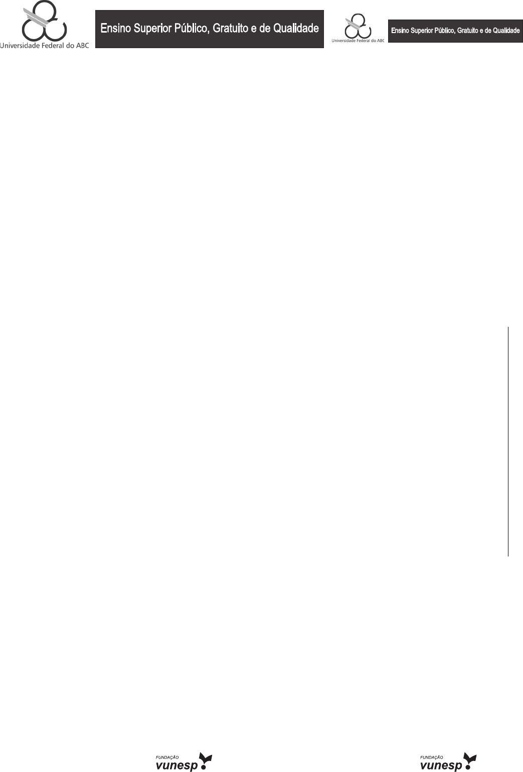 VESTIBULAR 2008/2009 2.ª FASE 07 DE DEZEMBRO DE 2008 3. Prova de Conhecimentos Específicos e Redação INSTRUÇÕES Para a realização desta prova, você recebeu este caderno contendo 16 questões dissertativas e 1 tema de redação e o caderno de redação. Confi ra seu nome e número da carteira impressos nas capas dos cadernos que você recebeu. Responda a todas as questões. A duração da prova é de 5 horas. Você só poderá entregar este caderno, o caderno de redação e sair da sala após transcorridas 2 horas do início da prova. Transcorridas 5 horas de prova, o fi scal recolherá este caderno e o ca- derno de redação dos candidatos que ainda permanecerem na sala. Ao sair, o candidato deverá entregar este caderno e o caderno de redação ao fi scal da sala. AGUARDE A ORDEM DO FISCAL PARA ABRIR ESTE CADERNO. VESTIBULAR 2008/2009 2.ª FASE 07 DE DEZEMBRO DE 2008 as si na tu ra d o ca nd id at o N om e do c an di da to N úm er o da c ar te ira NÃO ESCREVA NESTE ESPAÇO 2UABC0801/Dissertativa-07.12 3 UABC0801/Dissertativa-07.12 RESPOSTA NOTA FÍSICA 01. Na natureza, muitos animais conseguem guiar-se e até mesmo caçar com eficiência, devido à grande sensibilidade que apresen- tam para a detecção de ondas, tanto eletromagnéticas quanto mecânicas. O escorpião é um desses animais. O movimento de um besouro próximo a ele gera tanto pulsos mecânicos longitudinais quanto transversais na superfície da areia. Com suas oito patas espalhadas em forma de círculo, o escorpião intercepta primeiro os longitudinais, que são mais rápidos, e depois os transversais. A pata que primeiro detectar os pulsos determina a direção onde está o besouro. A seguir, o escorpião avalia o intervalo de tempo entre as duas recepções, e determina a distância d entre ele e o besouro. Considere que os pulsos longitudinais se propaguem com velocidade de 150 m/s, e os transversais com velocidade de 50 m/s. Se o intervalo de tempo entre o recebimento dos primeiros pulsos longitudinais e os primeiros transversais for de 0,006 s, determine a distância d entre o escorpião e o besouro. 4UABC0801/Dissertativa-07.12 RESPOSTA NOTA 02. Do ponto de entrada em uma curva fechada à direita até sua saída, o velocímetro de um carro indica um valor constante de 36 km/h. Considere que • a curva é plana, horizontal e circular com centro em C; • o raio da curva que o carro descreve é de 40 m; • a aceleração local da gravidade tem valor g = 10 m/s2. a) Reproduza o desenho apresentado, indicando as direções e sentidos dos vetores velocidade e aceleração, se julgar que existam, quando o carro se encontra no ponto indicado por P. b) Em seguida, determine o mínimo coeficiente de atrito estático entre os pneus e a pista, supondo que o carro consiga fazer a curva sem derrapar. 5 UABC0801/Dissertativa-07.12 RESPOSTA NOTA 03. Um pequeno motor tem, solidariamente associado a seu eixo, uma engrenagem de 2.10–2 m de raio. O motor gira com rotação constante de freqüência 5 r.p.m. Uma segunda engrenagem, em contato com a do motor, gira com período de rotação igual a 0,5 minuto. Nessa situação, determine: a) a velocidade escalar de um dente da engrenagem do motor; b) a relação entre as velocidades escalares de um dente da engrenagem do motor e um dente da segunda engrenagem; c) o raio da segunda engrenagem. (Se necessário, adote π = 3) 6UABC0801/Dissertativa-07.12 RESPOSTA NOTA 04. Um suporte para vasos é preso a uma parede vertical, como mostra a figura. Ele é fixo na parede por um parafuso colocado no ponto A e fica apenas apoiado na parede no ponto B, na mesma vertical de A. Um vaso de massa total 3 kg é pendurado no ponto C do suporte e o sistema é mantido em equilíbrio. Sabe-se que o ângulo entre AC e AB é reto e que a massa do suporte é desprezível. Adotando g = 10 m/s2, determine a intensidade da força com que o suporte comprime a parede no ponto B. 7 UABC0801/Dissertativa-07.12 RESPOSTA NOTA 05. Uma placa metálica de espessura desprezível tem um orifício circular e está encaixada horizontalmente num cone de madeira, como mostra a figura. À temperatura de 20 °C, a distância do plano que contém a placa ao vértice do cone é 20 cm. A placa é, então, aquecida a 100 °C e, devido à dilatação térmica, ela escorrega até uma nova posição, onde ainda continua horizontal. Sendo o coeficiente de dilatação linear do material da placa igual a 5 x 10–5 °C–1 e desconsiderando a dilatação do cone, determine, em cm, a nova distância D do plano que contém a placa, ao vértice do cone, a 100 °C. 8UABC0801/Dissertativa-07.12 RESPOSTA NOTA 06. Sobre uma mesa plana e horizontal, há uma folha de papel parada, na qual está escrita a palavra ÓPTICA. Vista a olho nu, a palavra é lida como mostrado a seguir. ÓPTICA Vista através de uma lupa, ela é lida primeiro como mostra a Figura 1 e, movimentando a lupa, ela passa a ser vista como mostra a Figura 2. Figura 1 Figura 2 a) Para a imagem vista na Figura 1 transformar-se naquela mostrada na Figura 2, a lupa teve de ser aproximada ou afastada da folha de papel? Justifique sua resposta. b) Considerando que na imagem vista na Figura 2 as letras apareçam 4 vezes maiores do que são na verdade, e que, nessa situa- ção, a lente esteja paralela à mesa e a 9 cm da folha, determine a distância focal da lente. Admita válidas as condições de nitidez de Gauss. 9 UABC0801/Dissertativa-07.12 RESPOSTA NOTA 07. No circuito elétrico, L1 e L2 são lâmpadas que possuem respectivamente resistências 10 Ω e 40 Ω. No centro do esquema encon- tra-se um gerador ideal de força eletromotriz 100 V, associado em série a um potenciômetro – resistor de resistência variável. Em série com a lâmpada de menor valor ôhmico, um fusível F de resistência desprezível limita o valor da corrente elétrica nessa lâmpada a 1 A. a) No momento em que o fusível estiver prestes a abrir o circuito elétrico que protege, qual deve 