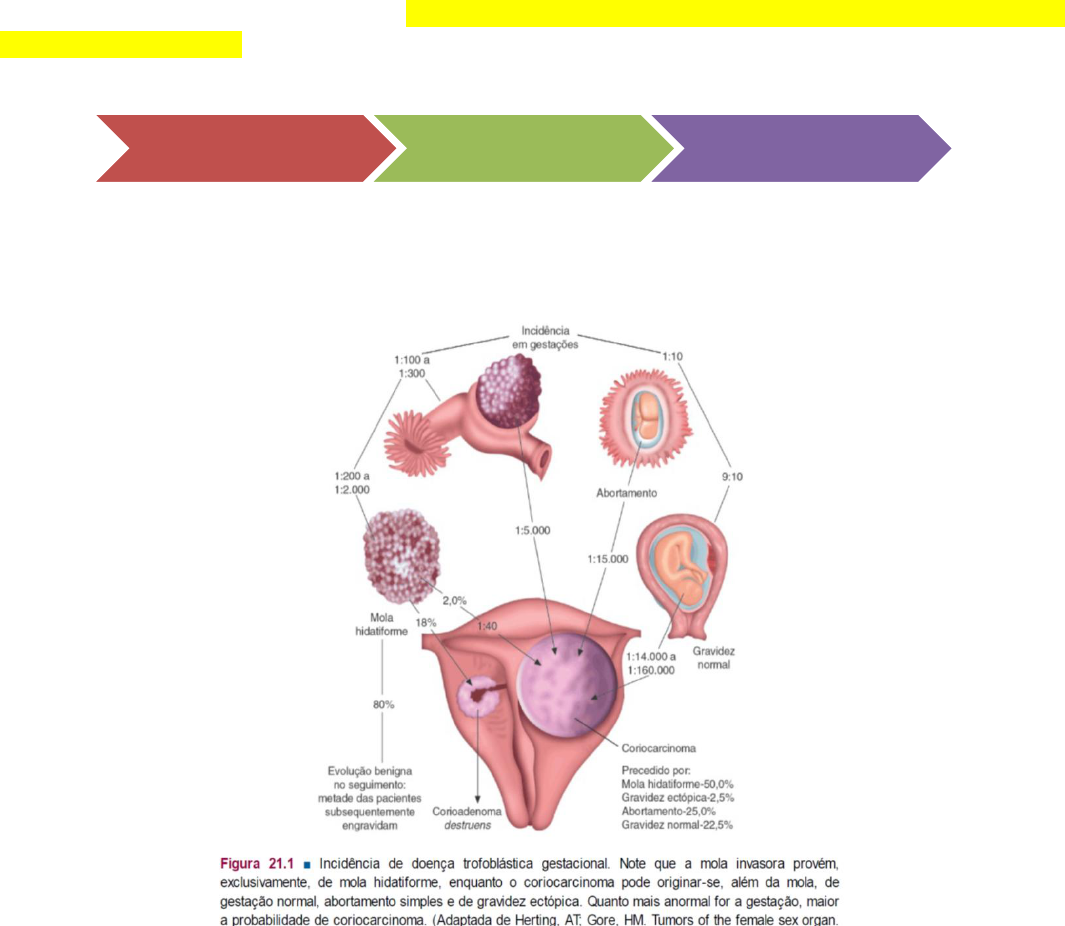 Obstetrícia fundamental (pdf) página 446. Rezendão 429, Williams 271. Doença trofoblástica gestacional A doença trofoblástica gestacional (DTG) é um termo abrangente para nomear os tumores do trofoblasto viloso placentário, que englobam as várias formas de mola hidatiforme, mola invasiva, coriocarcinoma, tumor trofoblástico do sítio placentário (PSTT). O evento patológico em comum está relacionado com fertilização aberrante, representado por formas clínicas distintas. Essas formas clínicas são blastomas originários do tecido de revestimento das vilosidades coriais (cito e sinciciotrofoblasto) caracterizados por aspectos degenerativos (hidropisia do estroma) e proliferativos (hiperplasia/anaplasia). O tumor trofoblástico do sítio placentário (PSTT – placental site trophoblastic tumor) é uma forma rara da doença, originária do trofoblasto intermediário. As formas malignas (mola invasora, coriocarcinoma e PSTT) são denominadas neoplasia trofoblástica gestacional (NTG) ou tumor trofoblástico gestacional (TTG). A neoplasia trofoblástica é um tumor funcionante produtor de gonadotrofina coriônica humana (hCG). No entanto, atualmente, na dependência da utilização rotineira dos testes de grande sensibilidade de hCG e do emprego eficaz da quimioterapia, pode-se dizer que, de todos os cânceres humanos, a neoplasia trofoblástica é a que apresenta maior taxa de cura. A doença trofoblástica gestacional divide-se em benigna e maligna Benigna: Mola hidatiforme (completa e incompleta) Maligna: Mola hidatiforme Epidemiologia: é difícil estabelecer a verdadeira incidência, os dados variam muito na literatura e também há dificuldade em coletar os dados. Muitos são ignorados. Alguns autores acreditam existir forte influência das idades extremas sobre a ocorrência da mola, sendo de 1,5 a 2x maior o risco na população jovem, e 5x maior entre mulheres acima de 35 anos, população de baixa renda. O uso de ACO, aborto anterior, fumo, deficiência de vitaminas, > idade paterna também aumentam risco. As molas determinam hemorragia indolor na 1ª metade da gestação. Ocorrência de degeneração das vilosidades coriônicas associadas à hiperplasia dos elementos trofoblásticos. Embora comumente as molas ocupem a cavidade uterina, ocasionalmente desenvolvem-se como gestações ectópicas. A mola pode ainda ser dividida em completa ou parcial, as quais constituem 2 doenças distintas, com características próprias citogenéticas, histológicas e clínicas, mas com tratamento similar. O grau de alterações teciduais e a ausência ou presença de um feto ou de elementos embrionários são utilizados para descrevê-las. Mola completa Macroscopicamente é possível identificar ausência de feto, cordão e membrana. Com vilosidades de tamanho anormal. Vesículas com líquido claro semelhantes a “cachos de uva”. Ausência de feto. Histopatologicamente: o trofoblasto – sincício e citotrofoblasto – mostra acentuada e sistemática hiperplasia com anaplasia celular. Pode-se encontrar vilosidades atróficas e hiperplasia trofoblástica discreta, edema do estroma viloso. Raramente podem-se encontrar capilares, sem hemácias fetais nucleadas, que se assemelham aos vasos existentes nas vilosidades de gestações iniciais, assim como acontece com o estroma se preservado, que se assemelha a um mesênquima imaturo. Citogenética: Cariótipo feminino: 46, XX. Ploidia: Sempre diploide. Origina-se de um equívoco da fertilização, em que o óvulo, por razões desconhecidas, perde sua carga genética haploide, “esvazia-se”, sendo fecundado por espermatozoide aparentemente normal (23,X). Ocorrendo duplicação posterior dos cromossomos paternos (androgênese), sem divisão celular. Assim, o zigoto possui um número normal, diploide de cromossomos, no entanto, com genoma homozigoto, obrigatoriamente 46, XX, uma vez que fertilização contendo Y resultaria em YY, não vital. Há uma rara exceção (5-10%) em que se apresenta uma composição masculina XY e isso se deve a uma fertilização de “óvulo vazio” por 2 espermatozoides, um contendo um X, outro contendo Y. O volume e a produção trofoblástica desse tipo de mola excede a parcial, o que reflete nas repercussões clínicas. Os títulos iniciais de hCG tendem a ser mais elevados, com aumento uterino além do esperado para a idade da gravidez em até 50% dos casos. Complicações médicas, por exemplo: pré-eclâmpsia, hipertireoidismo, anemia e hiperêmese gravídica são mais frequentes no tipo completo de mola. Aproximadamente 15 a 25% das pacientes com mola completa apresentam cistos tecaluteínicos, com aumento ovariano > 6 cm. Sequelas malignas ocorrem em cerca de 20% naquelas com mola completa. Cabe ressaltar que a evacuação molar mais precoce não diminui tal risco. 2,5% Podem se transformar em coriocarcinoma. Mola parcial Apresentam degeneração limitada da placenta, com vilosidades anormais e distendidas, hidrópicas. Existe FETO! a presença é caracterizada pelos ruídos cardíacos e certificada pela ultrassonografia. No entanto, o cariótipo é triploide, com par adicional de cromossomos de origem paterna. Macroscopicamente é frequente a presença de feto, cordão e membrana amniótica. Os vilos se encontram dilatados, mais acentuadamente ainda, se a gravidez se desenvolve até sua metade. Há vilosidades normais, com vasos. O feto é mal formado, os anexos (cordão e membrana) estão presentes e a placenta tem área normal entremeada com vilosidades. Histopatologicamente as vilosidades hidrópicas exibem hiperplasia moderada, sem anaplasia celular. Não costumam faltar fragmentos de membrana. Citogenética: predominam casos com anomalia cromossomial, incluindo trissomias, triploidias (69, XXX, XXY, XYY) e tetraploidias. De origem biparental O risco de doença trofoblástica persistente é muito menor após mola parcial, raramente sendo coriocarcinoma. Sequelas malignas em geral ocorrem em me