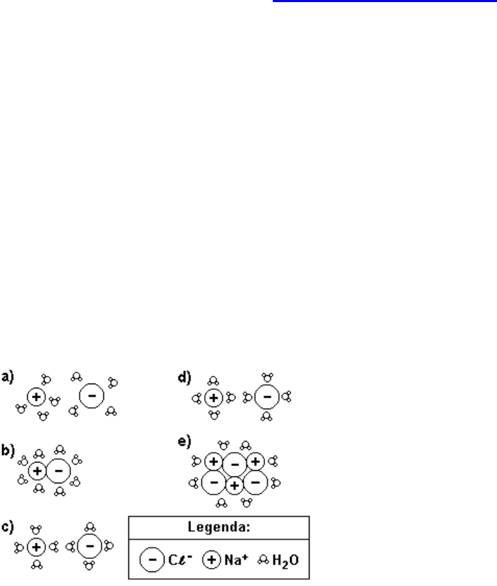 Vestibular1 – A melhor ajuda ao vestibulando na Internet Acesse Agora ! � HYPERLINK "http://www.vestibular1.com.br" ��www.vestibular1.com.br� Vestibular1 – A melhor ajuda ao vestibulando na Internet Acesse Agora ! � HYPERLINK "http://www.vestibular1.com.br" ��www.vestibular1.com.br� EXERCÍCIOS DE QUÍMICA CINÉTICA – TERMOQUÍMICA – SOLUÇÕES - PROP.COLIGATIVAS 1. (Enem) Ainda hoje, é muito comum as pessoas utilizarem vasilhames de barro (moringas ou potes de cerâmica não esmaltada) para conservar água a uma temperatura menor do que a do ambiente. Isso ocorre porque: a) o barro isola a água do ambiente, mantendo-a sempre a uma temperatura menor que a dele, como se fosse isopor. b) o barro tem poder de "gelar" a água pela sua composição química. Na reação, a água perde calor. c) o barro é poroso, permitindo que a água passe através dele. Parte dessa água evapora, tomando calor da moringa e do restante da água, que são assim resfriadas. d) o barro é poroso, permitindo que a água se deposite na parte de fora da moringa. A água de fora sempre está a uma temperatura maior que a de dentro. e) a moringa é uma espécie de geladeira natural, liberando substâncias higroscópicas que diminuem naturalmente a temperatura da água. 2. (Fuvest ) Entre as figuras abaixo, a que melhor representa a distribuição das partículas de soluto e de solvente, numa solução aquosa diluída de cloreto de sódio, é: TEXTO PARA A PRÓXIMA QUESTÃO (Enem ) No Brasil, mais de 66 milhões de pessoas beneficiam-se hoje do abastecimento de água fluoretada, medida que vem reduzindo, em cerca de 50%, a incidência de cáries. Ocorre, entretanto, que profissionais da saúde muitas vezes prescrevam flúor oral ou complexos vitamínicos com flúor para crianças ou gestantes, levando à ingestão exagerada da substância. O mesmo ocorre com o uso abusivo de algumas marcas de água mineral que contêm flúor. O excesso de flúor - fluorose - nos dentes pode ocasionar desde efeitos estáticos até defeitos estruturais graves. Foram registrados casos de fluorose tanto em cidades com água fluoretada pelos poderes públicos como em outras abastecidas por lençóis freáticos que naturalmente contêm flúor. (Adaptado da "Revista da Associação Paulista de Cirurgiões Dentistas" - APCD, vol. 53, n. 1, jan./fev. 1999.) 3. Determinada Estação trata cerca de 30.000 litros de água por segundo. Para evitar riscos de fluorose, a concentração máxima de fluoretos nessa água não deve exceder cerca de 1,5 miligrama por litro de água. A quantidade máxima dessa espécie química que pode ser utilizada com segurança, no volume de água tratada em uma hora, nessa Estação, é: a) 1,5 kg. b) 4,5 kg. c) 96 kg. d) 124 kg. e) 162 kg. 4. (Ita ) Num recipiente, mantido a 25°C, misturam-se 50mL de uma solução 5,0milimol/L de HCL 50mL de água destilada e 50mL de uma solução 5,0milimol/L de NaOH. A concentração de íons H+, em mol/L, na solução resultante é a) 1,3 × 10-11. b) 1,0 × 10-7. c) 0,8 × 10-3. d) 1,0 × 10-3. e) 3,3 × 10-3. 5. (Puc-rio 99) A tabela a seguir mostra a solubilidade de vários sais, a temperatura ambiente, em g/100ml: AgNO3 (nitrato de prata): 260 Al2(SO4)3 (sulfato de alumínio): 160 NaCl (cloreto de sódio): 36 KNO3 (nitrato de potássio): 52 KBr (brometo de potássio): 64 Se 25ml de uma solução saturada de um destes sais foram completamente evaporados, e o resíduo sólido pesou 13g, o sal é: a) AgNO3 b) Al2(SO4)3 c) NaCl d) KNO3 e) KBr 6. (Ita ) Um litro de uma solução aquosa contém 0,30mol de íons Na+, 0,28mol de íons Cl-, 0,10mol de íons SO4-2 e x mols de íons Fe3+. A concentração de íons Fe3+ (em mol/L) presentes nesta solução é a) 0,03 b) 0,06 c) 0,08 d) 0,18 e) 0,26 7. (Ufrrj 99) Misturando-se 100mL de solução aquosa 0,1 molar de KCl, com 100mL de solução aquosa 0,1 molar de MgCl2 , as concentrações de íons K+, Mg2+ e Cl - na solução resultante, serão, respectivamente, a) 0,05 M; 0,05 M e 0,1 M. b) 0,04 M; 0,04 M e 0,12 M. c) 0,05 M; 0,05 M e 0,2 M. d) 0,1 M; 0,15 M e 0,2 M. e) 0,05 M; 0,05 M e 0,1 5 M. 8. (Pucmg 99) 50 mL de uma amostra contendo ácido acético (CH3 COOH) foram diluídos com água e o volume completado para 250mL. Uma alíquota de 25mL dessa solução consumiu 25 mL de uma solução 0,1mol/L de NaOH para neutralizar o ácido. O teor de ácido acético da amostra é: a) 1,0 % b) 0,2 % c) 3,0 % d) 5,0 % e) 10,0 % 9. (Ufpe ) O gráfico abaixo representa a pressão de vapor (eixo das ordenadas), em atm, em função da temperatura (eixo das abcissas), em °C, de três amostras, I, II e III. Se uma destas amostras for de água pura e as outras duas de água salgada, podemos afirmar que: a) a amostra I é a amostra de água salgada. b) a amostra I é a mais volátil. c) a amostra II é mais concentrada que a amostra III. d) a amostra I é a menos volátil. e) na temperatura TIII, e 1 atm a amostra II ainda não entrou em ebulição. 10. (Pucmg ) Considere as seguintes soluções aquosas: X - 0,1mol/L de frutose (C 6H12O6) Y - 0,1mol/L de cloreto de sódio (NaCl) Z - 0,3mol/L de sulfato de potássio (K2SO4) W - 0,3mol/L de ácido clorídrico (HCl) Considerando as propriedades das soluções, assinale a afirmativa INCORRETA: a) Numa mesma pressão, a solução Z apresenta a maior temperatura de ebulição. b) A solução X é a que apresenta a maior pressão de vapor. c) A solução W apresenta uma temperatura de congelação maior que a solução Y. d) Todas apresentam uma temperatura de ebulição maior do que 100°C a 1 atm. 11. (Puccamp ) Comparando-se as seguintes soluções aquosas, à mesma temperatura e todas de IGUAL concentração em mol/L: I. glicose II. sacarose III. cloreto de sódio IV. cloreto de cálcio pode-se dizer que são isotônicas (exercem igual pressão osmótica) SOMENTE a) I e II b) I e III c) I e IV d) II e III e) III e IV 12. (Ita 99) Considere que sejam feitas as seguintes afirma