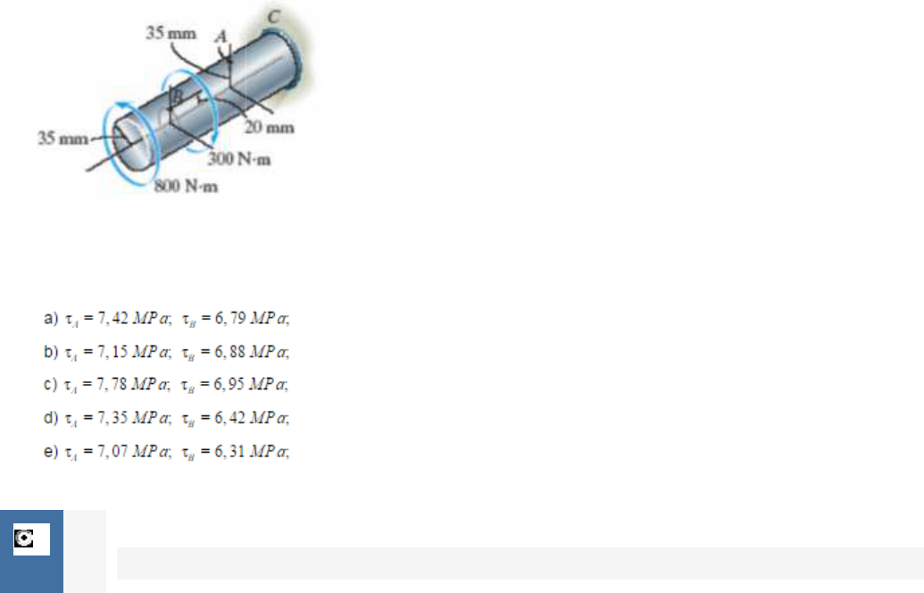 Questão 1/5 - Princípios O eixo maciço está preso ao suporte em de torção mostrados. Determine a tensão de cisalhamento nos pontos A e B. Analise as alternativas abaixo e marque a correta: Nota: 20.0 A "a" é a alternativa correta. Você acertou! Princípios de Mecânica e Resistência dos Materiais O eixo maciço está preso ao suporte em C e sujeito aos carregamentos de torção mostrados. Determine a tensão de cisalhamento nos pontos Analise as alternativas abaixo e marque a correta: "a" é a alternativa correta. de Mecânica e Resistência dos Materiais e sujeito aos carregamentos de torção mostrados. Determine a tensão de cisalhamento nos pontos B "b" é a alternativa correta. C "c" é a alternativa correta. D "d" é a alternativa correta. "b" é a alternativa correta. "c" é a alternativa correta. "d" é a alternativa correta. Questão 2/5 - Princípios A alavanca de controle é usada em um cortador de grama de empurrar. Determine a tensão de flexão máxima na seção a força de 100 N for aplicada ao cabo. A alavanca é supor em A e um cabo em B. A seção a Nota: 20.0 A B C D Você acertou! aula 6, tema 4 Princípios de Mecânica e Resistência dos Materiais A alavanca de controle é usada em um cortador de grama de empurrar. Determine a tensão de flexão máxima na seção a-a da alavanca se uma força de 100 N for aplicada ao cabo. A alavanca é suportada por um pino em A e um cabo em B. A seção a-a é quadrada, 6 mm por 6 mm. de Mecânica e Resistência dos Materiais A alavanca de controle é usada em um cortador de grama de empurrar. a da alavanca se uma tada por um pino a é quadrada, 6 mm por 6 mm. Questão 3/5 - Principios de Mecânica e Resistência dos Materiais Para estudar o comportamento de materiais sujeitos à fadiga, engenheiros fazem ensaios gerando dados que relacionam a tensão com o número de ciclos em diagramas chamados de tensão abaixo traz um diagrama diagrama, é correto afirmar: Nota: 20.0 A Em algum momento, tanto o aço quanto o alumínio chegarão à ruptura, se a tensão aplicada ao material for de 131 MPa; B Se a tensão aplicada ao material for de 150 MPa, é possíve forma segura, para Principios de Mecânica e Resistência dos Materiais Para estudar o comportamento de materiais sujeitos à fadiga, engenheiros fazem ensaios gerando dados que relacionam a tensão com o número de ciclos N até a falha. Esses dados são computados em diagramas chamados de tensão-ciclo, ou diagrama S-N abaixo traz um diagrama S-N para o aço e o alumínio. Observando este diagrama, é correto afirmar: Em algum momento, tanto o aço quanto o alumínio chegarão à ruptura, se a tensão aplicada ao material for de 131 MPa; Se a tensão aplicada ao material for de 150 MPa, é possível utilizar apenas o aço de forma segura, para 10.106 ciclos; Principios de Mecânica e Resistência dos Materiais Para estudar o comportamento de materiais sujeitos à fadiga, engenheiros fazem ensaios gerando dados que relacionam a tensão S até a falha. Esses dados são computados N. A figura para o aço e o alumínio. Observando este Em algum momento, tanto o aço quanto o alumínio chegarão à ruptura, se a tensão l utilizar apenas o aço de C Se a tensão aplicada ao material for de 150 MPa, uma estrutura de aço deverá ser utilizada para garantir que não haverá ruptura, independentemente do número de ciclos; Você acertou! SOLUÇÃO: Se a tensão aplicada ao material for de 150 Mpa, a estrutura de a aproximadamente do número de ciclos (vida infinita). D Se a tensão apli independentemente do número de ciclos ao qual a estrutura está sendo projetada; Questão 4/5 - Princípios Nota: 20.0 A P = 15,8 kN B P = 11,3 kN Você acertou! Aula 4, tema 3 Se a tensão aplicada ao material for de 150 MPa, uma estrutura de aço deverá ser utilizada para garantir que não haverá ruptura, independentemente do número de ciclos; Se a tensão aplicada ao material for de 150 Mpa, a estrutura de alumínio chegará à ruptura em aproximadamente 90.106ciclos. A estrutura de aço pode suportar esta carga independentemente do número de ciclos (vida infinita). Se a tensão aplicada ao material for de 200 MPa, é preferível utilizar um material de aço, independentemente do número de ciclos ao qual a estrutura está sendo projetada; Princípios de Mecânica e Resistência dos Materiais Se a tensão aplicada ao material for de 150 MPa, uma estrutura de aço deverá ser utilizada para garantir que não haverá ruptura, independentemente do número de ciclos; lumínio chegará à ruptura em 90.106ciclos. A estrutura de aço pode suportar esta carga independentemente cada ao material for de 200 MPa, é preferível utilizar um material de aço, independentemente do número de ciclos ao qual a estrutura está sendo projetada; de Mecânica e Resistência dos Materiais C P = 176,7 kN D P = 238,8 kN Questão 5/5 - Princípios O tubo é submetido a um torque de 750 N.m. Determine a parcela desse torque à qual a seção sombreada cinze resiste. O tubo é vazado, com raio externo de 100 mm e raio interno de 25 mm. Nota: 20.0 A T’=0,515 kN.m; Você acertou! Princípios de Mecânica e Resistência dos Materiais O tubo é submetido a um torque de 750 N.m. Determine a parcela desse torque à qual a seção sombreada cinze resiste. O tubo é vazado, externo de 100 mm e raio interno de 25 mm. T’=0,515 kN.m; de Mecânica e Resistência dos Materiais O tubo é submetido a um torque de 750 N.m. Determine a parcela desse torque à qual a seção sombreada cinze resiste. O tubo é vazado, B T’=0,437 kN.m; C T’=0,625 kN.m; D T’=0,718 kN.m; T’=0,437 kN.m; T’=0,625 kN.m; T’=0,718 kN.m;