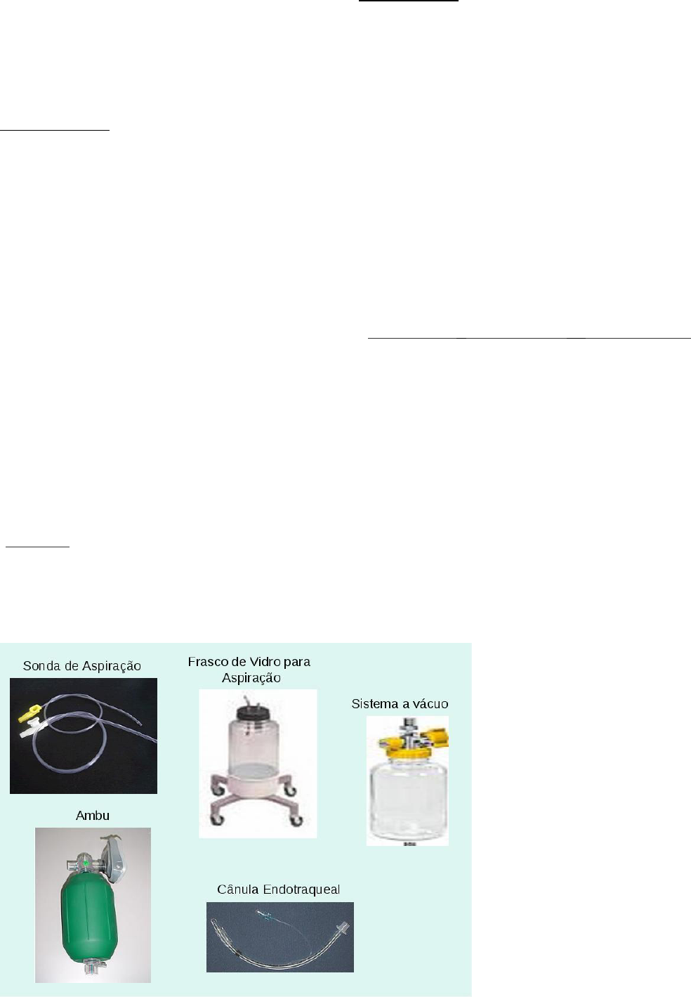 Monitoria Fisioterapia Respiratória Conteúdo: ASPIRAÇÃO *A aspiração traqueal é realizada com objetivo de manter as vias aéreas do paciente, intubado ou traqueostomizado, permeáveis e livres de secreções. Permite uma melhor ventilação, oxigenação e prevenção de complicações. INDICAÇÕES: Presença de sons adventícios (roncos) á ausculta; Aumento de pico de pressão no ventilador; Movimento audível ou visível de secreções; Declínio da saturação de oxigênio; Os três tipos de aspiração de vias aéreas são: Orotraqueal, Nasotraqueal e Endotraqueal. Sistema de aspiração Aberto O sistema aberto é a forma mais comum e conhecida de aspiração endotraqueal; este método necessita da desconexão do paciente da ventilação mecânica, para realização do procedimento de aspiração de forma asséptica, com a introdução de uma sonda de aspiração estéril a qual irá sugar as secreções acumuladas. -Material: *Aspirador montado com frasco redutor, coletor de secreções e extensões; Frasco com água destilada (AD) ou soro fisiológico; Ressuscitador manual (AMBU); Luvas estéreis; Sonda de aspiração; Máscara; Óculos, avental; Estetoscópio. Sistema de aspiração fechado O sistema fechado de aspiração, envolve a utilização de um cateter de múltiplo uso que fica instalado entre o tubo endotraqueal e o circuito do ventilador mecânico, isto faz com que seja suprimido o risco associado com a desconexão do paciente ao ventilador mecânico para a aspiração. O produto consta de um sonda de aspiração traqueal que é inserida numa manga plástica e conectada diretamente ao paciente, de maneira que ele pode ser aspirado seguidamente sem necessidade de interrupção da ventilação mecânica e sem abertura do sistema para o ambiente.