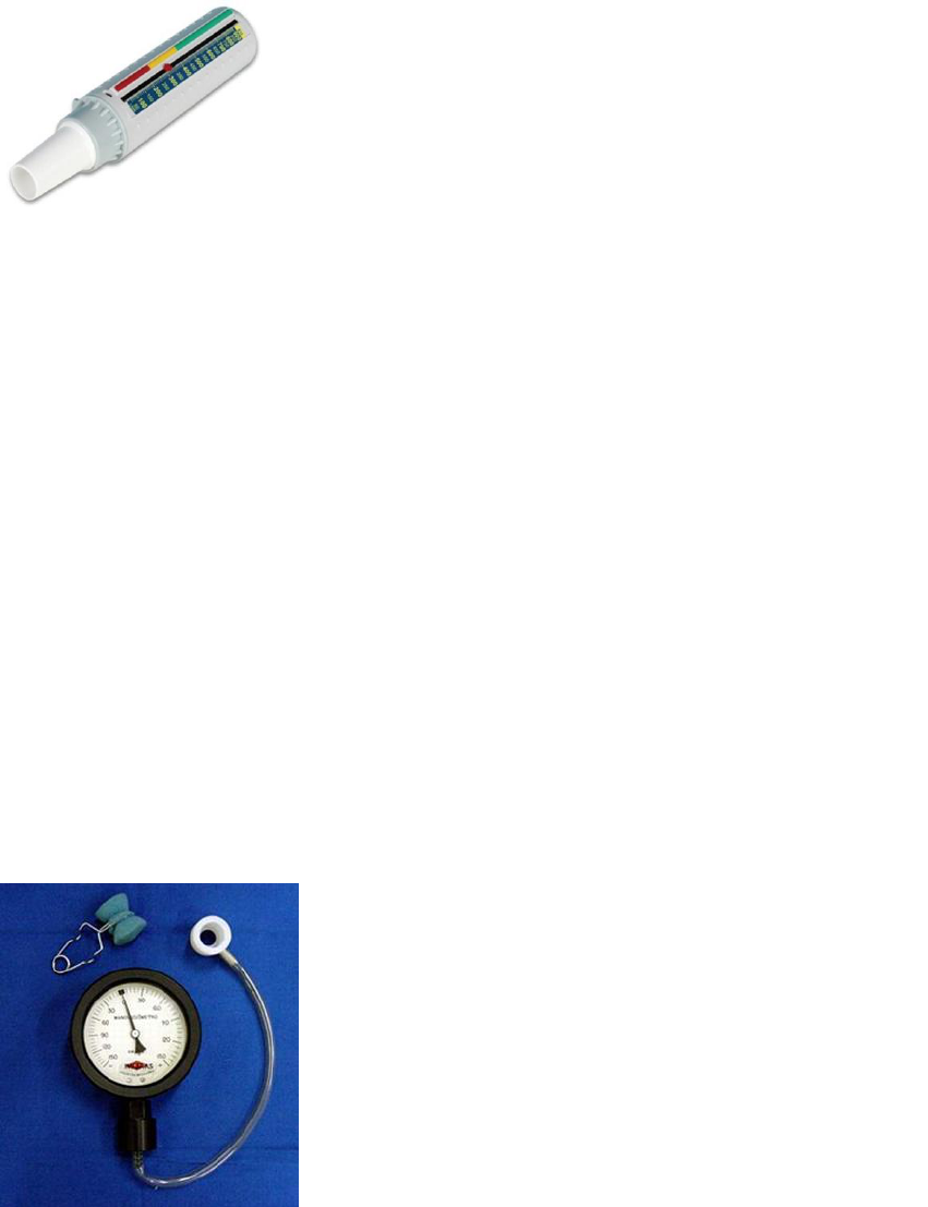 Peak Flow: Velocidade da expiração medindo a eficácia da função pulmonar. Avalia o fluxo expiratório máximo do paciente durante uma expiração forçada realizada após um inspiração máxima; Avalia o grau de obstrução das vias aéreas; Avaliar a capacidade de resposta ao broncodilatador; Avaliar se a tosse do paciente é eficaz, através da leitura do PFT (pico de fluxo da tosse). Pedir ao paciente para inspirar profundamente e, em seqüência, realizar uma expiração, no aparelho, de forma mais rápida e forte possível; O pico fluxo expiratório máximo é mensurado em L/min; Tres manobras consecutivas, valor mais alto. Comparando os resultados, vamos selecionar o maior dos três e compará-lo ao índice normal do Peak Flow (considera altura e sexo do paciente). Ausência de obstrução: iguais ou superiores a 80% do valor da tabela (preditivo). Manuvacuômetro: Mede a força dos músculos da respiração. Avalia as pressões máximas A) Como realizar a avaliação da PiMAX: Paciente sentado a 90° com os pés apoiados no chão; Colocar o bocal e a pinça (clip) nasal; Solicitar uma expiração ate nível de Volume Residual (VR) após fechar imediatamente o orifício de oclusão e solicitar uma inspiração até a capacidade pulmonar total (CPT), permanecendo por 2 segundos de força sustentada B) Equação para o calculo da Pimáx em função da idade e sexo: Homens de 20 a 80 anos: -1,24 × idade + 232,37 Mulheres de 20 a 80 anos: -0,46 × idade + 74,25 Pressão inspiratória máxima (Pimax): negativa. VR ou CRF; manter ins de 1 a 3 s; repetir 3 a 5 x; Anotar a mais negativa. C) Como realizar a avaliação da Pemáx: Paciente sentado a 90° com os pés apoiados no chão; Colocar o bocal e a pinça (clip) nasal; Solicitar uma inspiração ate o nível de CPT; Em seguida fechar imediatamente o orifício de oclusão e solicitae uma expiração a nível de Volume Residual (VR), com sustentação de 2 segundos D) Equação para o calculo da Pemáx em função da idade e sexo: Homens de 20 a 80 anos: -1,26 × idade + 183,31 Mulheres de 20 a 80anos: -0,68 × idade + 119,35 Pressão expiratória máxima (Pemax): positiva CPT (inspire profundo); expire profundo e mantenha. Ventilometro: Tem como objetivo mensurar os valores ventilatórios próprios do paciente. Volume corrente. Objetivos: Avaliar VM ou VVM (volume minuto); FR (frequencia respiratória); VE (volume expirado); CAPACIDADE VITAL LENTA; Avaliar índice de Tobin; a média de VC (volume corrente); o desmame da ventilação mecânic.a Paciente, preferencialmente, sentado e em posição confortável; Acoplar o ventilômetro à boca ou cânula (TQT, TOT), e: CÁLCULO DO VM E FR: solicitaR uma respiração normal e tranquila por um minuto e, verificar através da observação direta dos movimentos torácicos associda a utilização de um cronômetro. CÁLCULO DO VC: utilizar a equação: VC = VM/FR CÁLCULO DA CVL: realizar uma inspiração máxima e, em seguida, expirar lentamente através do ventilômetro, sem fazer esforço, até a capacidade residual. FÓRMULA PREDITIVA PARA CAPACIDADE VITAL: HOMENS: CV= 0,05211-0,22 x A- 3,60 x H MULHERES: CV= 0,4111- 0,018 x A – 2,69 x H ONDE: CV: capacidade vital; H: altura; A: idade em anos CÁLCULO ÍNDICE DE TOBIN (INDICE DE RESPIRAÇÃO SUPERFICIAL): FR/VC. VALORES: VC: 05 a 08 ml/kg; VM: 05 a 06 L/min; FR: 12 a 20 ipm; CVL: em média 65 a 75 mL/Kg ÍNDICE DE TOBIN: < 50 litros Oxímetro: Mede a quantidade de hemoglobina ligadas ao O2. Saturação periférica de oxigênio e BPM (batimentos por minuto) ou seja, a frequência cardíaca. O monitor exibe a porcentagem de hemoglobina arterial (metaloproteína que contém ferro presente nos glóbulos vermelhos (eritrócitos) e que permite o transporte de oxigênio pelo sistema circulatório) na configuração de oxiemoglobina. Taxas normais são da ordem de 95 a 100%.