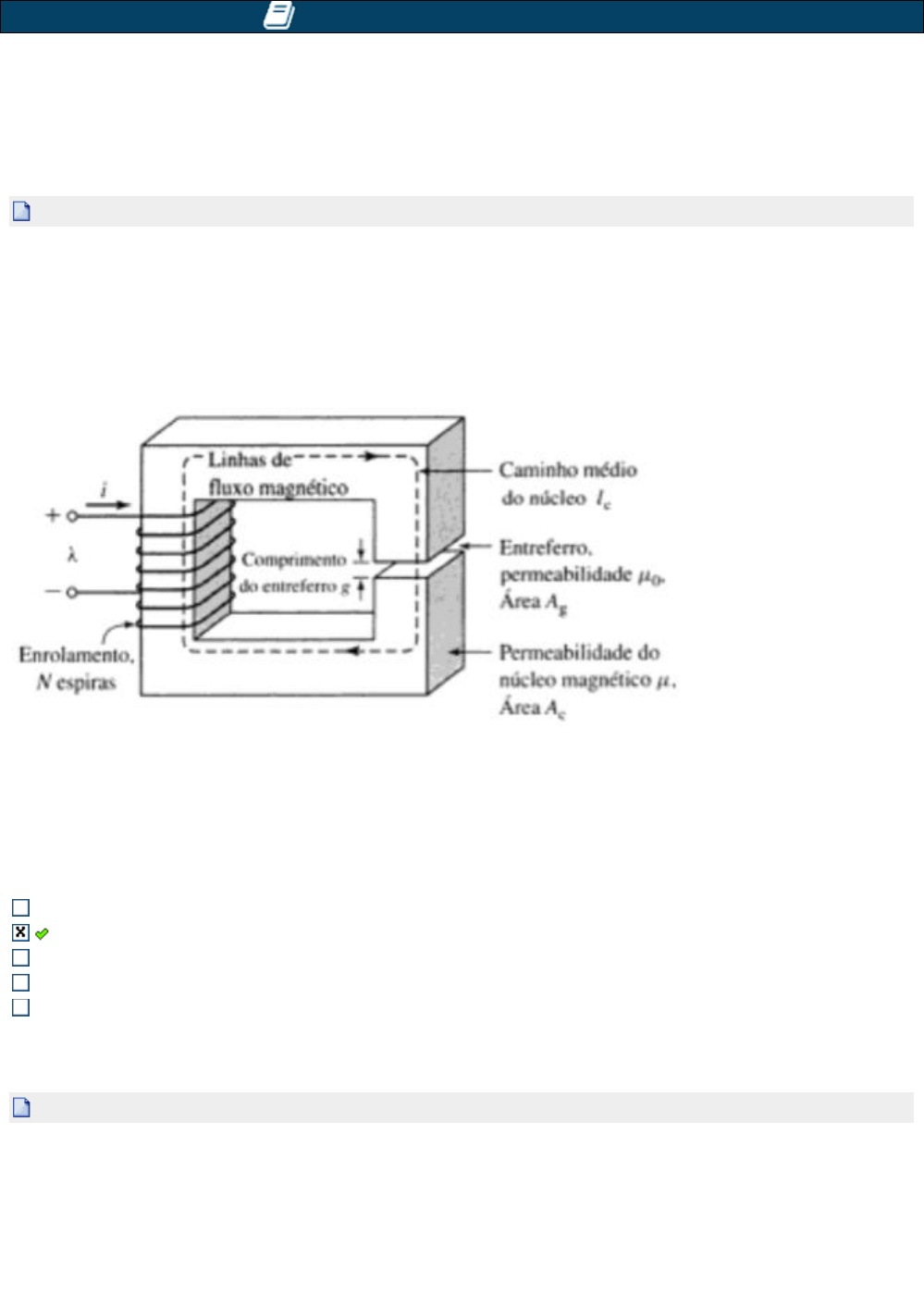 CONVERSÃO ELETROMECÂNICA DE ENERGIA I Avaliando Aprend.: CCE0146_SM_201603305351 V.1 Aluno(a): Matrícula: Desemp.: 0,4 de 0,5 02/10/2018 05:36:43 (Finalizada) 1a Questão (Ref.:201604222977) Pontos: 0,1 / 0,1 O circuito magnético da figura abaixo, apresenta dimensões: Ac=Ag= 9cm2 (área da seção), g=0,050 cm (entreferro), lc = 30 cm (caminho médio do núcleo), N = 500 espiras e relutância total = 4,46 x 105 Ae/Wb (relutância do núcleo + relutância do entreferro). Encontre: (i) A indutância L para Bc = 1 T; (j) A energia armazenada W, quando Bc = 0,8 T. Marque a alternativa que apresenta os valores aproximados da indutância L e energia armazenada W, respectivamente: (i) 0,74 H ; (j) 0, 115 J (i) 0,56 H ; (j) 0,115 J (i) 5,6 H ; (j) 1,8 J (i) 5,6 H ; (j) 1,15 J (i) 0,56 H ; (j) 0,45 J 2a Questão (Ref.:201604222991) Pontos: 0,1 / 0,1 Um circuito magnético composto de chapas de aço-silício tem o formato quadrado indicado na figura abaixo. (i) Calcule a força magnetomotriz, fmm, necessária para produzir um fluxo no núcleo de 25 x 10-4 Wb. (j) Se a bobina tem 80 espiras, qual o valor da corrente que deve circular através da bobina? Marque a alternativa que apresenta os valores aproximados da força magnetomotriz e da corrente, respectivamente. (i) fmm = 98 Ae; (j) i = 3,5 A (i) fmm = 98 Ae; (j) i = 1,225 A (i) fmm = 66 Ae; (j) i = 1,225 A (i) fmm = 0,98 Ae; (j) i = 0,01225 A (i) fmm = 77 Ae; (j) i = 2,5 A 3a Questão (Ref.:201604238350) Pontos: 0,0 / 0,1 Um circuito magnético com um único entreferro está mostrado na figura abaixo. As dimensões do núcleo são: Área da seção reta Ac = 1,8 x 10-3 m2 ; Comprimento médio do núcleo lc = 0,6 m; Comprimento do entreferro g = 2,3 x 10-3 m; N = 83 espiras; A corrente que circula pela bobina: I = 1,5 A. Supondo que o núcleo tenha permeabilidade de µ = 2500 µo e desprezar o espraiamento no entreferro. Calcule a indutância L da bobina. Dado: µo = 4π x 10-7 H/m. L = 4,4 mH L = 61,3 mH L = 7,47 mH L = 6,13 mH L = 74,7 mH 4a Questão (Ref.:201604198405) Pontos: 0,1 / 0,1 Um transformador possui 2000 espiras no lado AT e 200 espiras no lado BT. Quando ligado como abaixador a corrente de carga é 30 A e como elevador é 2A. Calcular para os dois casos: a) a relação de transformação; b) a componente de carga da corrente primária. a) 10 e 0,1; b) 3A e 20A. a) 20 e 0,1; b) 5A e 20A. a) 10 e 0,5; b) 3A e 30A. a) 25 e 0,5; b) 4A e 40A. a) 10 e 0,1; b) 2A e 40A. 5a Questão (Ref.:201603487760) Pontos: 0,1 / 0,1 Campo Magnético é a região ao redor de um imã, na qual ocorre um efeito magnético. Esse efeito é percebido pela ação de uma Força Magnética de atração ou de repulsão. O campo magnético pode ser definido pela medida da força que o campo exerce sobre o movimento das partículas de carga, tal como um elétron. A representação visual do Campo Magnético é feita através de: Lacunas magnéticas, que estão fortemente cercadas por cargas positivas e negativas. Linhas de campo magnético, também conhecidas por linhas de indução magnética. Planos inclinados, onde estão representadas as forças de atração e repulsão. Micro esferas alinhadas no sentido oposto da corrente elétrica. Pontos suspensos, que estão eqüidistantes e estacionados no espaço. CONVERSÃO ELETROMECÂNICA DE ENERGIA I Avaliando Aprend.: CCE0146_SM_201603305351 V.1 Aluno(a): Matrícula: Desemp.: 0,2 de 0,5 18/10/2018 22:39:59 (Finalizada) 1a Questão (Ref.:201604238345) Pontos: 0,0 / 0,1 Um circuito magnético com um único entreferro está mostrado na figura abaixo. As dimensões do núcleo são: Área da seção reta Ac = 1,8 x 10-3 m2 ; Comprimento médio do núcleo lc = 0,6 m; Comprimento do entreferro g = 2,3 x 10-3 m; N = 83 espiras; A corrente que circula pela bobina: I = 1,5 A. Supondo que o núcleo tenha permeabilidade de µ = 2500 µo e desprezar o espraiamento no entreferro. Calcule a relutância do núcleo Rc e a do entreferro Rg. Dado: µo = 4π x 10-7 H/m. Rc = 10,6 x 105 Ae/Wb e Rg = 101,68 x 105 Ae/Wb Rc = 1,06 x 105 Ae/Wb e Rg = 10,168 x 105 Ae/Wb Rc = 10,168 x 105 Ae/Wb e Rg = 1,06 x 105 Ae/Wb Rc = 10,6 x 105 Ae/Wb e Rg = 81,7 x 105 Ae/Wb Rc = 1,06 x 105 Ae/Wb e Rg = 8,17 x 105 Ae/Wb 2a Questão (Ref.:201604018860) Pontos: 0,1 / 0,1 Um transformador para lâmpada dicróica reduz a tensão de 127 V para 12 V. Se houver 25 espiras no secundário, qual o número de espiras no primário e a relação de espiras? 265 275 280 260 268 3a Questão (Ref.:201604198405) Pontos: 0,1 / 0,1 Um transformador possui 2000 espiras no lado AT e 200 espiras no lado BT. Quando ligado como abaixador a corrente de carga é 30 A e como elevador é 2A. Calcular para os dois casos: a) a relação de transformação; b) a componente de carga da corrente primária. a) 20 e 0,1; b) 5A e 20A. a) 10 e 0,1; b) 2A e 40A. a) 10 e 0,1; b) 3A e 20A. a) 10 e 0,5; b) 3A e 30A. a) 25 e 0,5; b) 4A e 40A. 4a Questão (Ref.:201604348394) Pontos: 0,0 / 0,1 O transformador é um equipamento fundamental para as instalações elétricas. A respeito de um transformador é correto afirmar: O valor das perdas em vazio pode ser obtido por meio do ensaio em curto-circuito A tensão no primário do transformador é sempre constante, independentemente da carga ligada ao secundário. Para minimizar as perdas no transformador é preciso projetá-lo de modo que as perdas em vazio sejam iguais às perdas ôhmicas nos enrolamentos primários e secundários. A tensão no secundário em vazio e em carga é sempre igual O rendimento do transformador independe da carga ligada ao secundário 5a Questão (Ref.:201604018840) Pontos: 0,0 / 0,1 Considere um transformador de 100/300 V, com 300 espiras no enrolamento primário. a) Indique as tensões no primário e do secundário b) Calcule a relação de transformação c) Calcule o número de espiras no secundário 200 100 500 100, 300, 900 150 250 800 100 300 700 100, 250 , 400 CONVERSÃO ELETROMECÂNICA DE ENERGIA I Avaliando 