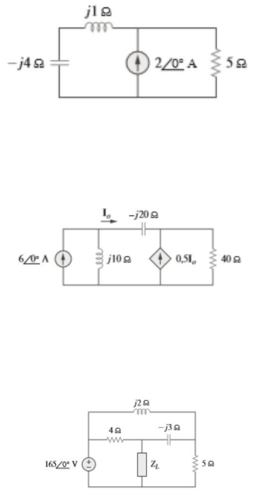 Lista de Exercícios de Circuitos Elétricos - 3º Bi Aula 12 – Análise de potência CA 1. Dado o circuito da Figura, determine a potência média fornecida ou absorvida por elemento. R: 2,647 W 2. No circuito da Figura, determine a potência média absorvida pelo resistor de 40. R: 43,78 W 3. Para o circuito da Figura , determine a impedância Z da carga para a transferência de potência máxima (para Z). Calcule a potência máxima absorvida pela carga. R: ZL=823,3 +j864,2 mΩ e P=4,228mW 4. Determine o valor RMS das ondas abaixo. a) R: 2,5 A b) R: 5 V 5. Obtenha o fator de potência para cada um dos circuitos da Figura abaixo. Especifique se cada fator de potência está adiantado ou atrasado. R:(a)0,55(b)0,93 6. Uma fonte de 110 V RMS, 60 Hz é aplicada a uma impedância de carga Z. A potência aparente entrando na carga é de 120 VA com um fator de potência 0,707 atrasado. (a) Calcule a potência complexa. (b) Determine a corrente RMS fornecida para a carga. (c) Determine Z. (d) Supondo que Z = R + j𝜔L, determine os valores de R e L. R: a)84,84+j84,84 VA b) 1,091 mA c)71,2+j71,2 d)R=71,2 L=189,1 mH 7. Determine a potência complexa liberada por Vs para o circuito da Figura. Seja Vs = 100 cos 2.000𝜔t V. R= 138,2 -j55,82 VA 8. Para o circuito inteiro abaixo, calcule: (a) O fator de potência. (b) A potência média liberada pela fonte. (c) A potência reativa. (d) A potência aparente. (e) A potência complexa. R:a)0.99 b) 31,12 W c)2,932 VAR d)31,26 VA e)31,12+j2,932 VA