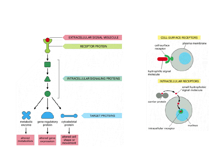 Rota de sinalização intracelular simples, ativada por uma molécula sinalizadora extracelular e sua ligação ao receptor. Formas de sinalização intercelular DEPENDENTE DE CONTATO PARÁCRINA SINÁPTICA ENDÓCRINA (C) PARÁCRINA (D) SINALIZAÇÃO VIA GAP JUNCTION Uma célula animal depende de sinais extracelulares múltiplos. SOBREVIVE DIVIDE DIFERENCIA MORRE Sistema endócrino Ver arquivo sistema endócrino Sistema de cascata hormonalLocalização de receptores hormonais Receptores nucleares e suas moléculas sinalizadoras. Respostas induzidas pela ativação de um receptor hormonal nuclear. RESPOSTA RPIMÁRIA PRECOCE AO HORMÔNIO ESTERÓIDE RESPOSTA SECUNDÁRIA TARDIA AO HORMÔNIO ESTERÓIDE Receptores de superfície celular. A. Receptores associados a canais iônicos B. Receptores associados a proteína G C. Receptores associados a enzimas Mecanismo de ação de tipos de proteínas de sinalização intracelular ao longa da rota de sinalização desde o receptor de superfície até o núcleo. Proteínas de sinalização intracelular 1. Proteínas transmissoras - propagam a mensagem ao próximo componente da cascata. 2. Proteínas mensageiras – carregam o sinal de uma parte da célula a outra. 3. Proteínas adaptadoras – conectam proteínas sinalizadoras. 4. Proteínas amplificadoras – intensificam o sinal recebido por meio da produção de grande quantidade de mediadores intracelulares. 5. Proteínas transdutoras – alteram a forma do sinal. 6. Proteínas de bifurcação – propagam o sinal de uma rota para outra. 7. Proteínas integradoras – recebem sinais de uma ou mais rotas sinalizadoras. 8. Proteínas reguladoras de genes latentes – são ativadas na superfície celular por receptores ativos e migram para o núcleo onde estimulam a transcrição gênica. Tipos de proteína de sinalização intracelular. Receptores associados a proteína G e seu mecanismo de ação. Ativação da proteína quinase A Regulação da transcrição gênica via AMP-c. A ligação de um sinal extracelular ao receptor associado a proteína G ativa a adenilato ciclase produzindo AMP-c. O que resulta na ativação da PKA no citosol. As subunidades catalíticas vão para o núcleo e fosforila a proteína de ligação ao CRE (CREB). Este liga-se ao co-ativador a proteína de ligação ao CREB (CBP), que estimula a transcrição gênica. Sinalização hormonal através do sistema Fosfatidilinositol Modelo de regulação da atividade da guanilato ciclase após ligação do Fator Natriurético Atrial A insulina liga-se ao receptor e leva a autofosforilação da subunidade e a fosforilação de resíduos de tirosina no substrato para o receptor de insulina (IRS). O IRS fosforila o domínio SH2 da SHP2, uma tirosina fosfatase e o domínio SH3 da molécula adaptadora GRB2. A GRB2 ativada recruta SOS1 que por sua vez ativa a proteína Ras que altera a transcrição gênica e participa ativamente de mecanismos de proliferação e diferenciação celular promovidos pela insulina. OIRS também ativa fosfoinositídeo 3 quinase (PI3K) que aumenta a concentração intracelular de PIP3 e PIP. Este ativam uma proteína quinase B que entre os seus papéis tem a capacidade de promover a liberação de GLUT4 de vesículas citoplasmática para a membrana promovendo a captação de glicose. Ação da insulina sobre o receptor de tirosina quinase. Calmodulina e a ativação de CAM-quinase II . Estrutura da Calmodulina Ativação de CAM-quinase II Mecanismos pelo quais as células-alvo tornam-se dessensibilizadas . SEQÜESTRO DO RECEPTOR DOWN-REGULATION DO RECEPTOR INATIVAÇÃO DO RECEPTOR INATIVAÇÃO DA PROTEÍNA SINAL PRODUÇÃO DE INIBIDORES Diferentes respostas induzidas pela liberação do neurotransmissor acetilcolina. O óxido nítrico sinaliza através de sua ligação direta a uma enzima intracelular . A acetilcolina atua indiretamente, induzindo a produção de NO pelas células endoteliais que age sobre as células musculares lixas relaxando-a, o que aumenta o fluxo sangüíneo através do vaso.