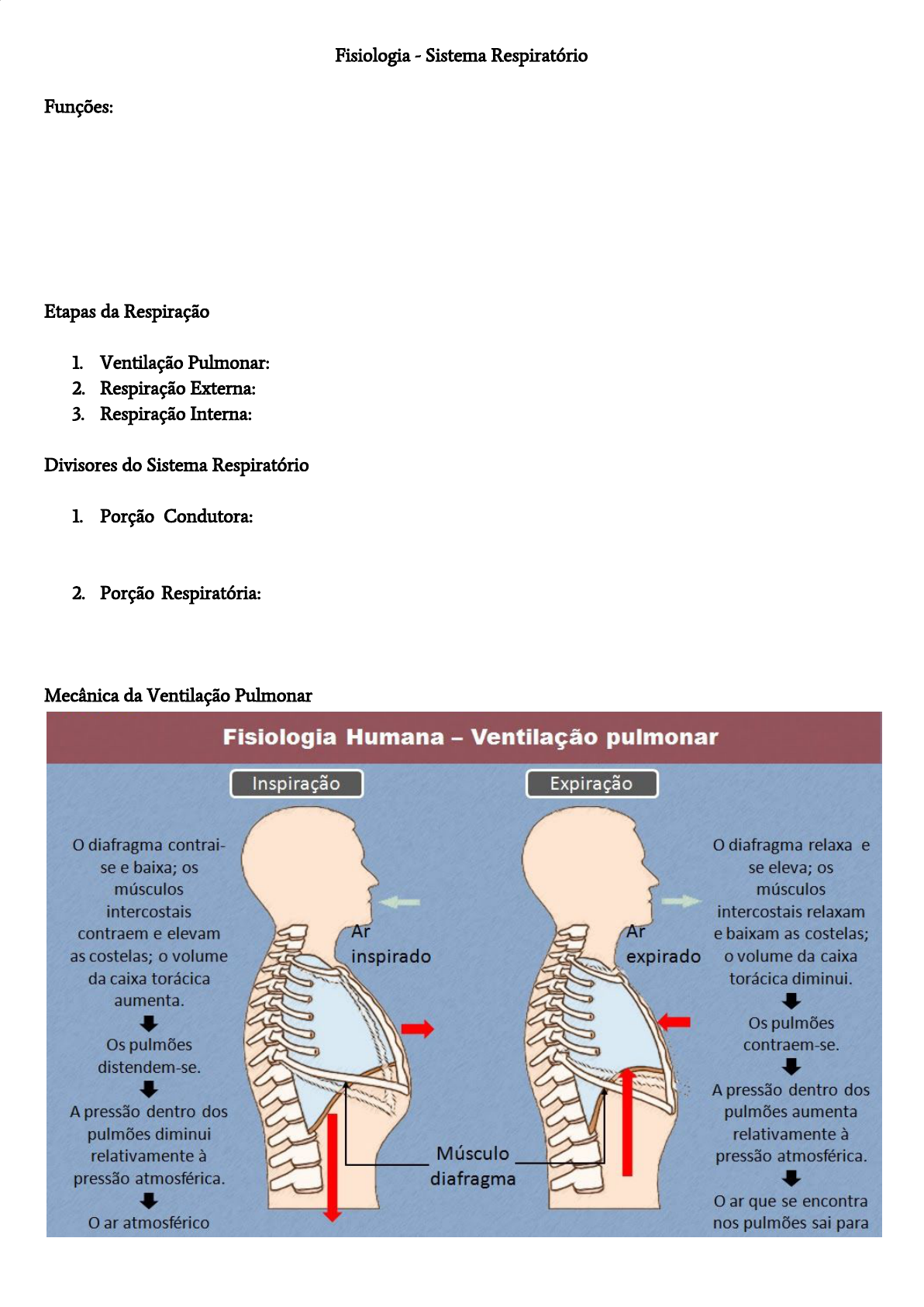 Fisiologia - Sistema RespiratórioFisiologia - Sistema Respiratório Funções:Funções: ● Fornecer oxigênio aos tecidos e remover o gás carbônico do corpo; ● Regular o pH sanguíneo pela redução do ácido carbônico no sangue; ● Filtração do ar inspirado pela cavidade nasal; ● Produção de sons; ● Permite a percepção de odores (olfato). Etapas da RespiraçãoEtapas da Respiração 1.1. Ventilação Pulmonar: Ventilação Pulmonar: é o fluxo de ar para dentro e para fora dos pulmões. 2.2. Respiração Externa: Respiração Externa: troca de gases entre os alvéolos pulmonares e o sangue. 3.3. Respiração Interna: Respiração Interna: troca de gases entre o sangue e as células. Divisores do Sistema RespiratórioDivisores do Sistema Respiratório 1.1. PorçãoPorção Condutora:Condutora: são as cavidades e tubos que aquecem, filtram e umedecem o ar, além de conduzi-los para dentro dos pulmões. Trata-se do nariz, faringe, laringe, traquéia, brônquios, bronquíolos e bronquíolos terminais. 2.2. PorçãoPorção Respiratória:Respiratória: região onde ocorre as trocas gasosas propriamente ditas. Consiste nos tecidos dos bronquíolos respiratórios, sacos respiratórios e alvéolos pulmonares. Mecânica da Ventilação PulmonarMecânica da Ventilação Pulmonar EmEm repouso:repouso: os movimentos do diafragma são suficientes para que os pulmões possam ser expandidos e contraídos. Ao inspirarmos o ar, o diafragma contrai e traciona para BAIXO a superfície inferior dos pulmões. Em seguida, durante a expiração, o diafragma se relaxa, voltando-se para CIMA e comprimindo os pulmões. EmEm atividadeatividade intensa:intensa: além das forças aplicadas anteriormente, há uma enorme ajuda dos músculos abdominais empurram o conteúdo abdominal para cima, contra a base do diafragma, ajudando a comprimir os pulmões. ElevaçãoElevação dada caixacaixa torácica:torácica: quando a caixa torácica é elevada, as costelas se projetam para frente, de forma que o esterno também o faça, afastando-se da coluna vertebral e aumentando a área que o pulmão pode expandir. DICA:DICA: todos os músculos que elevam a caixa torácica são considerados inspiratórios, enquanto os músculos que deprimem a caixa torácica, são classificados como expiratórios. Relação entre Sistema Nervoso e Sistema RespiratórioRelação entre Sistema Nervoso e Sistema Respiratório ● Respiração voluntária: Respiração voluntária: coordenada pelo encéfalo. ● Respiração involuntária: Respiração involuntária: coordenada pela região do Bulbo. Controla o ritmo básico da respiração. O ritmo básico da respiração se dá a cada 5 segundos aproximadamente. A inspiração dura 2 segundos e a expiração 3 segundos. OBS:OBS: a área pneumotáxica, presente na parte inferior da ponte encefálica, limita a inspiração e aumenta a frequência respiratória, inibindo os sinais da área inspiratória. 1. MacrófagosMacrófagos alveolares:alveolares: são fagócitos que desempenham um papel crítico na homeostase, na defesa do hospedeiro, na resposta de outras substâncias e na remodelação dos tecidos. 2. Pneumócitos do Tipo I: Pneumócitos do Tipo I: formam a estrutura da parede alveolar. 3. PneumócitosPneumócitos dodo TipoTipo II:II: segrega o surfactante pulmonar que reduz a tensão superficial nos alvéolos e permite a troca de gases. 4. LinfócitosLinfócitos : Realizar a defesa do organismo contra agentes infecciosos (vírus, bactérias, substâncias alergênicas e outros corpos hostis que podem penetrar no corpo humano). O Processo de Hematose PulmonarO Processo de Hematose Pulmonar A hematose é um mecanismo de trocas gasosas que ocorre nos alvéolos pulmonares. Esse processo é fundamental para garantir o transporte de oxigênio pelo corpo e a remoção do gás carbônico. O gás oxigênio é utilizado pelas nossas células para a realização da r espiração celular, processo no qual a célula consegue produzir energia. A hematose acontece quando o oxigênio proveniente da respiração pulmonar chega aos alvéolos pulmonares. Nesse local, o oxigênio difunde-se para o sangue presente nos capilares à sua volta e o gás carbônico presente no sangue dos capilares difunde-se para o interior dos alvéolos (trocas gasosas). O transporte do gás oxigênio está a cargo da hemoglobina, proteína presente nas hemácias. Cada molécula de hemoglobina combina-se com com 4 moléculas de gás oxigênio, formando a oxihemoglobina. Oxigênio (O2)Oxigênio (O2) - Plasma – 3% - Ligado à Hb – 97% Gás carbônico (CO2)Gás carbônico (CO2) - Plasma – 3% - Ligado à Hb – 27% - HCO3 - - 70% Hematose CelularHematose Celular ● Durante a Circulação Sistêmica, o sangue oxigenado é levado até às diferentes células do corpo. ● Ao nível das células a pressão de dióxido de carbono é maior nas células, e então este sai para o sangue. ● Por outro lado a pressão de oxigênio é maior no sangue, e então este sai para as células.