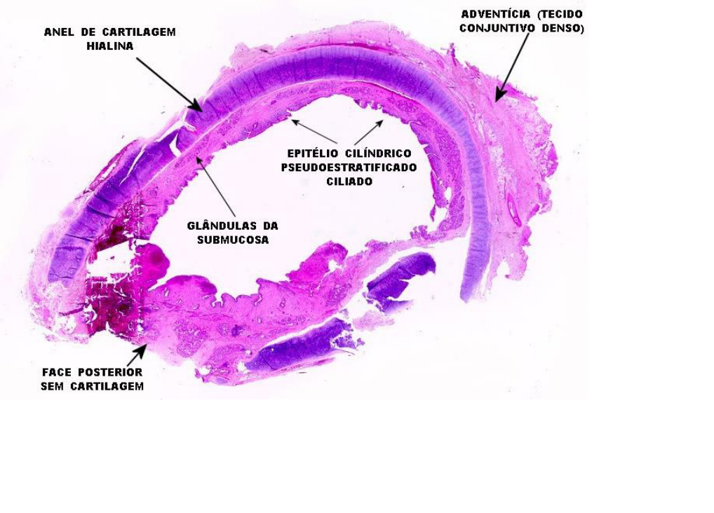 1 T a i s e C a l i x t o G o n ç a l v e s T a i s e C a l i x t o G o n ç a l v e s HISTOLOGIA DA TRAQUEIA E ESÔFAGO TRAQUEIA É um componente do sistema respiratório Faz parte das vias condutoras do ar, com função tanto de conduzir o ar quanto acondicionar o ar durante essa passagem Funções exercidas pelas vias condutoras do ar aquecimento, umidificação e filtração Estende-se desde a laringe até a bifurcação dos brônquios Subdividida em duas regiões: Anterior, presença do anel cartilaginoso o Intensamente basofílico porque sua matriz extracelular é caracterizada pela grande presença de ácido hialurônico o O anel cartilaginoso da sustentação a parede da traqueia e ele não é um anel completo (não se fecha em volta da traqueia). É um anel em forma de ferradura, que só vai estar presente na região anterior. Posterior, em contato com esôfago o Não existe anel cartilaginoso o Constituída por uma parede membranácea o Além de tecido conjuntivo propriamente dito, ainda existe tecido muscular liso liga as duas extremidades do anel cartilaginoso e quando se contrai pode, por exemplo, diminuir o diâmetro da traqueia Ex: tosse De forma geral os órgãos que são ocos, assim como a traqueia, apresentam a parede subdividida em camadas (3 ou 4). A parede da traqueia é subdividida em 3 camadas: h ttp ://an atp at.u n icam p .b r 2 T a i s e C a l i x t o G o n ç a l v e s T a i s e C a l i x t o G o n ç a l v e s Mucosa Camada mais interna Constituída por no mínimo dois tipos de tecidos o TER epitélio pseudoestratificado ciliado o TC frouxo altamente vascularizado lâmina própria está abaixo de epitélios nas mucosas Na traqueia não existe um limite rigoroso que permita identificar a divisão entre mucosa e submucosa Submucosa Logo abaixo da mucosa Constituída por TC propriamente dito pode variar do frouxo até o denso não modelado Presença de glândulas traqueais glândulas exócrinas, cujo o produto de secreção é liberado na superfície da traqueia via ductos secretores h ttp ://an atp at.u n icam p .b r Glândulas Traqueais 3 T a i s e C a l i x t o G o n ç a l v e s T a i s e C a l i x t o G o n ç a l v e s o Função das glândulas secreção de natureza seromucosa manutenção da umidade da mucosa da traqueia, quanto do ar que é conduzido através dela Epitélio que reveste o ducto secretor varia na sua porção mais próxima a secreção epitélio cubico simples conforme vai se aproximando da superfície passa a epitélio cúbico estratificado na superfície: epitélio pseudoestratificado Adventícia Porção anterior: o Anel cartilaginoso cartilagem hialina caracterizada pela basofilia da sua matriz o Não envolve por completo toda a circunferência Porção posterior: o Parede membranácea T. conjuntivo e T. muscular liso Tecido epitelial pseudoestratificado ciliado (Mucosa) Quando observado em MO, dá uma falsa impressão de estratificação núcleos em alturas diferentes tipos celulares diferentes além de funções diferentes, também tem características morfológicas diferentes, especialmente de tamanho Constituído por 6 tipos celulares distintos: 3 primeiras em maior quantidade, mais de 95%, consegue identificar por MO Células cilíndricas ciliadas o São células altas, células epiteliais cilíndricas o Na membrana apical dessas células existe uma especialização de membrana cílios mantidos por microtúbulos apresentam movimentação ondulatória unidirecional - dineína -> clarificação da traqueia, filtração o No corte histológico, são reconhecidas pelo núcleo ovoide baixa basofilia Células basais o Indiferenciadas ou pouco diferenciadas, que apresentam uma alta taxa de proliferação e a potencialidade de se diferenciar para formar qualquer um dos 6 tipos celulares encontrados nesse epitélio o Responsáveis pela renovação celular o Estão assentadas sobre a lamina basal (como todas as células desse epitélio), mas não alcançam a superfície, são células pequenas -> núcleo muito próximo a lâmina basal e mais basofílico Células caliciformes o Em traqueia humana possui número de células equivalente ao de células cilíndricas ciliadas o Tem formato aproximado de cálice o Apresenta a região basal mais afilada, como um cálice no citoplasma dessa região basal fica o núcleo e a maioria das organelas citoplasmáticas o Região apical é caracterizada pela baixa afinidade ao corante célula secretora muco sintetizado por essas células fica armazenado em vesículas no citoplasma apical não apresenta afinidade pelo corante básico e nem pelo ácido. o Função do muco protetora é nesse muco que as partículas e corpos estranhos ficam aderidos, para depois serem varridos pelos cílios também está associado a filtração do ar Secreção: Serosa baixa viscosidade Ex: lágrimas Mucosa alta viscosidade Ex: células caliciformes Serocomucosa intermediária, mista Ex: glândulas traqueais - M ais d e 9 5 % d as cé lu las - V istas e m M O 4 T a i s e C a l i x t o G o n ç a l v e s T a i s e C a l i x t o G o n ç a l v e s Células em escova Células serosas Células de SNED O aquecimento do ar ocorre através de trocas térmicas entre o ar que está circulando na porção condutora e o sangue que circula nos vasos sanguíneos, abundantes na lamina própria. Tecido epitelial pavimentoso simples presente nos vasos sanguíneos (endotélio) ESÔFAGO Tubo, cuja a parede é constituída por uma camada muscular importante que tem a função de conduzir o bolo alimentar da faringe até o estomago. Durante essa condução, o bolo alimentar não é modificado pelo esôfago, de forma que, todas as características histológicas associadas a organização da parede do esôfago estarão associadas a essa função de condução. Para evitar refluxos, o esôfago apresenta dois esfíncteres, classificados como esfíncteres fisiológicos: Faraesofágico mais proximal entre faringe e esôfago Gastroesofágico mais distal 