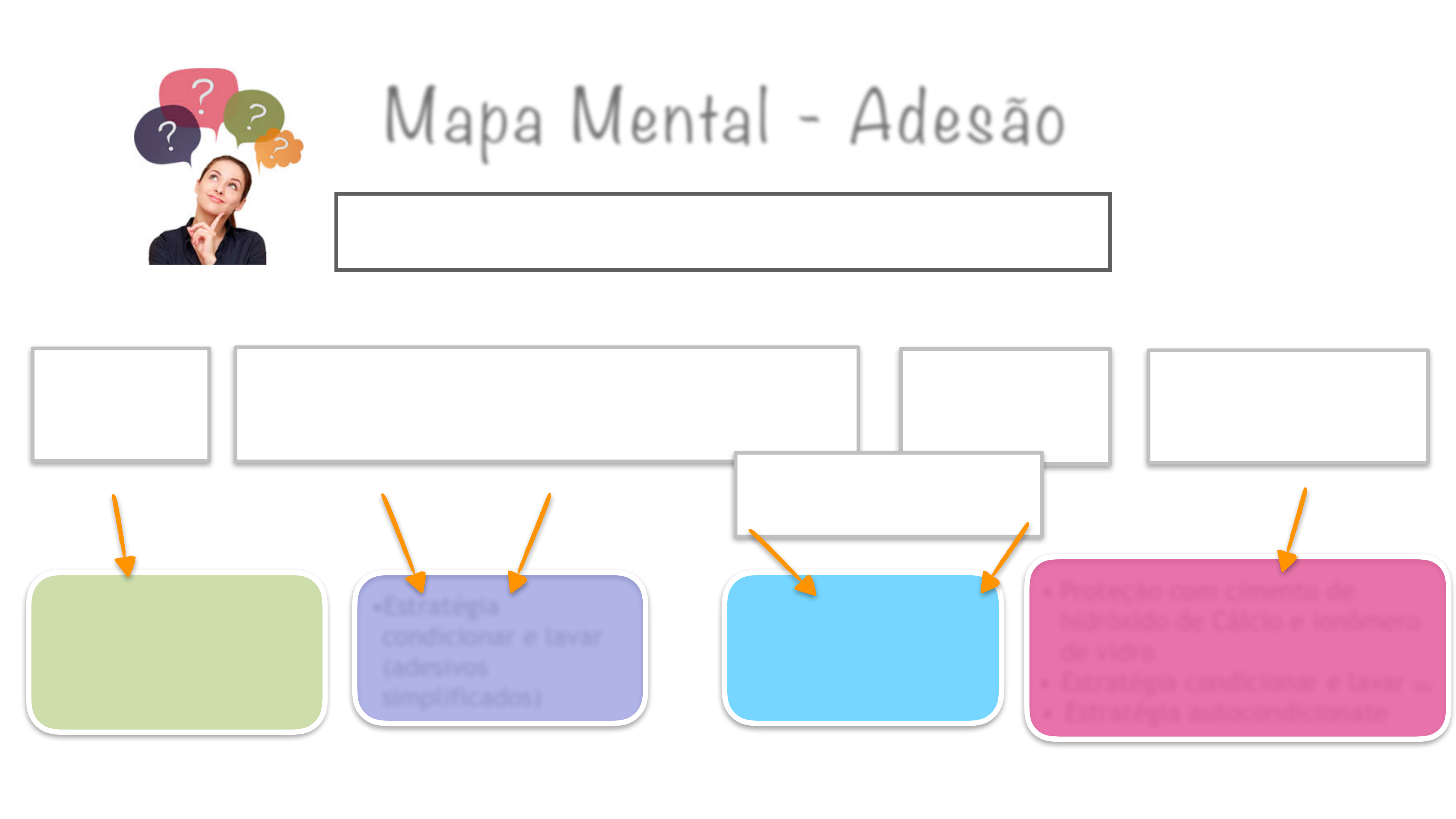 • Proteção com cimento de hidróxido de Cálcio e ionômero de vidro • Estratégia condicionar e lavar ou • Estratégia autocondicionate • Estratégia autocondicionante Mapa Menta l - Adesão Qual ADESIVO escolher?? Profa. Elaine Maia Dentística ✦ Esmalte ✦ Cavidades rasas ✦ Cavidades Médias ✦ Cavidades profundas ✦ Cavidades médias a profundas Dentina escleróticaDentina primária ✦ Cavidades muito profundas (rosado da polpa) •Estratégia condicionar e lavar (adesivos hidrofóbicos ou simplificados) •Estratégia condicionar e lavar (adesivos simplificados) ✦ Lesões não cariosas com sensibilidade