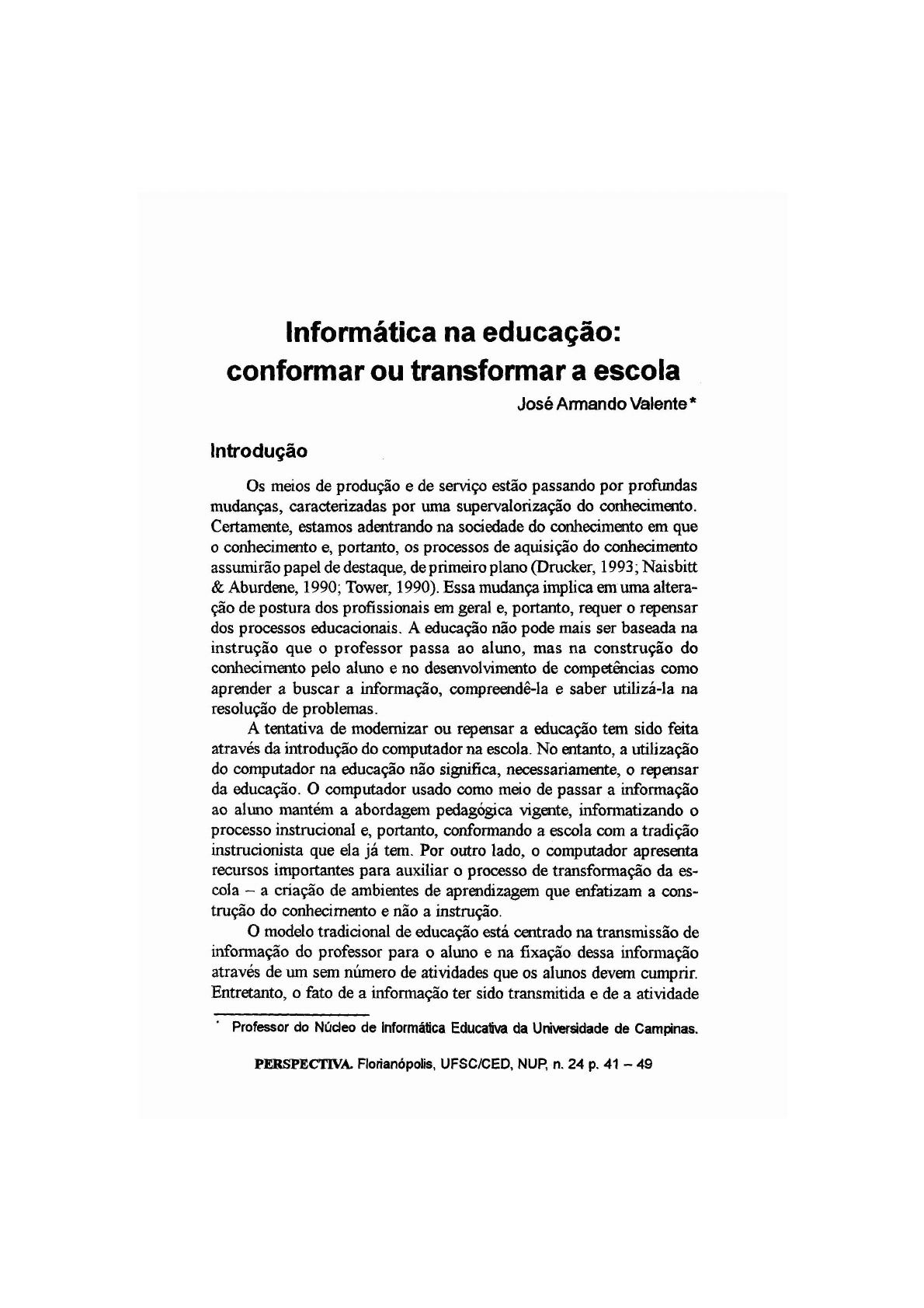 Informática na educação: conformar ou transformar a escola José Armando Valente * Introdução Os meios de produção e de serviço estão passando por profundas mudanças, caracterizadas por uma supervalorização do conhecimento. Certamente, estamos adentrando na sociedade do conhecimento em que o conhecimento e, portanto, os processos de aquisição do conhecimento assumirão papel de destaque, de primeiro plano (Drucker, 1993; Naisbitt & Aburdene, 1990; Tower, 1990). Essa mudança implica em uma altera- ção de postura dos profissionais em geral e, portanto, requer o repensar dos processos educacionais. A educação não pode mais ser baseada na instrução que o professor passa ao aluno, mas na construção do conhecimento pelo aluno e no desenvolvimento de competências como aprender a buscar a informação, compreendê-la e saber utilizá-la na resolução de problemas. A tentativa de modernizar ou repensar a educação tem sido feita através da introdução do computador na escola. No entanto, a utilização do computador na educação não significa, necessariamente, o repensar da educação. O computador usado como meio de passar a informação ao aluno mantém a abordagem pedagógica vigente, informatizando o processo instrucional e, portanto, conformando a escola com a tradição instrucionísta que ela já tem. Por outro lado, o computador apresenta recursos importantes para auxiliar o processo de transformação da es- cola - a criação de ambientes de aprendizagem que enfatizam a cons- trução do conhecimento e não a instrução. O modelo tradicional de educação está centrado na transmissão de informação do professor para o aluno e na fixação dessa informação através de um sem número de atividades que os alunos devem cumprir. Entretanto, o fato de a informação ter sido transmitida e de a atividade Professor do Núcleo de Informática Educativa da Universidade de Campinas. PERSPECTIVA. Florianópolis, UFSC/CED, NUP, n. 24 p. 41 - 49 42 • José Armando Valente ter sido realizada com sucesso não significa que o ahmo compreendeu o que ele recebeu ou o que ele realizou. Como afinna Piaget (1978), a criança pode realizar uma atividade com sucesso e não necessariamente compreender o que ela fez. A utilização da informática na educação também tem seguido essa mesma abordagem, confonnando os processos txlucacionais com o que já éusado em sala de aula. Além dos recursos disponíveis oalmo pode usar o computador para realizar wna série de atividades com sucesso. Entre- tanto, dependwdo do tipo de software usado edo tipode wvolvimwto do professor na interação alooo-computador, oalooo pode ou não comprem- der o que ele realizou. Por outro lado, existem atividades que podem ser realizadas com o computador, que forçam o aluno a buscar infonnações, processá-las e utilizá-las na resolução de problemas, permitindo a compre- ensão do que faz e a construção do seu próprio conhecimento. o fazer X o compreender A distinção entre o fazer (savoir jaire) e o compreender é apre- sentada por Piaget em seu livro Fazer e Compreender (1978). Nesse livro ele mostra através de diversas atividades que a criança é capaz de realizar ações complexas e ter um êxito precoce. Entretanto, isso não significa que a criança tem a compreensão conceitualizada daquilo que realizou. Ela pode saber fazer, mas não compreender os conceitos en- volvidos na atividade que realizou. Piaget observou que a passagem do saber fazer para o compre- ender se dá graças à tomada de consciência, que consiste na transfor- mação do esquema das ações (que permitem o fazer) em noções e ope- rações (que constituem a conceitualização). Essa passagem se dá em três estágios: no primeiro estágio a criança negligencia todos os concei- tos envolvidos na atividade, no segundo ela coordena alguns conceitos e no terceiro, a criança coordena todos os conceitos envolvidos na ativida- de. Por exemplo, na atividade de enfileirar dominós de modo que quando o primeiro cai, derruba todos os outros, a criança pode conseguir realizar essa atividade com sucesso, porém a criança no primeiro estágio não entende que a distância entre os dominós é fundamental; no segundo estágio entende que a distância é importante, porém o alinhamento deve ser sempre em linha reta; e finalmente, no terceiro estágio coordena os Informática na educação: confonnar ou transformar a '" • 43 elementos distância e alinhamento e é capaz de enfileirar os dominós de modo que eles possam fazer um caminho curvo. Além disso, Piaget observou que não é o objeto que induz ao está- gio da compreensão. O fato de a criança ter entendido o ftmcionamento do dominó não significa que ela necessariamente entenda como empilhar cartas de baralho para construir um castelo de cartas. A compreensão é fruto da qualidade da interação criança-objeto. Se no processo de reali- zar uma atividade a criança não se limitar à obtenção do êxito, mas for desafiada, desequilibrada com novos problemas ou com novas maneiras de resolver o mesmo problema, ela tem a chance de refletir sobre os resultados das suas ações, de tomar consciência do que fez e, portanto, passar do nível do fazer para o nível do compreender. A qualidade da interação aprendiz-objeto é particularmente perti- nente ao caso do uso de diferentes softwares educacionais. Um deter- minado software não pode analisado independentemente do seu uso. Do mesmo modo que não é o objeto que leva à compreensão, não é o software que permite ao aluno entender ou não um determinado conceito. A com- preensão é fruto de como o software é utilizado e de como o aluno está sendo desafiado na atividade de usar aquele software .Nesse sentido, o professor tem um papel ftmdamental como proponente de novos desafi- os e de provocador do desequilíbrio. Entretanto, dependendo do software em uso, essa atividade exige do professor uma maior