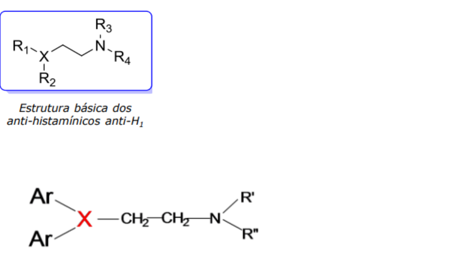 FARMACOS ANTI-HISTAMINICOS (H1) Mecanismo de ação: Antagonistas da ação da histamina; Competem com a histamina pelos locais do receptor H1 sobre as células efetoras, impedindo a manifestação das respostas mediadas pela histamina; AGONISTAS INVERSOS: ligam-se aos receptores inativando sua conformação. Principais indicações: Conjuntivite alérgica; Urticária; Rinite; Cinetose e náuseas; Alergias alimentares; Reação anafilática. X = O, N, CH Em geral: R1 e R2= Ar Em geral: R3 e R4= CH3: MAIOR POTENCIA ANTI-H1 DE PRIMEIRA GERAÇÃO RELAÇÃO ESTRUTURA x ATIVIDADE O nitrogênio terminal DEVE ser TERCIARIO; Derivados de DIMETILAMINICOS possuem atividade MAIS INTENSA; Cadeia ALQUILICA entre X e N, para atividade ÓTIMA, deve possuir DOIS átomos de C; Atividade ÓTIMA: R e R’ são AROMÁTICOS; POTÊNCIA acentuada: INTRODUÇÃO de um grupo INDUTIVO, na posição para da fenila (Cl, Br, Fl, I) ETANOLAMINAS C – O = ação SEDATIVA pronunciada; Aminoalquiléteres; Há maior seletividade pelos receptores H1 que pelos receptores muscarínicos; Apresentam efeitos adversos anticolinérgicos; Possuem efeitos antieméticos. Difenidramina Possui efeitos sedativos pronunciados; Varias associações como descongestionantes; Antiemético , renites , conjuntivites; BENALET Núcleo etilenodiamínico ; Antagonistas H1 ESPECIFICOS; INDUZEM sedação; Atividade anticolinérgica menos acentuada que a dos derivados da etanolamina .ETILENODIAMINAS Usado em associações: Ex: Engov , Naridrin Tratamento de alergias; Estão entre os mais POTENTES; MAIOR seletividade para os receptores H1 x muscarinicos ; MENOS efeitos SEDATIVOS que as etilenodiaminas ; MAIOR tempo de ação.ALQUILAMINAS PIPERAZINAS Prevenção de náuseas, cinetose e tratamento de alergia; Efeitos anticolinérgicos mínimos. TRICÍCLICOS Usado como antiemético e no tratamento da alergia; Efeitos anticolinérgicos; Efeito SEDATIVO pronunciado; Longa duração. PIPERIDINAS FENOTIAZINAS POTENTE anti-histaminico ; Utilizado em distúrbios alérgicos, como antiemético e adjuvante na anestesia geral. ANTI-H1 DE SEGUNDA GERAÇÃO SEDAÇÃO – interação com receptores H1 no SNC; Estruturas mais HIDROFILICAS; MAIOR seletividade pelos receptores H1 e POUCOS efeitos SEDATIVOS; Efeito antialérgico eficiente; Ausência de efeitos antieméticos e gastrintestinais;