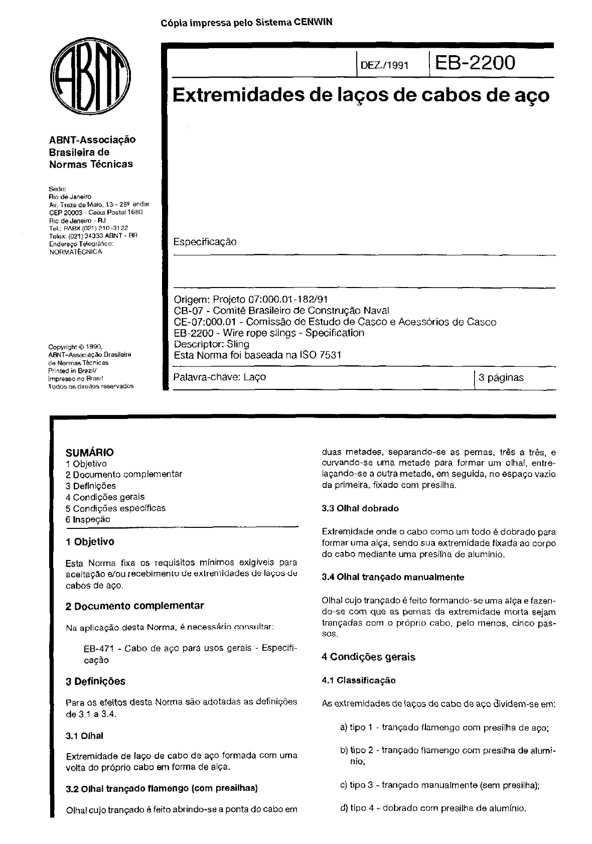 C6pia impressa pelo Sistema CENWlN ( DEZ./,~~ ( EB-2200 Extremidades de IaGos de cabos de aGo Especifica@ Origem: Projeto 07:000.01-l 82/91 CB-07 - Comitf! Brasileiro de ConstruqAo Naval CE-07:000.01 - Comissao de Estudo de Casco e Acess&ios de Casco EB-2200 Wire rope slings Specification Descriptor: Sling Esta Norma foi baseada na IS0 7531 Palavra-chave: laqo 3 piginas SUM&IO 1 Objetivo 2 Document0 complementar 3 Defini@es 4 Condiqbes gerais 5 Condi@es especlficas 6 Inspe~k 1 Objetivo Esta Norma fixa 0s requisites minimos exigiveis para aceit@o e/w recebimento de extremidades de la$os de cabos de ace. 2 Documento complementar Na aplica$Ho desta Norma, 6 necessko consultar: EB-471 Cabo de a$0 para uses gerais - Especifi- ca$zo 3 Defini@es Para OS efeitos desta Norma s80 adotadas as definiqdes de 3.1 a 3.4. 3.1 Olhal Extremidade de la~o de cabo de a$o formada corn uma volta do pr6prio cabo em forma de Alma. 3.2 Olhal trayado flamengo (corn presilhas) Olhal cujo tranqado B feito abrindo-se a ponta do cabo em duas metades, separando-se as pemas. trfis a trCs, e curvando-se uma metade para formar urn olhal, entre- laqando-se a outra metade, em seguida, no espa~o vazio da primeira, fixado corn presilha. 3.3 Olhal dobrado Extremidade onde o cab0 corn0 urn todo 6 dobrado para formar uma al@, sendo sua extremidade fixada ao corpo do cabo mediante uma presilha de aluminio. 3.4 Olhal tranqado manualmente Olhal cujo tran$ado 6 feito formando-se tuna ai&? e fazen- do-se corn que as pernas da extremidade morta sejam trancadas corn o prbprio cabo, pelo menos. cinco pas- SOS. 4 CondiGGes gerais 4.1 Classifica@o As extremidades de la$os de cabo de a$o dividem-se em: a) tipo 1 tranGado flamengo corn presilha de aqo; b) tip0 2 - tran?ado flamengo corn presilha de alumi- nio; c) tipo 3 - trayado manualmente (sem presilha); d) tipo 4 - dobrado corn presilha de aluminio. C6pia impressa pelo Sistema CENWIN 2 EB-2200/1991 4.2 Condi~des para utiliza@o 4.21 Olhal tip0 1 Este tipo de olhal B o mais seguro, uma vez que parte da resistf?nciadoolhal edado pelo tran~adoen8odependen. do exclusivamente da presilha. 4.22 Olhal tip0 2 Apresenta as mesmas caracteristicas do tipo 1, corn as seguintes restri@es: a) altas temperaturas; b) em contato corn aguas salgadas; c) em contato con- superficies abrasivas. 4.2.3 Olhal tip0 3 Possui resist&n&a mais baixa que os demais e nao devem ser utilizados em situa@s em que o la$o possa sofrer rota@es ou cargas ciclicas. 4.2.4 Olhal tip0 4 Este tipo de olhal B o menos seguro, apesar de possuir resist&& igual aos tipos 1 e 2, pois a resistencia do olhal depende exclusivamente da presilha. Nao deve ser utili- zado nas seguintes situa@es: a) em cargas suspensas que envolvam riscos huma- nos; b) em altas temperaturas; c) em contato corn dguas salgadas: d) em contato corn superficies abrasivas. 4.3 Controle da qualidade 4.3.1 A operapHo de tranqamento manual dew ser feita apenas por pessoal qualificado. 0 fornecedor dew ser respons&w em assegurar que os seus tran$adores se- jam treinados e qualificados. 4.3.2 OS tubas das presilhas devem ser inspecionados pelos fabricantes de &OS, para assegurar que es?& livre de falhas ou defeitos. OS fabricantes dos tubas devem fornecer urn certificado a cada lote. 4.3.3 As presilhas tamb&m devem ser inspecionadas pe- los fabricantes de Lagos desde o cork do tubo at6 a sua aplicaq8o final, para assegurar que estejam livres de fa- lhas ou defeitos, e que foram prensadas de acordo corn o Capitulo 5 desta Norma. 4.3.4 OS fabricantes de lavx devem assegurar e certificar, quando solicitado pelo comprador, que as presilhas u- tilizadas parafabrica$So dos Lagos devem possuiras mes- mas caracteristicas. dentro das tolerancias normais de fabrica@o, daquelas que foram aprovadas em ensaio de prot6tipo descritas em 6.1. 5 Condi@es especificas 5.1 Fabrica@o 5.1.1 OS cabos devem ser cortados de tal maneira que os arames das extremidades n8o sejam endurecidos nem soldados entre si. 5.1.2 No case de laces tipos 1 e 2, as presilhas devem ter format0 cilindrico e acabamento cZlnico na extremidade oposta ao olhal. 5.1.3 As extremidades corn presilhas, de cabos corn 38 mm de diimetro nominal e acima, devem ser feitas corn cabo de avo corn alma de aqo. 5.2 ExtremidadescomtranFadoflamengo, corn presilha de a$o (tip0 1) 5.2.1 As presilhas de ago para “so em tranGado flamengo devem ser feitas a partir de tubos sem costura. 5.2.2 As presilhas nHo devem ter nenhum defeito quo pos- sa prejudicar seu desempenho. Ap6s a prensagem, a presilha dew estar livre de trincas. 5.2.3 As extremidades mortas das pernas devem ser lon- gas osuficiente para permitir que a presilha seja colocada sobre ela, abrangendo todo o comprimento de sua parte cilindrica. 5.2.4 A carga de ruptura da extremidade corn tran$ado flamengo, corn presilha de ago, dew ser de, pelo menos, 90% da carga de ruptura do cabo de aqo respective. 5.3 Extremidade corn presilha de aluminio (tipos 2 e 4) 5.3.1 As presilhas de aluminio devem ser produzidas a partir de urn tuba sem costura. 5.3.2AspresilhasnHodevem ternenhumdefeitoquepossa prejudicarseudesempenho.Ap6saprensagem. apresilha deve estar livre de trincas verific&eis atravgs de ensaio de liquido penetrante. 53.3 0 comprimento total da presilha, no case de laqos corn olhal dobrado, deve canter a extremidade morta do cabo, de maneira que a mesma seja visivel ap6s a pren- sagem. 5.3.4 A carga de ruptura da extremidade corn presilha de aluminio dew ser de, pelo menos, 90% da carga de ruptura do cabo de ago respective. 5.4 Extremidades corn tranGado manual (sem presilha) (tip0 3) 5.4.1 As extremidades dos arames das pemas trayadas devem ser cob&as corn “ma prote@o adequada para evitar danos pessoais. 5.4.2 A carga de ruptura da extremidade corn tranGado manual deve ser de, pelo menos, 70% da carga de ruptu- ra do cabo de ago respective. C6pia impressa pelo Sistema CENWIN ES220011991 3 6 Inspe@o 6.1 Certiiicar;io de protbtipo (ensaio de tip@ 6.1.1 Generalidades 8.1.1.1 