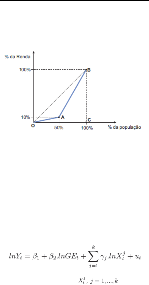 ENADE - Distribuição de Renda, Desigualdade e Pobreza Responda as questões a seguir e justifique as alternativas incorretas. Questão 12/2006 - Numa economia há apenas duas pessoas, uma delas aufere 10% da renda, e a outra, os 90% restantes. Neste caso, a Curva de Lorenz desta economia será representada por OAB no gráfico abaixo. Considerando o gráfico e as informações acima, é correto afirmar que: (A) o Coeficiente de Gini é igual a 40%. (B) a concentração de renda vai reduzir a demanda a 50%. (C) se a renda fosse distribuída equalitariamente, a Curva de Lorenz seria OCB. (D) se a renda fosse distribuída equalitariamente, o Coeficiente de Gini seria igual a 100%. (E) não é possível calcular o Coeficiente de Gini para duas pessoas. Falsa – pois o coeficiente de Gini é uma das principais medidas de desigualdade, ele estabelece o valor de uma medida de desigualdade deve aumentar sempre que for feita uma transferência regressiva de renda, ou seja, ele pode ser feito com quantas pessoas possíveis, desde que se tenha todas as informações solicitadas. Questão 19/2012 - Suponha que o Ministério da Educação contrate um economista como consultor para mensurar o efeito do gasto público com a educação sobre a renda da população. O consultor propõe o modelo a seguir. Nesse modelo, lnYt e lnGEt são, respectivamente, o logaritmo da renda da população e do gasto público com educação no período t; , são variáveis de controle; β1, β2 e γj , j = 1, ..., k , são os coeficientes da regressão; ut é o termo de erro aleatório. Admitindo-se que a transformação logarítmica é estacionária para todas as variáveis da equação, verifica-se que: A) β2 é a elasticidade renda com respeito ao nível de escolaridade da população. B) a renda aumenta em R$ 1,00 para cada R$ 1,00 gasto com educação, se β2 = 1. Falso, pois não é possível mensurar esse gasto levando em consideração uma elasticidade unitária, umas vez que há outros fatores que envolvem a análise. C) β1 é o nível médio de gasto com educação, controlado pelas demais variáveis do modelo. D) a variação percentual da renda será maior que a variação percentual do gasto público com educação, se β2 > 1. E) a renda da população aumenta menos que 1% quando o gasto público com educação aumenta em 1%, se β1 < 1. Questão 20/2012- Dois estudantes de Economia, João e Pedro, estão debatendo sobre a estimação de modelos de crescimento econômico. João propõe uma formulação em que a taxa de crescimento do PIB dos países, gY , depende da taxa de crescimento do capital físico, iK; da taxa de crescimento do capital humano, iH ; e da taxa de crescimento da força de trabalho, n . Pedro propõe incluir na formulação de João uma proxy para captar o diferencial de qualidade institucional, INST. Segundo a argumentação de Pedro, quanto maior o nível de qualidade institucional, maior será a taxa de crescimento do PIB. Assuma que a variável INST tenha alguma correlação com as outras variáveis incluídas nos modelos, de acordo com as formulações a seguir. João: Pedro: Nesses modelos, j = 1,..., N representa os N países da amostra e as variáveis uj e εj são os termos de erro aleatório. Se forem estimados os dois modelos pelo método de mínimos quadrados ordinários, pode-se ter um problema de inclusão de variável irrelevante ou de exclusão de variável relevante. Nesse contexto, testa-se a hipótese nula H0: α5 = 0. Na situação acima descrita, A) se for rejeitada H0, então, na estimativa do modelo proposto por João, os coeficientes estimados são viesados. B) se não for rejeitada H0, então, na estimativa do modelo proposto por João, os coeficientes estimados são viesados. Falsa, pois se ela for aceita o modelo proposto por Joao os coeficientes estimadores seriam não-viesados. C) se não for rejeitada H0, então, na estimativa do modelo proposto por Pedro, os coeficientes estimados são eficientes. D) se for rejeitada H0, então, na estimativa do modelo proposto por Pedro, os coeficientes estimados são não eficientes. E) se não for rejeitada H0, então, na estimativa do modelo proposto por João, os coeficientes estimados são não eficientes. Questão 29/2012 - Na discussão sobre os determinantes da renda dos indivíduos, argumenta-se que a experiência e a educação influenciam positivamente a renda no mercado de trabalho. Contudo, o efeito da educação é convexo, enquanto o da experiência é côncavo, ou seja, um ano a mais de educação aumenta cada vez mais a renda, ao passo que um ano a mais de experiência aumenta cada vez menos a renda. Além disso, indivíduos com mesmo nível de educação e escolaridade podem ter níveis de renda diferentes no mercado de trabalho devido a um efeito segmentação ou efeito discriminação. Entre os fatores que explicam a segmentação, incluem-se a formalidade do trabalho, o setor de atividade e a sindicalização. Já a discriminação se expressa pelos diferenciais de renda por gênero e etnia para indivíduos que possuem mesmos atributos produtivos. Suponha que um técnico do Ministério do Trabalho resolva testar as hipóteses mencionadas acima propondo o modelo seguinte. em que lnY é o logaritmo da renda do trabalho; EDUC é a variável que expressa anos de escolaridade; EXP é a variável referente a anos de experiência; Xj são as variáveis de controle para segmentação e discriminação; β1, β2, β3, β4 e γj são os parâmetros a serem estimados; u é o termo de erro aleatório, com média zero e variância constante. Entre os resultados da estimação do modelo, seria adequado o técnico conjecturar que D – Falsa, pois comprovar a experiencia um ano a mais não geraria um aumento substancial no salario, uma vez que a contratação exige tempo mínimo para receber determinado salario, um aumento por um ano a mais só ocorreria se fosse definido e anunciado de tal forma. Questão 12/2015