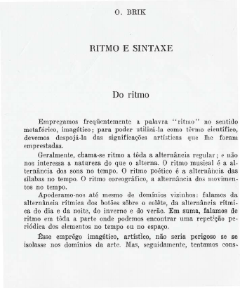 O. BRIK RITMO E SINTAXE Do ritmo EmpregamosfreqÜentementea palavra" ritmo" no sentido metafórico,imagético;para poderutilizá-Iacomotêrmocientífico, devemosdespojá-Iadas significaçõesartí3ticas que lhe foram emprestadas. Geralmente,chama-seritmoa tôdaa alternânciaregular;e não nos interessaa naturezado queo alterna.O ritmo musicalé a al- ternânciadossonsno tempo.O ritmo poéticoé a alternâilciadas sílabasno tempo.O ritmo coreográfico,a alternânciadosmovimen- tos no tempo. Apoderamo-nosaté mesmode domíniosvizinhos: falamosda alternânciarítmicadosbotõessôbreo colête,da alternânciarítmi- ca do dia e da noite,do invernoe do verão.Em suma,falamosde ritmo emtôda a parte ondepodemosencontraruma repet~çãope- riódicadoselementosno tempoou no espaço. ~sse emprêgoimagético,artíst'Íco,não seria perigosose se isolassenos domíniosda arte. Mas, seguidamente,tentamoscons. ]32 O. Brik Ritmo e Sintaxe 133 tl'uir sôbreessaimagempoéticaa teoriacientíficado ritmo.Ten- tamos,por exemplo,provarqueo ritmo dasobrasartísticas(verso, música,dança)nada maisé do que uma conseqüênciado ritmo natural: o ritmo daspalpitaçõesdo coração,o ritmo do movimento daspcrnasdurantea caminhada.Fazemosaquia transferênciaevi- dentede umametáforapara a terminologiacientífica. O ritmocomotêrmocientíficosignificaumaapresentaçãopar- ticular dos processosmotores.É uma apresentaçãoconvencional quenadatema ver coma alternâncianatural nosmovimentosas- tronômicos,biológicos,mecfmicos,etc. O ritmo é um movimento aprespntadode umamaneiraparticular. Devemosdistinguir rigorosamenteo movimentoe o resultado do movimento.Se umapessoasaltasôbreum terrenolamacentode um p/mtanoe nêle deixa suas pegadas,a sucessãodessasbusca cmviio ser regular,nãoé um ritmo.Os saltof>têmfreaüentemente 11mritmo,masos traeosQueêlesdeixamno solonão.sãomaisque dailosoueservempara jnl!:nl..los.Falandoeienl1ficamente,não po- drmosdi7:erquea disnosicãodas pegadascqnstituium ritmo. O poemaimprimidonum livro tamhémnão oferecesenãotra- GOSdomovimento.Somenteo discursopoéticoe nãoo seureRultado gráficopodeser apresentadocomoum ritmo. Essa diferenciacãodenocãotcmimportâncianãosbmenteaca- dêmica,mastambém,e sobretudo,prática..Atéagora,tôdasas ten- tativasparaencontrarasleis doritmonão tratavamdo movimfmto aprespntailosob tlmaformarítmica,mas das combinaçõesde tra- çosdeixadospor êssemovimento. Os estudiososdoritmopoéticoperdiam-seno verso.dividindo-o pmsílahas.medindo-oe tratandodp encontrarasleis do ritmones- sa a.n~lise.De fato.tôdnse!'1sasmedidase sHabaRexistemnãopor si mesmas.mascomore!ffiltadode um certomovimentorítmico.Não poopmdar senãoindicaçõessôbreêssemovimentorítmicodo qual resultam. O movimentorítmico é anteriorao verso.Não nodemoscom- pl'eem1ero ritmo a partir da linha do verfJO;ao contrário,compre- ender-se-áoversoa partir domovimentorítmico. Há em Pushkin um verso: Lioqkim zefiromlctit (voa como zéfiroU!!eiro).Podemosler ê!'1Qeversodeduasmaneirasdiferpntes: L.ióakimzéfiromlctít ou Lióak.imzefírom,lctít, Podemoscomhinar e analisarinfinit.amentesuassílabas.suaRmedidas.os sons dÔ!'1te verso.masnão saberemosnuncacomo1&-10;masse lermostodos osversosprecedentes,aochegarmosaí,nãodC'ixaremosde ler Ljóg- kim zéfirornlctít, porqueo impulsodêssepoemaé trocaicoe não datílico. Lemoso versocorretamente,porqueconhecemoso impulsorít- micode queresulta.Incluído numcontextodatílico,êsscversote- ria exigidoa leitura: Ljogkim zcfíromletit. Antes dc têrmoslido êsseverso,nãohaviaacentonemsôbreo e nemsôbreo i. Depoisda leitura, o acentoencontrou-sesôbreo c,maspoderiater sidosôbreo i. Por issoseráemgeralmaiscorretofalar nãodesílabasfortes ou fracas,lllas de sílabasacentuadasou não-acentuadas.Teorica- mente,cadasílabapode ser acentuadaou não, tudo dependedo impulso rítmico. Por isso, distinguir as fortes, as semifortes,as levementefortes,as>fracas,etc.,e tentarpenetrarassim,na diver- sidadedo movimentorítmico,não poderiaser senãoUllla emprê- sa estéril. Tudo dependedo ritmo do discursopoéticoque tem comoconseqüênciaa distribuiçãoemlinhas e sílabas. Os cxpcrtstentamfixar a intell.'3idadede cada sílaba e de- vemadmitirquediferentespronúnciasdo versolevama resultados diferentes.O permanentemal-entendidotem comoúnica causaa confusãoquesefêz entreimpulsorítmico c versopronto. Se colocamosde saída a primazia do movimentorítmico, o fato de queobtemosao cursode diferentesleituras resultadosdi- ferentesnão terá nadade espantoso;não nossurpreenderemosao obter,no decorrerde leiturasdiferentesde.um mesmopoema,uma alternânciadiferentedas unidadesrítmicas. A coreografiatorna particularmenteclara essaligaçãodo illl- pulsorítmicocomseuresultadoconcreto,emboraaí tambémseten- te explicaro ritmo pela alternânciae a combinaçãode certosmo- vimentos.Mas éumatentativasemesperanças. É evidenteque a dançarepousanum impulsoinicial quc se realizaemmovimentoscinéticosvariados. Ninguémdirá queo homemprontopara valsarcombinacertas figourase repetiçõesperi6dieas.Claro estáquenestecasose realiza umacertafórmulaqueéanteriora cadauma de suasencarnações. Por isso,a valsanão tem fim, pode-separar a todo instante;ela não visa a umasomadefinidade elementoscoreográficos.O total dêsseselementosé desconhecidono comêçoda dançae por tal mo- tivo não se podefalar de suadistribuiçãoreguib.:Lno espaçoe no tempo. . A dançaapresentadanessacen,asubstituio impulsorítmico por umacombinaçãodemovimentoscoreográficos.A diferençaen- tre as dançasditaspopularesqueencontramosna vida e suasen. 134 O. Brik Ritmo e Silltaxe 135 cenaçõesresideno fato de quese dançaas primeirasseguindo-se um impulsorítmicopuro, enquantoque as segundassãoconstruí- das a partir da combinaçãodosmovimentoscoreográficos.As pri- meirastêmurncomêçomasnãoum fim preestabelecido.As segun- dassãofixadasdocomêçoaofim. A semânticarítmica É me