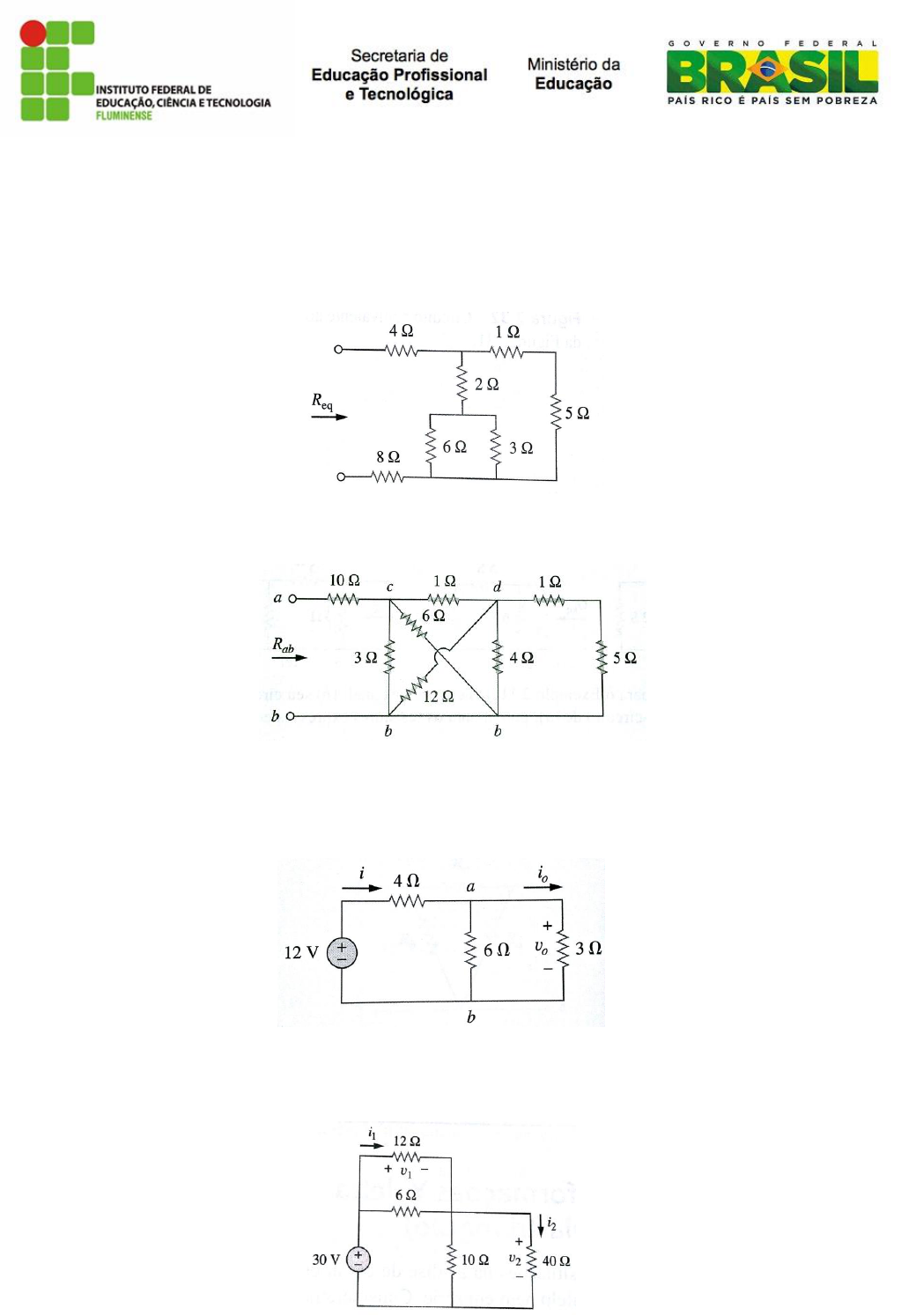 Disciplina: Eletrotécnica Prof.: Fabio Junio Coelho Nome: Turma: Exercícios 6 – Associação de resistores 1) Determine a Req para o circuito da figura 1. Figura 1 2) Calcule a resistência equivalente Rab no circuito da figura 2. Figura 2 3) Determine i0 e v0 no circuito mostrado na figura 3. Calcule a potência dissipada no resistor de 3 Ω. Figura 3 4) Determine v1 e v2 no circuito mostrado na figura 4. Calcule também i1 e i2 e a potência dissipada nos resistores de 12 Ω e 40 Ω. Figura 4 5) Para o circuito mostrado na figura 5, determine: (a) tensão v0; (b) potência fornecida pela fonte de corrente; (c) potência absorvida por cada resistor. Figura 5 6) Para o circuito mostrado na figura 6, determine: (a) v1 e v2; (b) potência dissipada nos resistores de 3 kΩ e 20 kΩ; e (c) potência fornecida pela fonte de corrente. Figura 6 7) Para o circuito da figura 7, i0 = 3A. Calcule ix e a potência total dissipada pelo circuito. Figura 7 8) Se Req = 50 Ω no circuito da Figura 9, determine R. Figura 9
