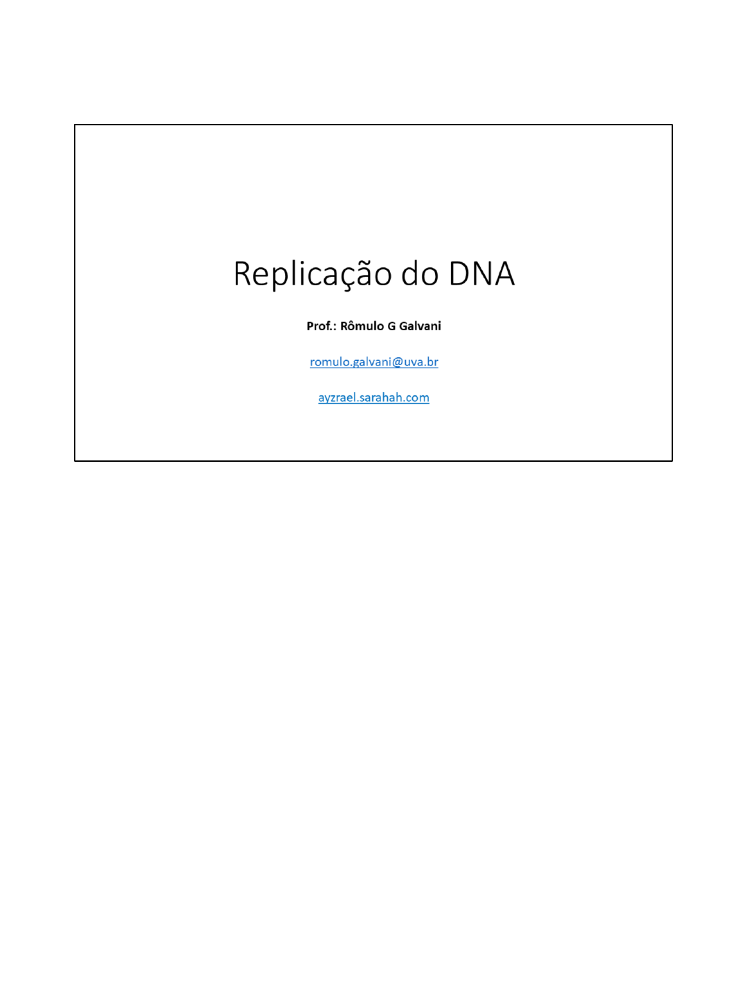 1 A replicação do DNA deve ocorrer antes de cada divisão mitótica celular. Em um contexto didático de ciclo celular, a replicação do DNA acontece na fase S, que justamente significa síntese de DNA. 2 A dupla fita de DNA serve como molde para a replicação do mesmo onde cada fita serve como molde para a sua fita complementar, preservando assim metade da fita da célula-mãe e criando uma fita completamente nova para a célula-filha. Por isso esse processo é chamado de semi-conservativo. 3 A dupla fita de DNA serve como molde para a replicação do mesmo onde cada fita serve como molde para a sua fita complementar, preservando assim metade da fita da célula-mãe e criando uma fita completamente nova para a célula-filha. Por isso esse processo é chamado de semi-conservativo. 4 Para que ocorra o início da replicação do DNA, é necessário que as fitas de DNA (altamente estáveis através das pontes de hidrogênio se rompam). Isso acontece em locais específicos determinados Origens de replicações. Estes locais contém uma maior concentração de pares de base A-T que são ligados apenas por 2 pontes de hidrogênio, facilitando assim a formação do que chamamos de bolha de replicação. 5 O processo é razoavelmente parecido, mas comecemos pelos mais simples. 6 Bactérias possuem apenas 1 origem de replicação e um DNA circular. Proteinas iniciadoras reconhecem a origem de replicação e formam um grande complexo proteína-DNA. Esse complexo atrai então uma proteína chamada DNA Helicase. 7 Inicialmente as DNA-helicases foram descritas como proteínas que utilizam a energia da hidrólise do ATP para realizar alguma função. Posteriormente foi descrito que a hidrólise do ATP agia modificando a conformação da proteína para que ela pudesse realizar um movimento através da fita simples de DNA. Quando ela encontra uma fita dupla de DNA ela continua a deslocar-se abrindo a dupla fita de DNA. Existem basicamente 2 helicases: Uma que se desloca no sentido 5’ para 3’ e outra que se desloca no sentido 3’ para 5’. 8 As proteínas iniciadoras ligam-se as sequencias da origem de replicação causando um dobramento na dupla-fita do DNA bacteriano. A complexo helicase-inibidor reconhece a sequência dobrada e o inibidor da helicase se liga abrindo a dupla fita de DNA. 9 A síntese ocorre graças a uma enzima chamada DNA polimerase que polimeriza a fita de DNA. Um desoxirribonucleosídeo trifosfato reconhece sua base complementar (no desenho o C encontrou o G). O grupamento trifosfato perde o pirofosfato deixando uma valência livre capaz de reagir com a hidroxila 3’ da desoxirribose anterior. A síntese é realizada na direção 5’ => 3’ (com raras exceções). 10 A síntese ocorre graças a uma enzima chamada DNA polimerase que polimeriza a fita de DNA. Um desoxirribonucleosídeo trifosfato reconhece sua base complementar (no desenho o C encontrou o G). O grupamento trifosfato perde o pirofosfato deixando uma valência livre capaz de reagir com a hidroxila 3’ da desoxirribose anterior. A síntese é realizada na direção 5’ => 3’ (com raras exceções). 11 A DNA polimerase sozinha rapidamente se dissocia da fita simples de DNA. Para que o tempo de polimerização da mesma seja prolongado um complexo proteico chamado de proteínas da cinta deslizante aumenta sua interação com o DNA sem que impeça o seu movimento de polimerização. A cinta deslizante é montada pelo complexo montador da cinta através da hidrólise de ATP. O complexo montador da cinta se dissocia da cinta deslizante assim que ela é montada com a polimerase. Toda vez que a Polimerase com a cinta encontra uma porção em que o DNA está em dupla- fita elas se dissociam. 12 Já ficou claro que a DNA polimerase necessita da hidroxila 3’ do nucleotídeo anterior para polimerizar o DNA, portanto ela não polimeriza uma fita sem molde, e tampouco sem início. Portanto uma enzima chamada DNA primase reconhece o DNA fita simples e sintetiza um pequeno fragmento de RNA que serve como iniciador ou primer para que a DNA continue a sintetizar o DNA. 13 A DNA-primase após a ação da helicase sintetiza uma sequencia iniciadora (primer) de RNA e então a DNA polimerase reconhece o iniciador e segue polimerizando o DNA. 14 Porém, por existir apenas 4 bases nitrogenadas, a chance de haver um repareamento parcial de apenas 1 fita formando grampos é enorme. Isso atrapalharia a síntese do DNA pela DNA-polimerase. 15 Para resolver esse problema, proteínas ligadoras de fitas simples de DNA chamadas SSB (presentes em bactérias, eucariotos e até vírus) ligam-se a fita de DNA simples estabilizando-as, no entanto sem esconder a base nitrogenada, possibilitando o pareamento necessário para a polimerização do DNA. 16 Os DNAs de bactérias circulares sofrem um aumento de tensão toda vez que a helicase percorre desfazendo a dupla-fita de DNA pois ele não possui extremidades livres. Nos eucariotos, as extremidades do DNA são ligadas a proteínas, não sendo livres também e sofrendo o mesmo problema. Proteinas chamadas topoisomerases podem resolver este problema. As toposiomerases I clivam a ligação fosfodiester de uma das fitas permitindo que ela gire reduzindo a tensão, esta reação é reversível e o fosfato deslocado é utilizado para retomar a ligação fosfodiester. 17 A toposimerase 2 atua quando 2 duplas-fita de DNA se entrelaçam, então ela quebra as duas ligações de 1 das dupla-fita e permite que a outra a ultrapasse. 18 Quando a replicação se inicia a origem de replicação fica semi-metilada e isso não permite que a replicação ocorra novamente. 19 20 21 O DNA dos eucariotos possuem várias origens de replicação, o que reduz o tempo para a replicação de todo o DNA. 22 O complexo de reconhecimento de origem reconhece a origem de replicação. Proteinas inibidoras da Helicase chamadas Cdt1 e Cdc6 ligam-se ao ORC e a helicase. Por tanto, por ação das inibidoras, a helicase encon