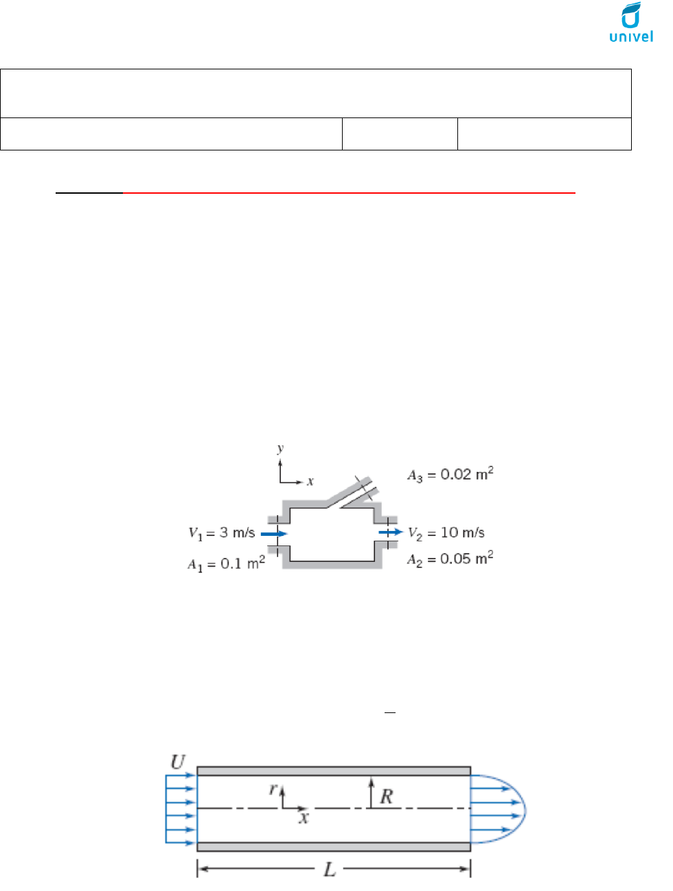 Lista 2: Entregar em Dupla ou Individualmente dia 04/09/2018. 1) A ducha de um chuveiro alimentado por um tudo de água com diâmetro interno de 19,05 mm consiste em 50 bocais de diâmetros internos de 0,79 mm. Considerando uma vazão de 1,39.10 -4 m 3 /s, qual a velocidade de cada jato de água? Qual a velocidade média (m/s) no tubo? R = 5,7 m/s e 0,49 m/s 2) Um agricultor está pulverizando um líquido através de 20 bocais com diâmetro interno de 5 mm, a uma velocidade média na saída de 5 m/s. Qual a velocidade média na entrada do alimentador que possui diâmetro igual a 35 mm? Qual a vazão do sistema em L/min? R = 2,04 m/s e 11,78 L/min. 3) Considere o escoamento compressível e permanente através do dispositivo mostrado. Determine o módulo e o sentido da vazão volumétrica através da porta 3. R = 0,2 m 3 /s para dentro. 4) Água escoa em regime permanente através de um tubo de comprimento L e raio R = 75 mm. Calcule a velocidade de entrada uniforme, U, se a distribuição de velocidade através da saída é dada por (onde umax = 3m/s): R = 1,5 m/s [ ( ) ] Centro Universitário - UNIVEL Av. Tito Muffato, 2317 – Bairro Santa Cruz - 85816-700 – Cascavel – PR Disciplina: Mecânica dos Fluidos Data: 21/08/2018 Prof. Germano S. C. Assunção 5) Mostre que o tempo de descarga em um tanque é dada por: √ √ √ 6) Calcule F para manter o tampão fixo na saída do tubo da água. A vazão é 1,5 m3/s e a pressão manométrica a montante é 3,5 MPa. R = 90,4 kN. 7) Água escoa em um cotovelo de 180º. Na entrada do cotovelo, a pressão manométrica é 103 kPa. A água é descarregada para a atmosfera. Considere que as propriedades são uniformes nas seções de entrada e saída. A1 = 2500 mm 2 ; A2 = 650 mm 2 ; e V1 = 3 m/s. Determine a componente horizontal da força necessária para manter o cotovelo no lugar. R = 366,5 N. 8) A água é acelerada por um bocal a uma velocidade média de 20 m/s e atinge uma placa vertical fixa à taxa de 10 kg/s com velocidade normal de 20 m/s. Após o choque, a corrente de água se espalha em todas as direções do plano da placa. Determine a força necessária para evitar que a placa se movimente horizontalmente devido à corrente de água. R = 200 N. 9) Água escoa em regime permanente pelo bocal, descarregando para a atmosfera. Calcule a componente horizontal da força na junta flangeada. R = 286 N