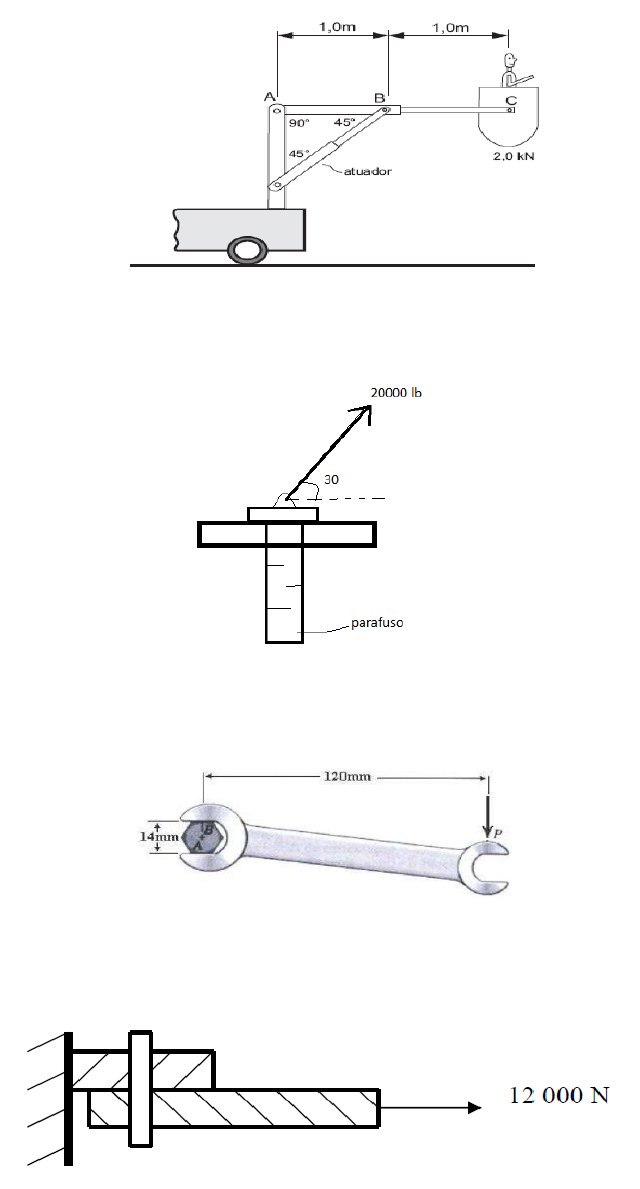 Revisão básica de RM I - Lista (Casa da moeda). A figura acima move um veículo de manutenção de vias urbanas com estrutura constituída por um braço ABC rotulado em A com uma caçamba em sua extremidade. Este braço é acionado por um atuador linear cuja seleção é realizada levando em conta a carga a ser suportada. Considere que a carga total referente a um operário e a caçamba seja de 2 kN e despreze o peso da estrutura Na posição indicada na figura, as forças atuantes no atuador e no pino A, respectivamente, em kN, valem? 1 - Uma força de 20000 lb é aplicada com um ângulo de 30° na estrutura ilustrada abaixo. Qual deve ser o diâmetro de um parafuso feito de um tipo de aço A para que ele não se rompa? Dado: 2 - O torque de 24N.m é necessário para girar o parafuso em torno de seu eixo. A força P necessária para girar este parafuso é: 3 - Calcular a tensão no pino que une as duas chapas do esquema abaixo (em Pa). O diâmetro do pino é 15 mm. 4 - A barra mostrada na figura tem seção transversal quadrada para a qual a profundidade e a largura são de 40 mm. Supondo que seja aplicada uma força axial de 800 N ao longo do eixo do centróide da área da seção transversal da barra, determinar a tensão normal média e a tensão de cisalhamento média que atuam sobre o material a) no plano de seção a – a e b) no plano de seção b – b. 5 - Observe a figura abaixo, que representa uma barra circular sendo submetida a uma força axial F, e responda à questão de número Sabendo-se que a tensão de ruptura é σR, o coeficiente de segurança contra ruptura do material vale n, e o diâmetro da barra é Ø, a força axial máxima Fmáx que pode ser aplicada é: 6 - A viga da figura abaixo é engastada de um lado e livre do outro. Desprezando o peso da viga, a força cortante mínima e o momento fletor mínimo são, respectivamente? Explique sua resposta Transpetro Considere o dispositivo de estampagem manual da figura abaixo. Se o operador do dispositivo aplica uma força F = 300 N à alavanca, a força da ferramenta de estampagem sobre a chapa, expressa em Newtons, vale? 7 - Para a viga sem peso mostrada na figura acima, o valor do momento fletor no ponto (B) de aplicação da força P e do esforço cortante no ponto (A) são, respectivamente: Transpetro A estrutura treliçada de apoio de um oleoduto é construída de vários suportes, conforme mostrado na figura. Considerando que cada suporte sustenta um tubo de duto de peso P e que todas as barras possuem a mesma seção transversal A, a intensidade de maior tensão normal atuante na estrutura ocorrerá em que barra? E qual o valor? Petrobras A figura abaixo mostra uma seção longitudinal em corte de um vaso cilíndrico pressurizado, cujas extremidades são fechadas por flanges, onde 12 parafusos de cada lado estão igualmente espaçados, considerando-se que cada parafuso possa resistir a uma força máxima de 10 π kN sem que o limite elástico do material seja ultrapassado, a pressão máxima, em kPa, do fluido no interior do vaso deve ser de? BR Petrobras A treliça de 3 barras da estrutura mostrada na figura está sujeita à carga F aplicada no pino C. Nesta situação, a força de compressão atuante na barra AB vale? (A) F cotgθ. (B) F tgθ. (C) (F/2) tgθ. (D) (F/2) cotgθ. (E) (F/2) senθ. Eletronorte O esforço na barra AB da figura a seguir é igual a: A) FAB = 0 kN; B) FAB = 40 kN; C) FAB = 40 kN; D) FAB = 20 kN; E) FAB = 20 kN. EPE A treliça de duas barras mostrada na figura possui dois elementos (AC e BC) cujas áreas de seção transversal são idênticas. Considerando uma área A para as seções transversais de cada barra, a tensão normal atuante nos elementos da treliça quando a carga P é aplicada, vale?