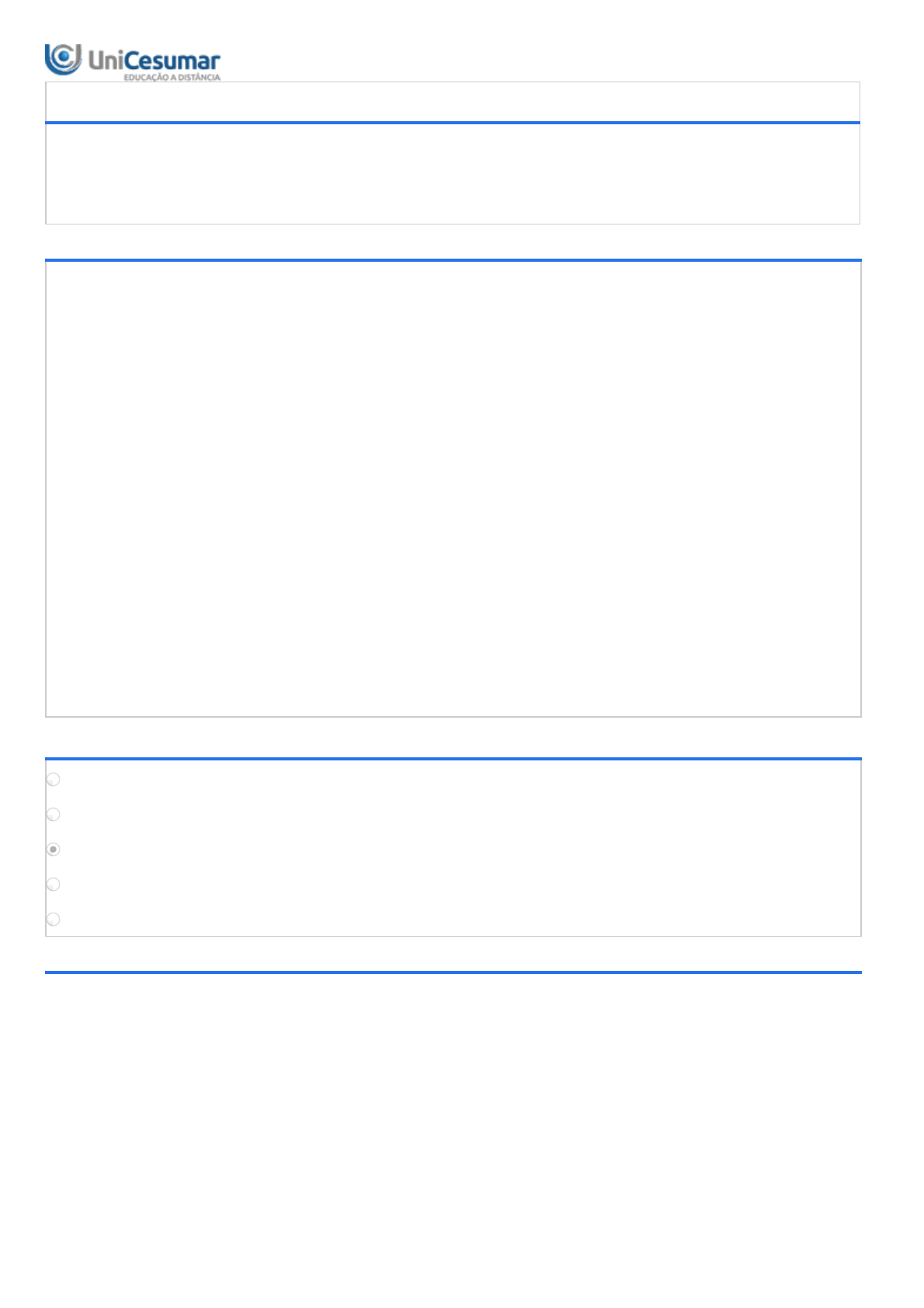 12/9/2018 Unicesumar - Ensino a Distância 1/6 PROVA GO - IDENTIFICAÇÃO DE OPORTUNIDADES - 2018D Período:09/12/2018 08:00 a 16/12/2018 23:59 (Horário de Brasília) Status:ABERTO Nota máxima:6,00 Gabarito:Gabarito será liberado no dia 23/12/2018 00:00 (Horário de Brasília) Nota ob�da: 1ª QUESTÃO As empresas contemporâneas podem ser denominadas como organizações do conhecimento ou organizações de aprendizagem. Isso porque as empresas hoje precisam valorizar o conhecimento e a aquisição de saberes. Nesse contexto, qualquer profissional em todo tipo de segmento e nível hierárquico necessita desenvolver habilidades e comportamentos específicos, como: I - Aprender a aprender: O profissional de hoje precisa estar disposto a entender, aprender, buscar novos conhecimentos e pensar de forma criativa em soluções para as questões que se apresentam no dia a dia da organização. II - Desenvolver conhecimento manual tradicional: conhecer e utilizar tecnologias, apesar de ser um conhecimento desnecessário em determinadas funções. III - Comunicar-se e ser colaborativo: como as empresas valorizam o trabalho em equipe, as pessoas precisam desenvolver a habilidade de se comunicar e colaborar umas com as outras. IV - Ser criativo e solucionar problemas: as organizações esperam que as pessoas descubram por si mesmas como aprimorar o trabalho e torná-lo mais ágil. É correto o que se afirma em: ALTERNATIVAS I, e III, apenas. II e III, apenas. I, III e IV, apenas. II, III e IV, apenas. I, II, III e IV. 2ª QUESTÃO 12/9/2018 Unicesumar - Ensino a Distância 2/6 Todas as culturas têm o trabalho na origem, uma vez que é por ele que os humanos se constroem como humanos. Portanto, é o trabalho que viabiliza o exercício e o usufruto da cidadania. Com base nos conceitos de trabalho, avalie as asserções a seguir e a relação proposta entre elas: I - O trabalho remunerado, assalariado, permite ao indivíduo reconhecer sentido de sua própria existência e identidade social, por meio de uma profissão que lhe permite participar de uma rede de relações e de intercâmbios. PORQUE II - Por meio dele, uma pessoa é equiparada a outras e assume sobre outros certos direitos e deveres sociais (direitos trabalhistas, dever de promover dignidade no trabalho, dever de conferir tratamento ético, etc.) Acerca dessas asserções, assinale a alternativa correta: ALTERNATIVAS As asserções I e II, são proposições verdadeiras e a II não é uma justificativa da I. As asserções I e II, são proposições verdadeiras e a II é uma justificativa da I. A asserção I é uma proposição falsa e a II, uma proposição verdadeira. A asserção II é uma proposição falsa e a I, uma proposição verdadeira. As asserções I e II, são proposições falsas. 3ª QUESTÃO Muitos profissionais apresentam ampla formação e experiência em determinada atividade. Contudo, deixam a desejar quando o quesito é aprendizagem. Independente do conjunto de habilidades ou requisitos que um cargo exige, o atributo mais importante é a capacidade e a vontade de aprender. Por meio da aprendizagem, treinamento e dedicação, podemos desenvolver as demais habilidades. Sobre as habilidades e comportamentos necessários para o contexto atual de mercado de trabalho, relacione as colunas a seguir: 1 - Utilizar da empatia. 2 - Comprometimento. 3 - Iniciativa e Proatividade. 4 - Desenvolver habilidades de liderança. ( ) Como o sucesso da organização depende em grande parte das pessoas, a presença de líderes que sejam para elas fonte de inspiração é muito importante. ( ) A capacidade de entender e respeitar os outros, estando aberto, disposto a compreender e aceitar um ponto de vista diferente do seu. ( ) Capacidade de agir espontaneamente diante de uma situação que exija ação. Agir de forma antecipada evitando o surgimento de problemas e erros. ( ) Significa fazer o que for preciso para alcançar os resultados, tudo aquilo que se faz além do esperado ou solicitado, é o toque especial que surpreende. Assinale a sequência correta: ALTERNATIVAS 12/9/2018 Unicesumar - Ensino a Distância 3/6 1-2-3-4. 3-2-1-4. 3-4-1-2. 4-1-3-2. 4-3-1-2. 4ª QUESTÃO A prática do empreendedorismo permite ao indivíduo a criação de novos negócios, seja na indústria, no varejo ou em serviços tanto no âmbito físico quanto digital. A necessidade ou iniciativa de empreender pode ocorrer por dois motivos básicos: o empreendedorismo por necessidade e o empreendedorismo por oportunidade. Com base nos estudos sobre os dois tipos de empreendedorismo, avalie as asserções a seguir e a relação proposta entre elas: I - O empreendedorismo por necessidade ocorre quando o profissional age de forma consciente e planejada, alcança sua realização pessoal, independência financeira e maior flexibilidade em termos de liberdade para agir. PORQUE II - O empreendedorismo por oportunidade é uma consequência do empreendedorismo por necessidade, pois ocorre quando existe a dificuldade de recolocação no mercado de trabalho e o profissional acaba empreendendo como forma de conseguir sua subsistência. Acerca dessas asserções, assinale a alternativa correta: ALTERNATIVAS As asserções I e II, são proposições verdadeiras e a II não é uma justificativa da I. As asserções I e II, são proposições verdadeiras e a II é uma justificativa da I. A asserção I é uma proposição falsa e a II, uma proposição verdadeira. A asserção II é uma proposição falsa e a I, uma proposição verdadeira. As asserções I e II, são proposições falsas. 5ª QUESTÃO Alguns estudos indicam que os adultos utilizam uma menor percentagem do potencial criativo que as crianças. Em parte, isso pode acontecer por que, com o crescimento, as pessoas encontram maiores restrições aos seus comportamentos e estas diminuem o espaço para o processo criativo. Alguns autores questionam o papel da educação formal sobre a criatividade, porque o modelo