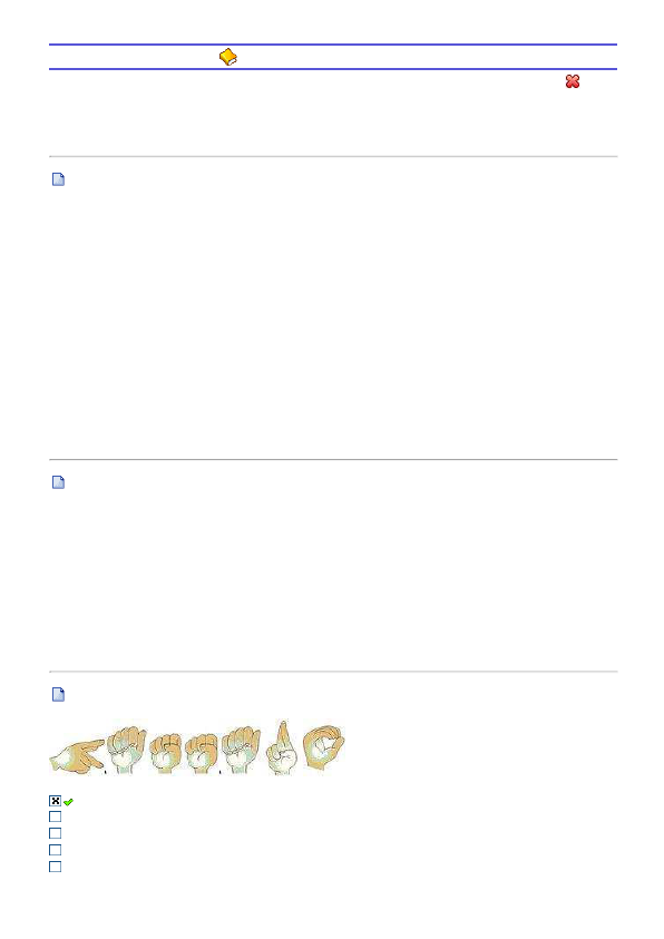 16/04/2015 BDQ Prova http://simulado.estacio.br/bdq_simulados_ead_ens_preview.asp?cript_hist=1278830016 1/4 TÓPICOS EM LIBRAS:SURDEZ E INCLUSÃO Simulado: CEL0284_SM_201301152871 V.1 Fechar Aluno(a): RENATA MENEZES MESQUITA Matrícula: 201301152871 Desempenho: 5,0 de 8,0 Data: 16/04/2015 15:43:12 (Finalizada) 1a Questão (Ref.: 201301406774) Um adolescente surdo estuda em uma escola inclusiva e cursa o 8° do Ensino Fundamental. A escola contrato um intérprete de LIBRAS para interpretar as atividades didático pedagógicas e culturais para ele. Só que ao se referirem sobre eles, seus colegas da escola e muitos professores usam muitos mitos que expressam equívocos sobre as pessoas surdas e sua língua, os quais foram construídos socialmente. Com base nesse caso, responda, em até 3 linha para cada item, as seguintes perguntas: a) O que são mitos? b) Quais os mitos mais comuns sobre as pessoas surdas e a LIBRAS? c) Que ações a escola deve tomar para que esses mitos sejam desconstruídos? Sua Resposta: v Compare com a sua resposta: É uma narração equivocada, uma representação fantasiosa que reconhece o proferidor do discurso como autoridade sobre aquilo que foi dito e que são inverdades acerca de quem se fala. Dentro dessa premissa, os mitos relacionados aos surdos e aos deficientes causam impactos desastrosos visões errôneas. Exemplos: mudo, mudinho, doente, retardado, nervoso. linguagem de sinais, gestos, mímica. Através de programas e eventos para conscientizar as pessoas leigas (ouvintes) que os surdos formam uma comunidade autêntica de língua, cultura e identidade , que a LIBRAS é uma língua com estrutura gramatical altamente complexa e que tais mitos criam estereótipos sobre os surdos e sobre a LIBRAS. 2a Questão (Ref.: 201301778407) Na perspectiva da Educação Bilíngue, qual status linguístico e político que a língua brasileira de sinais assume para o surdo sinalizante? Sua Resposta: v Compare com a sua resposta: A língua brasileira de sinais é considerada a primeira língua do surdo sinalizante brasileiro enquanto o português é a sua segunda língua. A própria lei de LIBRAS assume a língua de sinais como meio oficial de comunicação dentro da comunidade surda. 3a Questão (Ref.: 201301778511) Pontos: 1,0 / 1,0 em datilologia completa o provérbio: Mais vale um ___________ na mão do que dois voando. Água mole __________ dura tanto bate até que fura. Nem que a _______ tussa. Casa que todos mandam quem tem __________ obedece. Dinheiro na mão é _____________. 16/04/2015 BDQ Prova http://simulado.estacio.br/bdq_simulados_ead_ens_preview.asp?cript_hist=1278830016 2/4 4a Questão (Ref.: 201301778525) Pontos: 1,0 / 1,0 Na datilologia abaixo temos a palavra: Maracujá Melancia Mecânico Margarida Maracanãs 5a Questão (Ref.: 201301778341) Pontos: 1,0 / 1,0 Nas comunidades sinalizantes é hábito apresentar-se não somente informando o nome, mas também com um SINAL. Esse SINAL pode ser entendido como uma espécie de "batismo" dentro dessas comunidades. Desse modo é correto afirmar que: O SINAL de batismo refere-se a uma característica socioeconômica das pessoas surdas, somente. Nas comunidades surdas sinalizantes somente os surdos podem ter SINAL pessoal e por meio dele são conhecidos. Essa característica não se aplica aos ouvintes. Cada pessoa tem um SINAL próprio que faz referência a alguma característica particular dela (somente referência física; física com a primeira letra do nome; um evento marcante etc.). O SINAL é um apelido que os surdos dão aos ouvintes como forma de zombar das pessoas que não sabem LIBRAS. Nas comunidades surdas o SINAL de batismo na apresentação pessoal não é tão significativo, já que a pessoa apresenta o seu nome de registro. 6a Questão (Ref.: 201301778509) Pontos: 1,0 / 1,0 Marque a alternativa correta em que a datilologia abaixo apresentada corresponde ao nome de um eletrodoméstico: Ventilador Circulador Batedeira Aspirador Geladeira 7a Questão (Ref.: 201301778508) Pontos: 0,0 / 1,0 Algumas perspectivas para o auxílio da educação de surdos foram tomadas em relação a este processo. Atualmente há a possibilidade de contratação de um profissional bilíngue (língua de sinais e língua portuguesa) que atua na interpretação/ tradução dos conteúdos curriculares e atividades acadêmicas, envolvidas na escola. Sua função 16/04/2015 BDQ Prova http://simulado.estacio.br/bdq_simulados_ead_ens_preview.asp?cript_hist=1278830016 3/4 principal é a de permitir o acesso às informações veiculadas, principalmente, em sala de aula, no mesmo nível e complexidade que as recebem os demais alunos, dadas as características deste profissional, estamos diante de um: Professor de ensino regular Professor Instrutor de LIBRAS Professor especializado Professor intérprete Professor Itinerante 8a Questão (Ref.: 201301408216) Pontos: 0,0 / 1,0 São aspectos culturais da comunidade surda sinalizante: Literatura Surda, Organização Política, Língua, Homogeneização e Vida Social. Literatura Surda, Estereótipo, Língua, Artes Visuais e Vida Social. Literatura Surda, Organização Política, Língua, Artes Visuais e Vida Social. Literatura surda, Mímica, Língua, Artes Visuais e Vida social. Literatura Surda, Oralização, Língua, Artes Visuais e Vida Social. Gabarito Comentado. 9a Questão (Ref.: 201301778476) Pontos: 1,0 / 1,0 O termo sujeito sinalizante, usado nesta disciplina, faz referência: Aos surdos, suas famílias e a alguns surdos oralizados. A toda e qualquer pessoa surda. A todo sujeito que domina e é usuário assíduo da língua de sinais. Aos surdos que aprenderam a língua de sinais em casa. Aos professores que usam LIBRAS. 10a Questão (Ref.: 201301778480) Pontos: 0,0 / 1,0 Signwriting torna-se mais um artefato da chamada cultura surda. Sendo assim, além de ter sua língua representada graficamente pelo sistema de escrita, por esse artefato tem-se que: À cultura surda não possui val