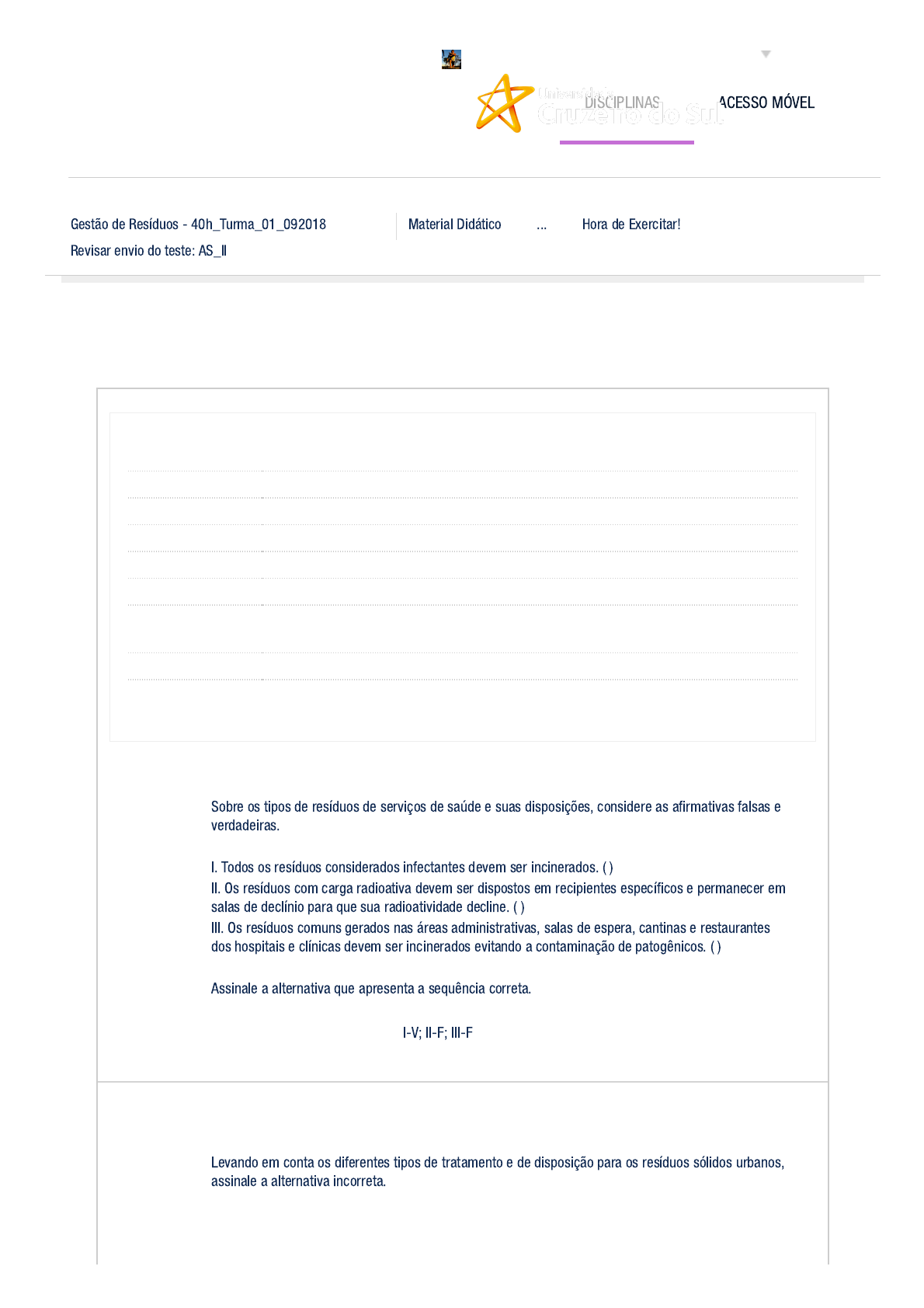 30/09/2018 Revisar envio do teste: AS_II – Gestão de Resíduos - ... https://bb.cruzeirodosulvirtual.com.br/webapps/assessment/review/review.jsp?attempt_id=_37358392_1&course_id=_526337_1&content_id=_41… 1/2 Gestão de Resíduos - 40h_Turma_01_092018 Material Didático ... Hora de Exercitar! Revisar envio do teste: AS_II REVISAR ENVIO DO TESTE: AS_II Usuário Gilson Alves de Azevedo Ferreira CRUZ_EAD_Engenharia Ambiental (Bacharelado)_6A_20182 Curso Gestão de Resíduos - 40h_Turma_01_092018 Teste AS_II Iniciado 30/09/18 00:41 Enviado 30/09/18 00:49 Status Completada Resultado da tentativa 0,25 em 1 pontos Tempo decorrido 7 minutos Resultados exibidos Respostas enviadas Pergunta 1 Resposta Selecionada: b. Sobre os tipos de resíduos de serviços de saúde e suas disposições, considere as afirmativas falsas e verdadeiras. I. Todos os resíduos considerados infectantes devem ser incinerados. ( ) II. Os resíduos com carga radioativa devem ser dispostos em recipientes específicos e permanecer em salas de declínio para que sua radioatividade decline. ( ) III. Os resíduos comuns gerados nas áreas administrativas, salas de espera, cantinas e restaurantes dos hospitais e clínicas devem ser incinerados evitando a contaminação de patogênicos. ( ) Assinale a alternativa que apresenta a sequência correta. I-V; II-F; III-F Pergunta 2 Resposta Selecionada: b. Levando em conta os diferentes tipos de tratamento e de disposição para os resíduos sólidos urbanos, assinale a alternativa incorreta. DISCIPLINAS ACESSO MÓVEL 0 em 0,25 pontos 0 em 0,25 pontos Gilson Alves de Azevedo Ferreira CRUZ... 30/09/2018 Revisar envio do teste: AS_II – Gestão de Resíduos - ... https://bb.cruzeirodosulvirtual.com.br/webapps/assessment/review/review.jsp?attempt_id=_37358392_1&course_id=_526337_1&content_id=_41… 2/2 Domingo, 30 de Setembro de 2018 01h16min10s BRT Os lixões continuam sendo a única opção de destinação dos resíduos urbanos para muitos municípios. Pergunta 3 Resposta Selecionada: c. Considerando os resíduos de serviços de saúde – RSS, a sigla do órgão nacional responsável por publicar as diretrizes para o correto manuseio e disposição deles é: CONAMA – Conselho Nacional de Meio Ambiente Pergunta 4 Resposta Selecionada: d. Em relação aos resíduos sólidos urbanos, podemos afirmar: I. Atualmente, a matéria orgânica representa em torno de 50% da composição dos resíduos urbanos. II. A quantidade média de lixo produzido por habitante, nos centros urbanos, é em torno de 5 kg/dia (cinco quilos por dia). III. A incineração, em termos ambientais, é a melhor alternativa para a destinação dos resíduos urbanos, pois não gera nenhum resíduo em seu processo. IV. Muitos municípios brasileiros ainda carecem de aterros sanitários para a destinação de seus resíduos. V. A coleta seletiva é uma pratica que prolonga a vida útil dos aterros sanitários. Considerando as afirmativas acima expostas, assinale a alternativa correta? Somente as afirmativas I, IV e V são verdadeiras. ← OK 0 em 0,25 pontos 0,25 em 0,25 pontos