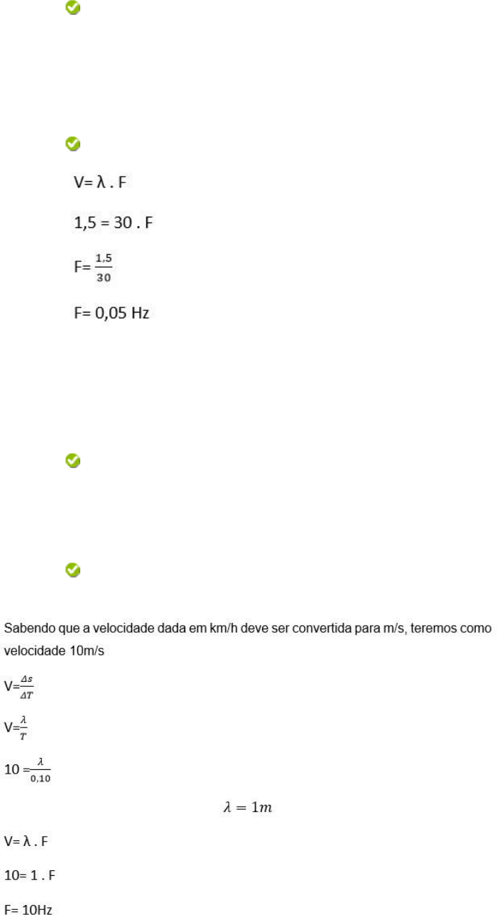 INTERFACES DA MATEMÁTICA COM A FÍSICA: OSCILAÇÕES E ONDAS - AS_III Pergunta 1 0,175 em 0,175 pontos Um pequeno barco a pilhas é colocado sob as águas de uma piscina e, ao ser ligado, produz uma vibração na superfície da água, onde ondas de comprimento 30cm se propagam com uma velocidade de 1,5m/s. Qual é a frequência dessas ondas? Resposta Selecionada: e. 0,05 Hz Respostas: a. 0,10 Hz b. 0,20 Hz c. 0,12 Hz d. 0,15 Hz e. 0,05 Hz Feedback da resposta: Pergunta 2 0,175 em 0,175 pontos Sendo uma onda que apresenta período de 0,10s e uma velocidade de 36km/h. Sabendo que a distância percorrida pela onda será seu comprimento, Determine a frequência dessa onda nessas condições. Resposta Selecionada: d. 10 Hz Respostas: a. 7 Hz b. 12 Hz c. 15 Hz d. 10 Hz e. 5 Hz Feedback da resposta: Pergunta 3 0,175 em 0,175 pontos Por um fio, que se encontra esticado, propaga-se uma onda com frequência de 40Hz e uma velocidade de 20m/s. Determine o comprimento da onda que se propaga por este fio. Resposta Selecionada: a. 0,50m Respostas: a. 0,50m b. 0,25m c. 1,0m d. 1,25m e. 0,75m Feedback da resposta: Pergunta 4 0,175 em 0,175 pontos Sob a superfície de uma piscina, temos ondas períodicas formadas pelo sistema de limpeza através de jatos submersos. Considerando que essas ondas se propagam com uma velocidade de 14,4Km/h e com comprimento de 150 centímetros, determine a frequência dessa onda. Resposta Selecionada: a. 2,66 Hz Respostas: a. 2,66 Hz b. 2,15 Hz c. 3,35 Hz d. 1,5 Hz e. 3,05 Hz Feedback da resposta: