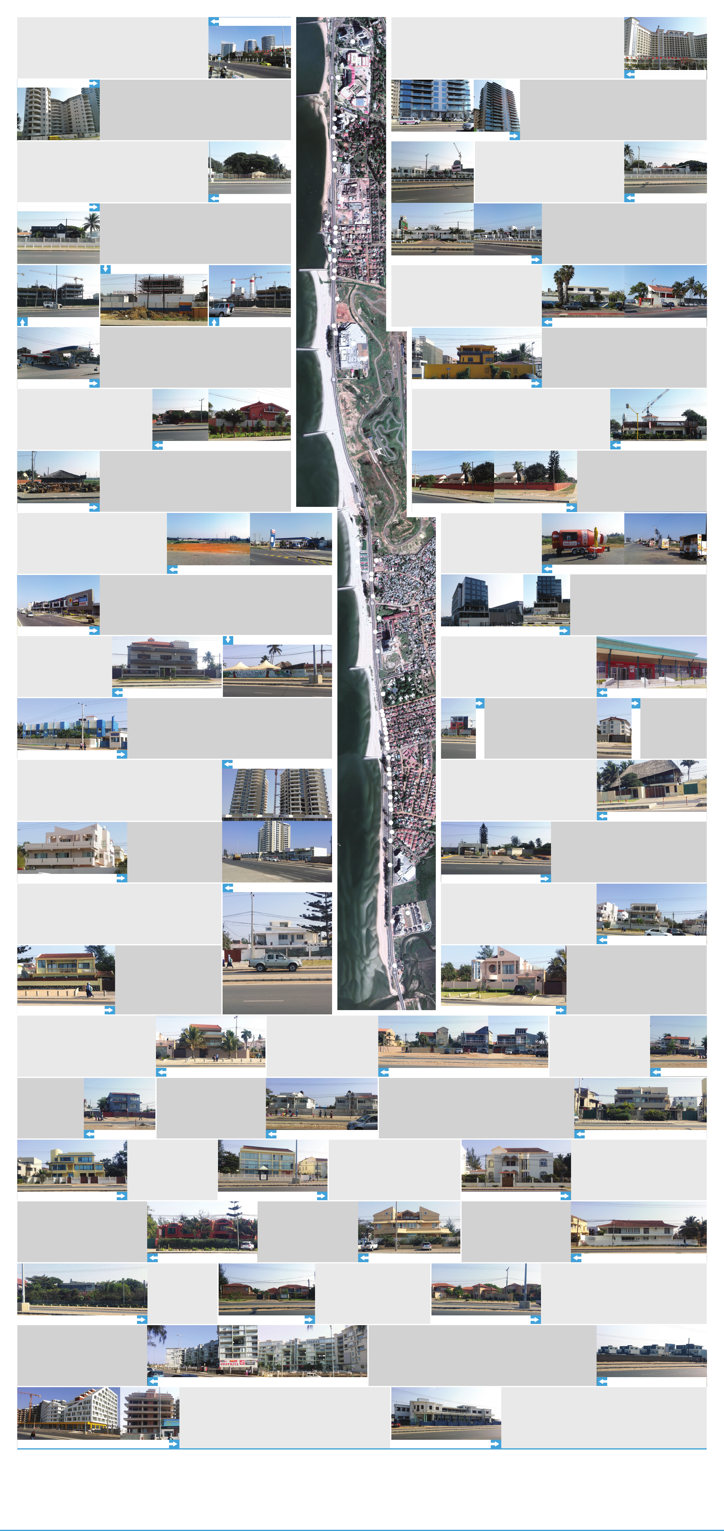 A Radisson Blue é uma cadeia internacional de hotéis e resorts de serviço completo para a Radisson Hotels, principalmente fora dos Estados Unidos, incluindo os da Europa, África e Ásia. Em Maputo, foram construídos três edifícios em períodos diferentes sendo, o primeiro, de Hotel (2012) e as duas outras Torres (2016) a seguir, um de escritórios e outro habitacional. As formas das duas torres novas foram inspiradas nas ondas do mar, as fachadas são transparentes com vista ao mar, características da arquitectura moderna onde, a estrutura e separada da fachada. O grupo Rani Investment, do Dubai, investiu 206 milhões de dólares e foi projectado pelo escritório DSA Architects International. Edifício Karibu é um edifício de apartamentos construído ao lado do centro de conferências Joaquim Chissano, apresentando um baseamento apoiado a terra, sem transparência e um volume com simetria de rotação na fachada frontal. O aspecto exterior do edifício é caracterizado por apresentar pequenas aberturas e formas curvilíneas tímidas. O piso térreo foi parcialmente vazado para usar-se como estacionamento e a sua materialidade é muito minimalista (vidro e alvenaria de cimento). O edifício foi construído pela construtora Toprak, concluído em 2017. A Casa de Peixe é um restaurante situado em Maputo, conhecido pelos seus fantásticos pratos de marisco e peixe, e também pelo frango saboroso feito à maneira moçambicana. Possui uma esplanada onde os clientes se sentam e um edifício principal com cobertura de duas águas, isto é, ataque ao céu do tipo Recuperação do tecto Archetipo. O restaurante está implantado de tal forma que não consegue ter uma vista para o mar mas desfruta das brisas marítimas e da grande sombra criada por duas mangueiras. Coconuts é um edifício caracterizado principalmente pelo contraste no uso de tons claros e escuros, composto por matérias orgânico, que define a sua forma e dão um aspecto de leveza e um ambiente mais fresco no seu interior. Pela vista frontal, não se percebe a cobertura metálica em forma de abóboda pois, o projectista não quis adaptar a forma a função. O complexo Coconuts Live possui um Pool Bar que fica junto da piscina e que é palco para muitas festas em Maputo. Pode, neste local, encontrar djs de variados ritmos e nacionalidades. Esta discoteca já foi uma das casas que tinha constantemente eventos marcados, mas actualmente é utilizado apenas em algumas ocasiões. Posto de abastecimento Tsangano é uma instalação de venda de combustível (fornecido pela Petromoc) e lubrificantes para veículos a motor (fornecidos pela Sansol). Este posto de abastecimento é composto por uma Boutique de vendas de lubrificantes, loja de conveniências, área de serviços para o staff, e uma área de abastecimento composta por uma cobertura em levitação, suportada por três colunas metálicas. O edifício composto por uma cobertura inclinada de duas abas e apresenta também cobertura habitável com uma varanda saliente. Por possuir poucas e pequenas aberturas voltada para o mar, conclui-se que estas residências são mais voltadas para o interior. Na rua, há um pequeno jardim decorativo composto de relvado, pequenos arbustos e alguns elementos verticais que impedem os veículos de estacionarem e garantem uma separação entre o espaço público do privado. Posto de abastecimento ENGEN é uma instalação de venda de combustível e lubrificantes para veículos a motor. Este posto de abastecimento é composto por uma Boutique de vendas de lubrificantes, loja de conveniências, área de serviços para o staff, e uma área de abastecimento composta por uma cobertura em levitação, suportada por três colunas metálicas. Cabana é denominada dada a moradia construída artesanalmente, muitas vezes de frágil constituição. É um tipo de casa geralmente localizada fora dos centros urbanos, construída essencialmente a partir de técnicas e matérias-primas locais, isto é, caniço e bambu. É usada tanto como moradia quanto para acomodação turística. Cabana também é um termo utilizado para se referir a construções militares para estabelecimento temporário. Arte de escultura Maconde é uma loja de venda de estatuetas e diversas peças que compõem esta cabana em frente a avenida Marginal. É um centro comercial na cidade de Maputo, que esta estrategicamente localizado ao longo da zona turística da faixa costeira. O edifício ostenta a arquitectura do movimento moderno, com efeitos de lambril, criando sensação de escuro (preto) claro (branco), desenvolvendo-se horizontalmente ao longo da avenida. Reentrâncias e saliências na fachada proporcionam ritmo e movimento da fachada. O Mall foi construído pela empresa sul-africana SS Construções, concluída em 2018. O projecto Baia Mall é promovido pela ATCM (Automobile & Touring Clube de Moçambique) em parceria com a Actis e RPP Developments, tem uma área total de 30.000 m2 e inclui um hotel, mais de 100 lojas e restaurantes, uma área de serviço e mais de 900 lugares de estacionamento. O investimento total atinge os 90 milhões de euros e o projeto deverá criar mais de 2.500 empregos. Clube Sixtys é um edifício caracterizado pelo seu telhado colonial de quatro águas, uma das principais marcas da arquitectura antiga Portuguesa. Este telhado desempenha um papel importante porque é um dos elementos de composição da fachada, junto com a caleira de betão que cria um efeito de horizontalidade. Restaurante & Grill Mar na Brasa localiza-se ao longo da marginal apesar de não ter vista para o mar, é um dos lugares favoritos das pessoas para comer marisco. O edifício não possui grandes elementos de composição arquitectónicos em sua fachada, é bastante simples com poucas aberturas. Contudo, a preocupação paisagística é evidente pela existência de pequenos arbustos de palmeira que criam uma barreira para que os transeuntes não aproximem as janelas e, a entrada, 