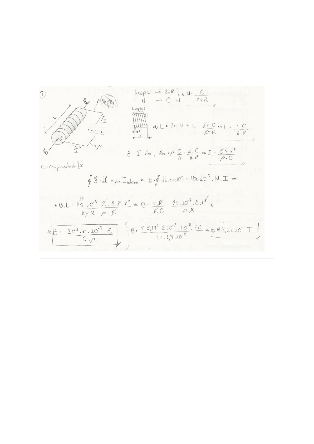 Exercícios - Física 1) Um solenóide de raio R=1,7*(10^-02) m é feito de um pedaço longo de fio de raio r=2,00*(10^-03) m, comprimento l=13,77 m e resistividade r=1,28*(10^-03) Ω.m. (Observe que o comprimento do solenóide é muito maior que o raio e que há apenas uma camada de enrolamentos do fio para formar o solenóide.) Encontre o campo magnético no centro do solenóide se o fio for conectado a uma bateria que tem uma fem de E=20,00 V. Use π=3,14. 2) Têm sido sugerido aceleradores de projéteis para lançar cargas ao espaço sem usar foguetes químicos e também como armas de guerra terra-ar anti-mísseis. Um modelo portátil de acelerador de projéteis (Figura P22.60 do livro) consiste em dois trilhos horizontais paralelos e longos separados por uma distância de d=1,56*(10^-02) m, conectados por uma barra BD de massa m=4,00*(10^-03) kg. A barra está originalmente em repouso no ponto médio dos trilhos e está livre para deslizar sem atrito. Quando a chave é fechada, forma-se rapidamente uma corrente elétrica no circuito ABCDEA. Os trilhos e a barra têm baixa resistência elétrica e a corrente é limitada a um valor constante de I=27,00 A pela fonte de alimentação. Encontre a velocidade da barra após ela ter se deslocado por 130 cm em direção ao final do trilho. OBS: a resposta desse problema será diferente depois de estudarmos a lei de Faraday, não considere a lei de Faraday, apenas use os resultados do capítulo 22. Use π=3,14 e de a resposta em m/s. Use apenas a força calculado no centro da barra para dar sua resposta. 3) Uma espira de fio na forma de um retângulo de largura w=1,00*(10^-01) m e comprimento L=1,00 m e um fio longo e reto, que conduz uma corrente I e está a uma distância h=1,00*(10^-02) m da espira, encontram-se sobre uma mesa. Primeiramente determine o fluxo magnético através da espira devido à corrente I. Suponha que a corrente esteja variando com o tempo de acordo com I=a+bt, onde a e b são constantes. Determine a fem induzida da espira se b=14,00 A/s. De a resposta em Volts. 4) Considere a montagem mostrada na Figura P23.10 do livro. Suponha que R=R1=7,00 ohms, l=L1=1,6 m e que um campo magnético uniforme de B1=3,2 T está orientado para dentro da página. Com que velocidade v a barra deve ser deslocada para produzir uma corrente de I1=0,5A no resistor? De a resposta em m/s. 5) Uma haste condutora de comprimento l se desloca sobre dois trilhos horizontais, sem atrito, como mostrado na figura P23.10. Se uma força constante de F1=1,00 N movimentar a barra a v1=2,10 m/s através de um campo magnético B que esteja orientado para dentro da página, qual é a corrente no resistor R de R1=8,00 Ω? 6) Uma bobina retangular de resistência R1=19,00 Ω tem N1=420,00 espiras, cada uma com comprimento L1=1,76*(10^-02) m e largura w1=1,00*(10^-02) m, como mostrado na figura. A bobina desloca-se para dentro de um campo magnético uniforme de B1=0,5 T com velocidade constante v1=30,00 m/s. Qual a magnitude da força magnética total F sobre a bobina enquanto sai do campo? De a resposta em N. 7) Para a situação mostrada na figura P23.21 do livro, o campo magnético na região circular varia com o tempo de acordo com a expressão B = a1 t^3 - b1 t^2 + c1, sendo a1=1,17 T/s^3, b1=2,83 T/s^2, c1=0,66 T, r_2=2R, R=R1=1,90e-02 m. Calcule a magnitude da força exercida sobre um elétron situado no ponto P_2 quando t=t1=1,38 s. De a resposta em N e use que a carga do elétron é 1,6*(10^-19) C. 8) A corrente em um indutor de L1=6,22*(10^-02) H varia com o tempo como I= t^2 - a1 t, onde a1=4,10 em unidades SI. Encontre a magnitude da fem induzida em t= t1=1,34 s. De a resposta em Volts. 9) Uma bobina toroidal tem raio maior R= R1=1,77 m e um raio menor r= r1=6,1*(10^-02) m e é enrolada com N=N1=340,00 espiras de fio bem próximas entre si, como mostrado na figura. Como R>>r, o campo magnético dentro da região do toro é essencialmente o campo de um solenóide longo que tenha sido curvado na forma de um círculo grande de raio R. Modelando o campo como sendo uniforme dentro do solenóide longo, calcule a auto-indutância dessa bobina toroidal. Use π=3.14 e de a resposta em H. 10) Algumas bactérias (como por exemplo a Aquaspirillum magnetotacticum) tendem a nadar em direção ao polo norte geográfico da Terra pois elas contém pequenas partículas, chamadas de magnetossomos, que são sensíveis à campos magnéticos. Se uma linha de transmissão carregando I=100,00 A é colocada sob a água, até que distância da linha o seu campo magnético seria suficiente para interferir com a migração das bactérias? Assuma que um campo menor do que p=5,00 porcento do campo magnético da Terra (B=5,0*(10^-5) T) tem efeito desprezível na bactéria. Dê sua resposta em m. 11) Considere dois fios muito longos e paralelos dispostos ortogonalmente ao plano xy. O primeiro fio tem uma corrente I=5,00 A e é colocado nas coordenadas x=0 e y=a=0,63 m. Já o segundo fio é colocado nas coordenadas x=0, y=-a e tem corrente -I. Qual a intensidade do campo magnético que esses fios produzem em x=d=0,24 m e y=0? Dê sua resposta em T. 12) Uma barra de comprimento L=0,20 m, inicialmente em repouso, está livre para deslizar sem atrito entre dois trilhos metálicos horizontais e paralelos. Existe um campo magnético uniforme B=2,17 T entrando no plano definido pelos trilhos. No instante t=0 uma das extremidades dos trilhos é submetida a uma diferença de potencial de V=12,99 V. A barra tem uma resistência R=7,45 Ω, massa m=0,55 kg e todas as outras resistências no circuito podem ser desprezadas. Qual a aceleração da barra em t=0? Dê a sua resposta em m/s^2. 13) Uma barra de comprimento L=0,30 m, inicialmente em repouso, está livre para deslizar sem atrito entre dois trilhos metálicos horizontais e paralelos. Existe um campo magnético uniforme B=1,09 T entrando no plano definido pelos trilhos. No instante t=0 uma das extremidades dos trilhos é submetida a uma d