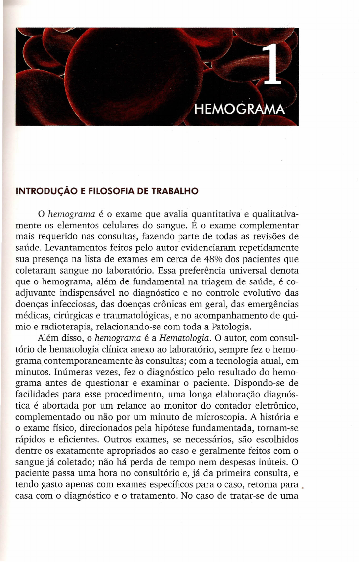 INTRODUÇÃO E FILOSOFIA DE TRABALHO o hemograma é o exame que avalia quantitativa e qualitativa- mente os elementos celulares do sangue. É o exame complementar mais requerido nas consultas, fazendo parte de todas as revisões de saúde. Levantamentos feitos pelo autor evidenciaram repetidamente sua presença na lista de exames em cerca de 48% dos pacientes que coletaram sangue no laboratório. Essa preferência universal denota que o hemograma, além de fundamental na triagem de saúde, é co- adjuvante indispensável no diagnóstico e no controle evolutivo das doenças infecciosas, das doenças crônicas em geral, das emergências médicas, cirúrgicas e traumatológicas, e no acompanhamento de qui- mio e radioterapia, relacionando-se com toda a Patologia. Além disso, o hemograma é a Hematologia. O autor, com consul- tório de hematologia clínica anexo ao laboratório, sempre fez o hemo- grama contemporaneamente às consultas; com a tecnologia atual, em minutos. Inúmeras vezes, fez o diagnóstico pelo resultado do hemo- grama antes de questionar e examinar o paciente. Dispondo-se de facilidades para esse procedimento, uma longa elaboração diagnós- tica é abortada por um relance ao monitor do contador eletrônico, complementado ou não por um minuto de microscopia. A história e o exame físico, direcionados pela hipótese fundamentada, tornam-se rápidos e eficientes. Outros exames, se necessários, são escolhidos dentre os exatamente apropriados ao caso e geralmente feitos com o sangue já coletado; não há perda de tempo nem despesas inúteis. O paciente passa uma hora no consultório e, já da primeira consulta, e tendo gasto apenas com exames específicos para o caso,retorna para. casa com o diagnóstico e o tratamento. No caso de tratar-se de uma 22 Renato Foilace & cols. hemopatia séria, sai, no ato, com pedido de internação no hospital escolhido; quando as alterações hematológicas causais da consulta confirmarem-se decorrentes de doença de outra especialidade, é de- volvido com um laudo ao colega que o enviou ou aos especialistas apropriados. Essa prática simplista de hemograma no ato, tão gratificante, econômica e difícil de se igualar em outras especialidades, pois em nenhuma a biópsia é tão pouco invasiva e o exame tão rápido, deve ser feita com especial atenção, já que o hemo grama varia com a hora e com as condições da coleta, discutidas na p. 28. O hemograma atual é feito em contadores eletrônicos, que aspi- ram o sangue e fazem automaticamente todas as determinações em múltiplos canais. As câmaras para contagem de glóbulos ao micros- cópio, a centrífuga de hematócrito, o colorímetro para hemoglobina, mesmo os contadores eletrônicos com um só canal de contagem e diluição externa do sangue a examinar são peças históricas, relegadas ao museu do laboratório. Apesar da generalização da tecnologia eletrônica, ainda há sig- nificativa variação interlaboratorial, pois o hemo grama depende da qualidade do equipamento, do grau de especialização do pessoal téc- nico, da filosofia de trabalho do laboratório e das tradições locais. Pode variar até por decisões político-econômicas, de acordo com a procedência das requisições: em uma instituição fechada, pode haver um hemograma para o corpo clínico (p. ex., apenas o laudo original da máquina eletrônica) e outro para pacientes e médicos de fora da instituição. Para interpretar o hemograma, há necessidade do conhe- cimento da tecnologia empregada, dos parâmetros" fornecidos, da maneira de expressar os resultados e da correlação com a Patologia - so- bre isso versa o presente livro. Os contadores eletrônicos fornecem um hemograma com todas (ou várias dentre) as determinações feitas diretamente (Tabela 1.1, A) e os parâmetros delas derivados por cálculo, pelo computador (Tabela 1.1, B). Algumas determinações só são fornecidas por equi- • Os dados numéricos, tanto os gerados pelo contador eletrônico (p. ex., conta- gens de glóbulos, VCM, dosagem de hemoglobina), como os calculados a partir destes pelo computador da máquina (p. ex., hematócrito, HCM, histogramas), foram inapropriadamente denominados parâmetros pelos fabricantes desse equipamento. O termo consagrou-se pelo uso. Hemogromo 23 TABELA 1.1 Componente~,do hemograma A) Determinações feitas diretamente pelos contadores eletrônicos Eritrograma Contogem de eritrócitos (E) em milhões (M)IIlL Dosagem de hemoglobina (Hgb) em g/dL Medida do volume dos eritrócitos em fL (média = VCM) Medido da concentração hemoglobínica individual dos eritrócitos (linho Advia) Contagem de reticulócitos (Retics) em % e IIlL (vários modelos top of fine) índices reticulocíticos: maturidade (pela corga de RNA), volume, concen- tração hemaglabínica (idem) Contagem de eritroblastos 1100 leucócitos e IIlL (idem) Leucograma Contagem de leucócitos IIlL Fórmula leucocitária % e IIlL Por volumetria (3 tipos celulares, em contadores de pequeno porte) Por volumetria e citometria em fluxo (5-9 tipos celulares e flags ou estimativas para células anormais, em contadores de grande porte) Determinação da fração leucocitária vióvel (WVF) (top of fine da linha Cell-Dyn) Imunofenotipagem restrita (software especial em alguns modelos top of fine) Ploquetogramo Contagem de plaquetas (Plaq.) IIlL Medida do volume plaquetário (média = VPM) em fL Contagem imunofenotípica das plaquetas (top of fine da linha Cell-Dyn) Contagem de plaquetas reticuladas (top of fine da linha Sysmex) B) Parâmetros derivados pelo computador Hematócrito (Hct): VCM x E Hemoglobina corpuscular média (HCM): Hgb 7 E Concentração hemoglobínica corpuscular média (CHCM): HCM 7 VCM (ou Hgb 7 Hct) Média (CHCM) e desvio-padrão (HDW) das concentrações hemoglobínicas corpusculares individuais (linha Advia) Conteúdo hemoglobínico dos reticulócitos (HCr) (linho Advia) Histogramas: curvas de frequência do volume corpuscular 