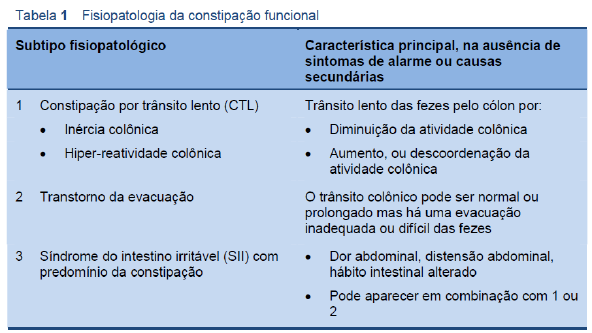 CONSTIPAÇÃO Introdução Na maioria dos casos a constipação crônica é um motivo para consulta que provoca moléstia mas não ameaça a vida nem debilita o indivíduo. Habitualmente, pode ser manejada em nível de atenção primária com controle custo-efetivo dos sintomas. Existem duas fisiopatologias que, em princípio, diferem mas que se superpõem: os transtornos do trânsito e os transtornos da evacuação. Os primeiros podem surgir secundariamente aos segundos, e os segundos em ocasiões podem apresentar-se após os primeiros. Este guia refere-se aos pacientes adultos e não analisa especificamente nem crianças nem grupos especiais de paciente (WGO guideline constipation 2010) Definição Habitualmente, define-se a constipação funcional como um transtorno caracterizado por uma dificuldade persistente para evacuar ou uma sensação de evacuação incompleta e/ou movimentos intestinais infreqüentes (a cada 3–4 dias ou com menor freqüência), em ausência de sintomas de alarme ou causas secundárias. Patogênese A constipação funcional pode ter diferentes causas, que vão desde mudanças na dieta, atividade física ou estilo de vida, até disfunções motoras primárias produzidas por miopatia ou neuropatia colônica. A constipação também pode ser secundária a um transtorno de evacuação. O transtorno de evacuação pode estar associado a uma contração paradoxal ou espasmo involuntário do esfíncter anal, que pode resultar de um transtorno adquirido do comportamento defecatório que ocorre em dois terços dos pacientes. Fatores de risco - Envelhecimento (mas a constipação não é consequência fisiológica do envelhecimento normal); - Depressão; - Inatividade; - Baixa ingestão calórica; - Baixa renda e baixo nível educativo; - Quantidade de medicação recebida (independentemente dos perfis de efeitos colaterais); - Abuso físico e sexual; - Sexo feminino— as mulheres relatam uma maior incidência de constipação do que os homens. Condições e medicações associadas Diagnostico Avaliação dos pacientes O histórico médico e o exame físico nos pacientes com constipação devem focar-se na identificação das possíveis condições causais e sintomas de alarme. · Consistência das fezes. Considerado melhor indicador do tempo de trânsito colônico que a frequência das fezes · Descrição dos sintomas de constipação do paciente; diário de sintomas: - Distensão abdominal, dor, desconforto - Natureza das fezes - Movimentos intestinais - Esforço defecatório prolongado/excessivo - Defecação insatisfatória · Uso de laxantes, passado e presente; frequência e dosagem · Condições atuais, histórico médico, cirurgia recente, doença psiquiátrica · Estilo de vida do paciente, fibra na dieta e ingestão de líquidos · Uso de supositórios ou enemas, outras medicações (de receita o de venda livre) · Exame físico: - Tumoração gastrointestinal - Inspeção anorretal: Impactação fecal, Estenose, prolapso retal, retocele, atividade paradoxal ou não relaxante do músculo puborretal, Tumoração retal · Se estiver indicado: exames de sangue—perfil bioquímico, hemograma completo, cálcio, glicose, e função tireóidea Sintomas de alarme Indicações para os testes de triagem Está indicado realizar estudos de laboratório, imagenologia ou endoscopia e testes funcionais somente nos pacientes apresentando constipação crônica severa ou sintomas de alarme. Medição do trânsito O estudo de retenção de marcadores de 5 dias é um método simples para medir o trânsito colônico que requer a ingestão de marcadores de uma só vez. A realização de uma radiografia simples de abdômen 120 horas após, é suficiente para avaliar o tempo de trânsito colônico através da quantificação dos marcadores presentes. Se persistirem mais de 20% dos marcadores no cólon, significa que o trânsito está retardado. O acúmulo distal dos marcadores pode indicar um transtorno da evacuação e, nos casos típicos de constipação por trânsito lento, quase todos os marcadores se mantêm e se observam tanto no cólon direito como no esquerdo. Várias companhias produzem marcadores, mas estes também podem ser obtidos a partir do corte de um tubo radiopaco, em pequenos pedaços de 2–3 mm de longitude, não apresentando riscos para o paciente. Um número adequado de marcadores (20-24) podem ser incluídos em uma cápsula de gelatina para facilitar sua ingestão Avaliação clínica A classificação da constipação dos pacientes deveria ser possível com base no histórico médico e um correto exame e valoração de laboratório. Tratamento Abordagem sintomática Uma vez estudada e excluída uma constipação orgânica e secundária, a maioria dos casos podem ser manejados adequadamente com uma abordagem sintomática. · A abordagem gradativa do tratamento é baseada na recomendação de mudar o estilo de vida e a dieta, interrompendo ou reduzindo medicações que produzem constipação e administrando suplementos com fibra ou outros agentes formadores de volume. Geralmente, é recomendado um aumento gradual da fibra (seja como suplementos padronizados ou incorporada na dieta) e um aumento da ingestão de líquidos. · O segundo passo na abordagem gradativa é acrescentar laxantes osmóticos. A melhor evidência é utilizar polietilenoglicol, mas também existe boa evidência para a lactulose. As novas drogas lubiprostone e linaclotide atuam estimulando a secreção ileal aumentando assim a água fecal. Prucaloprida também está aprovada em muitos países e na Europa. · O terceiro passo inclui laxantes estimulantes, enemas, e fármacos procinéticos. Laxantes estimulantes podem ser administrados por via oral ou retal para estimular a atividade motriz colorretal. Os fármacos procinéticos também procuram aumentar a atividade de propulsão do cólon, mas ao contrário dos laxantes estimulantes, que devem se tomar ocasionalmente, estes estão desenha