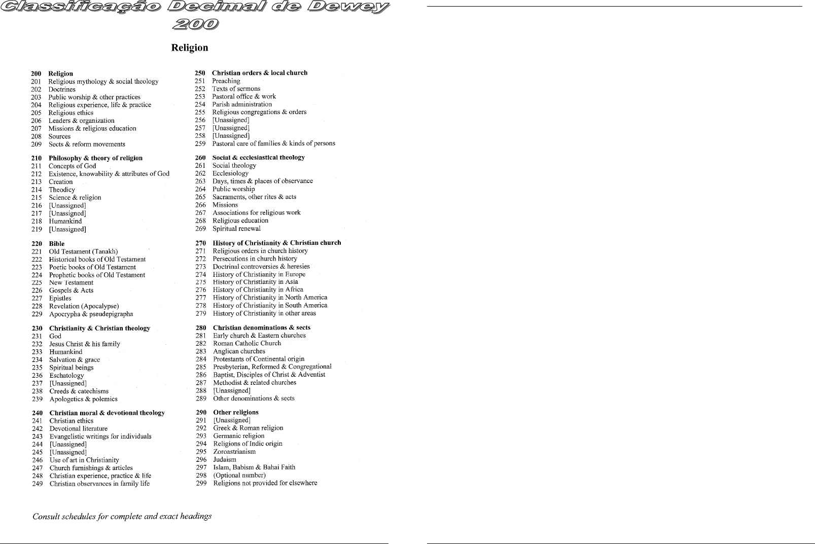 Representação Temática III 200 Religion Dewey Decimal Classification 2 200 Religion Beliefs, attitudes, practices of individuals and groups with respect to the ultimate nature of existences and relationships within the context of revelation, deity, worship Including public relations for religion [formerly 659.292] Comprehensive works on Christianity relocated to 230 Class comparative religion, works dealing with various religions in 291. Class public relations for a specific religion or aspect of a religion with the religion or aspect, e.g., local Christian church 254.4 See also 306.6 for sociology of religion See Manual at 133 vs 200; also at 200 vs. 100 (Option: To give preferred treatment or shorter numbers to a specific religion other than Christianity, use one of the five options described at 292-299) 200.1 Systems, value, scientific principles, psychology of religion Philosophy and theory of religion relocated to 210 200.11 Systems [formerly also 210.11, 291.011] 200[.12] Classification Relocated to 291.14 200.13 Value [formerly also 210.13, 291.013] 200[.14] Language and communication Relocated to 210.14 200.15 Scientific principles [formerly also 210.15, 291.015] Class philosophic treatment of the relation of science and religion in 215 200.19 Psychology of religion Class here psychological principles [formerly also 210.19, 291.019] 200.2-200.3 Standard subdivisions [formerly also 291.02-291.03] 200.5 Serial publications [formerly also 291.05] 200[.6] Organizations Relocated to 291.65 200[.68] Management Relocated to 291.6 200.7 Education, research, related topics [formerly also 291.07] 200.71 Education Class here religion as an academic subject Class religious education for the purpose of encouraging believers in religious life and practice, comprehensive works on religious education in 291.75 See also 379.28 for place of religion in public schools See Manual at 291.75 vs. 200.71 200.8 History and description with respect to kinds of persons [formerly also 291.08] 200.9 Historical, geographic, persons treatment [formerly also 291.09] See Manual at 200.9 vs. 294, 299.5 200.92 Persons See Manual at 200.92 and 291-299 [201] Philosophy and theory of Christianity Relocated to 230.01 [202] Miscellany of Christianity Relocated to 230.002 [203] Dictionaries, encyclopedias, concordances of Christianity Relocated to 230.003 200 Religion Dewey Decimal Classification 3 [204] Special topics Provision discontinued because without meaning in context 204[.5] Christian mythology Relocated to 230 [205] Serial publications of Christianity Relocated to 230.005 [206] Organizations of Christianity Relocated to 260 [207] Education, research, related topics of Christianity Relocated to 230.007 207[.1] Education Relocated to 230.071 207[.4-207.9] Higher education in specific continents, countries, localities in modern world Relocated to 230.07114-230.07119 [208] Christianity with respect to kinds of persons Relocated to 270.08 [209] Historical, geographic, persons treatment of Christianity Relocated to 270 210 Philosophy and theory of religion [formerly 200.1, 291.01] Religious beliefs and attitudes attained through observation and interpretation of evidence in nature, through speculation, through reasoning, but not through revelation or appeal to authoritative scriptures Class here natural theology, philosophical theology Class a specific topic treated with respect to religions based on revelation or authority with the topic in 291, e.g., concepts of God in world religions 291.211; class a specific topic with respect to a specific religion with the religion, e.g., Christian concepts of God 231 (Option: To give local emphasis and a shorter number to a specific religion other than Christianity, class it in this number, and add to base number 21 the numbers following the base number for that religion in 292-299, e.g., Hinduism 210, Mahabharata 219.23; in that case class philosophy and theory of religion in 200, its subdivisions 211-218 in 201-208, standard subdivisions of religion in 200.01-200.09. Other options are described at 292-299) 210.1 Theory of philosophy of religion Including methodology of the philosophy of religion 210[.11] Systems Relocated to 200.11 210[.12] Classification Relocated to 291.14 210[.13] Value Relocated to 200.13 210.14 Language and communication of religion [formerly also 200.14, 291.014] 210[.15] Scientific principles Relocated to 200.15 210[.19] Psychological principles Relocated to 200.19 211 Concepts of God Including anthropomorphism Class here comprehensive works on God, on The Holy For existence, knowability, attributes of God, miracles, see 212 200 Religion Dewey Decimal Classification 4 211.2 Pantheism 211.3 Theism For pantheism, see 211.2 211.32 Polytheism 211.33 Dualism 211.34 Monotheism 211.4 Rationalism (Free thought) 211.5 Deism 211.6 Humanism and secularism Standard subdivisions are added for either or both topics in heading 211.7 Agnosticism and skepticism Standard subdivisions are added for either or both topics in heading 211.8 Atheism 212 Existence, knowability, attributes of God Including miracles 212.1 Existence Including proofs 212.6 Knowability Class proofs in 212.1 212.7 Attributes Including love, omniscience 213 Creation Including creation of life and human life, evolution versus creation, evolution as method of creation See Manual at 231.7652 vs. 213, 500, 576.8 214 Theodicy Vindication of God's justice and goodness in permitting existence of evil and suffering Class here good and evil [formerly 216] 214.8 Providence 215 Science and religion Including technology and religion Class religion and scientific theories of creation in 213 See also 261.55 for Christianity and science, 291.175 for various religions and science 215[.1] Mathematics Number discontinued; class in 215 215.2 Astronomy Including cosmology 215[.24-215.25] Life on other worlds and space flight Numbers discontinued; class in 215 215.3 Physics 215[.4-215.5] Chemistry and geology Number