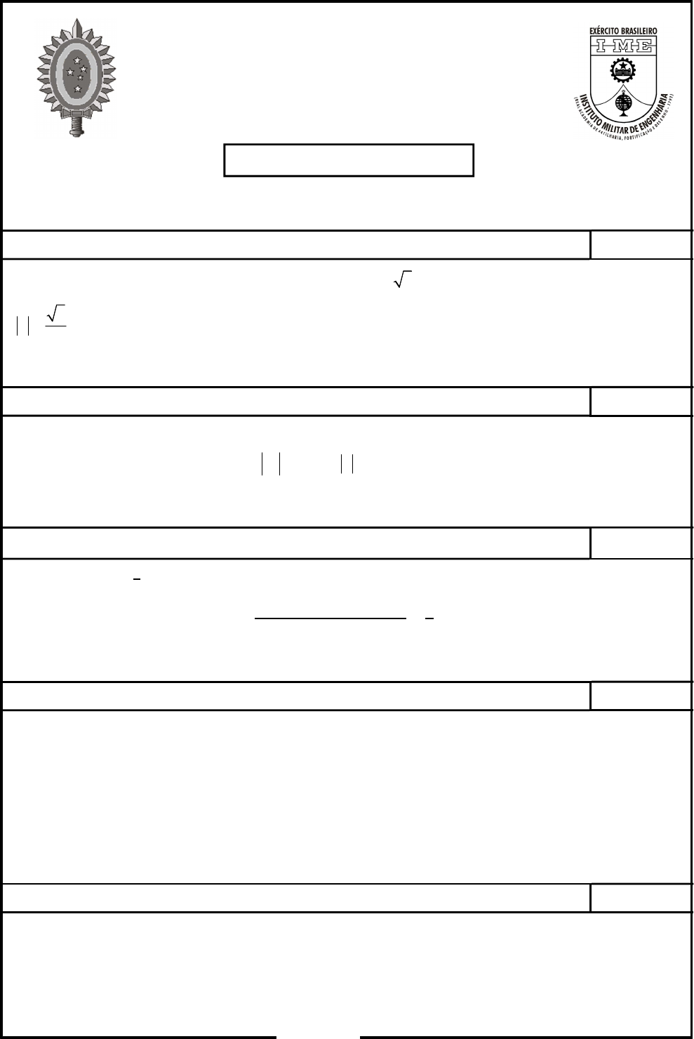 1 CONCURSO DE ADMISSÃO AO CURSO DE FORMAÇÃO E GRADUAÇÃO MATEMÁTICA CADERNO DE QUESTÕES 2017/2018 1a QUESTÃO Valor: 1,0 Seja o número complexo z que satisfaz a relação 2017 20172( ) ( 3 )( 1)z i i i z . Determine z, sabendo-se que 3 3 z . 2a QUESTÃO Valor: 1,0 Resolva a inequação abaixo, onde x é uma variável real. 3 22 6 3 2 0x x x 3a QUESTÃO Valor: 1,0 Sabendo que |𝑥| ≤ గ e que x satisfaz a equação abaixo 3 − 𝑐𝑜𝑠𝑥(4𝑐𝑜𝑠𝑥 + 𝑠𝑒𝑛𝑥) 10𝑠𝑒𝑛ଶ𝑥 − 8𝑠𝑒𝑛𝑥𝑐𝑜𝑠𝑥 = 1 2 Determine os possíveis valores de x. 4a QUESTÃO Valor: 1,0 Sejam 𝑎, 𝑏, 𝑐 e 𝑑 números reais positivos diferentes de 1. Temos que log 𝑑, log 𝑑 e log 𝑑 são termos consecutivos de uma progressão geométrica e que 𝑎, 𝑏 e 𝑐 formam uma progressão aritmética em que 𝑎 < 𝑏 < 𝑐. Sabendo-se que 𝑏 = 𝑏୪୭ೌ − 𝑎, determine: a) Os valores de 𝑎, 𝑏 e 𝑐 ; b) As razões das progressões aritmética e geométrica, 𝑟 e 𝑞, respectivamente. 5a QUESTÃO Valor: 1,0 Um ônibus escolar transporta n crianças. Sejam A o evento em que dentro do ônibus tenham crianças de ambos os sexos e B o evento em que há no máximo uma menina dentro do ônibus. Determine o valor de n para que os eventos A e B sejam independentes. 2 6a QUESTÃO Valor: 1,0 Seja a matriz 𝐴 = ቂ𝑘 −34 2 ቃ , com 𝑘 real. Determine a faixa de valores de 𝑘 para que exista uma matriz de números reais 𝑃 tal que as condições abaixo sejam atendidas simultaneamente: a) 𝐴்𝑃 + 𝑃𝐴 = 𝐼 em que 𝐴் é a transposta da matriz 𝐴 e 𝐼 é a matriz identidade; b) 𝑃 seja simétrica; c) 𝑝ଵଵ > 0, em que 𝑝ଵଵ é o elemento da linha 1 e coluna 1 de 𝑃; e d) |𝑃| > 0, em que |𝑃| é o determinante da matriz 𝑃. 7a QUESTÃO Valor: 1,0 Determine todos os números primos p, q e r tais que 35p + 11pq + qr = pqr. 8a QUESTÃO Valor: 1,0 Considere a elipse abaixo, onde DD´ é uma corda passando pelo seu centro, MM´ uma corda focal e o eixo maior da elipse é 2a. Prove que: 2` `.2DD MM a 9a QUESTÃO Valor: 1,0 Considere um triângulo ABC onde BC = a, AB = c, AC = b , c > b. O círculo inscrito a esse triângulo tangencia BC em D e DE é um diâmetro desse círculo. A reta que tangencia o círculo e que passa por E intercepta AB em P e AC em Q. A reta AE intercepta BC no ponto R. Determine os segmentos de reta EQ e DR em função dos lados do triângulo: a, b e c. 10a QUESTÃO Valor: 1,0 Seja um cubo regular, onde os centros de suas faces são vértices de um octaedro. Por sua vez, os centros das faces deste octaedro formado são vértices de outro cubo. Obtendo consecutivamente octaedros e cubos infinitamente, determine a razão da soma do volume de todos os poliedros inscritos pelo volume do cubo inicial.