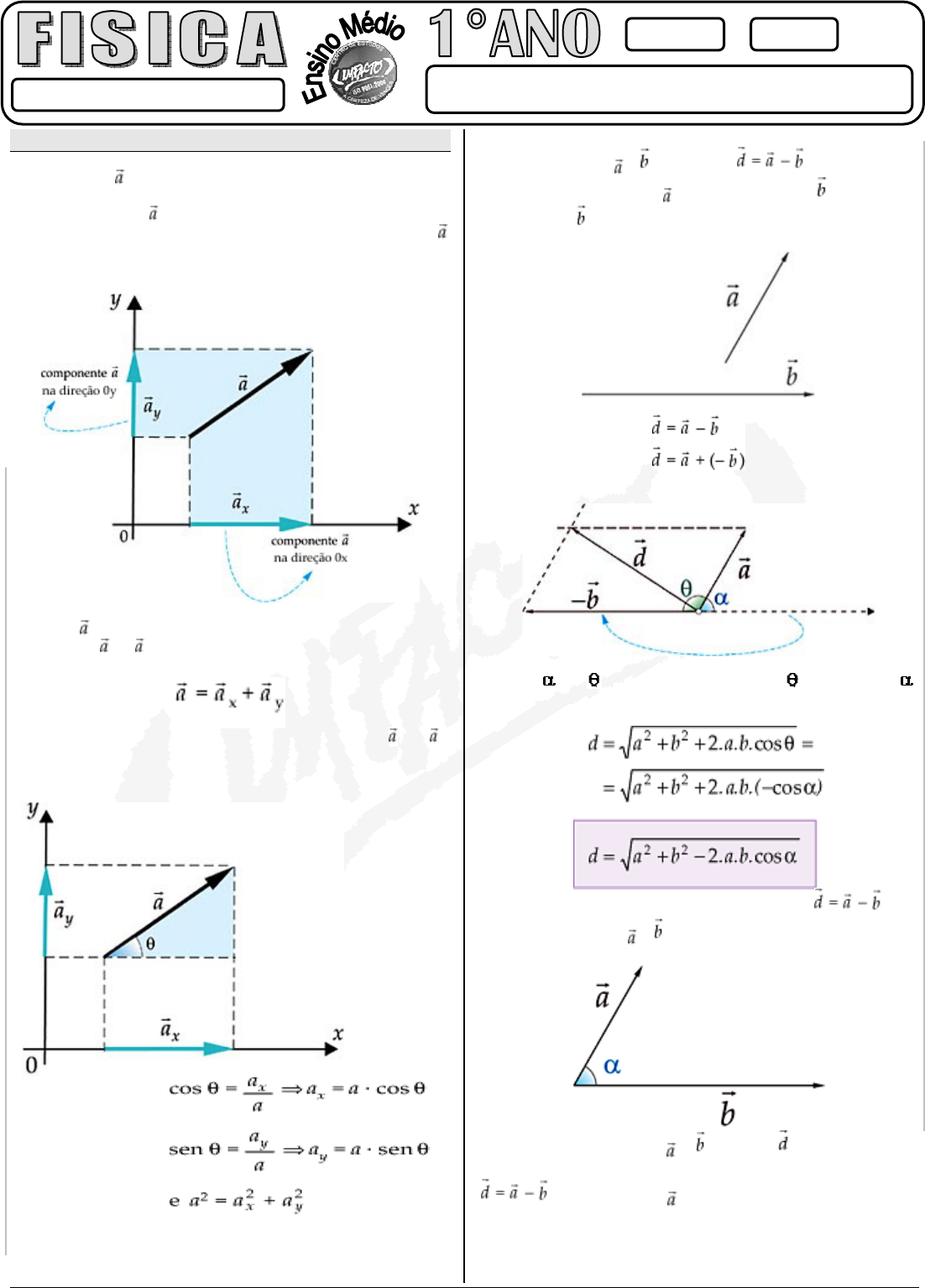 MA210208 DECOMPOSIÇÃO DE VETORES Frente: 01 Aula: 04 PROFº: FÁBIO ARAÚJO A Certeza de Vencer FAÇO IMPACTO - A CERTEZA DE VENCER!!! Fa le c on os co w w w .p or ta lim pa ct o. co m .b r EN SI NO M ÉD IO - 20 08 MÉTODO DAS COMPONENTES VETORIAIS Todo vetor , em um plano, pode ser representado por dois outros vetores, chamados de componentes retangulares. Dado um vetor e duas direções de referência OX e OY, determinamos as componentes retangulares do vetor através das projeções perpendiculares da origem e da extremidade do vetor nas direções dadas, conforme figura a seguir. O vetor pode ser representado pelas suas componentes retangulares x e y, sendo válida a relação: Para determinarmos os módulos das componentes x e y, devemos usar as relações trigonométricas no triângulo retângulo. Subtração Vetorial Dados dois vetores e , a operação é realizada através da adição do vetor com o vetor oposto a , ou seja, com o vetor – . Para essa adição utilizamos a regra do paralelogramo. Como + = 180°, então cos = – cos Assim, Outro modo de obtermos o vetor é: • Fazer as origens de e coincidirem. • Unir as extremidades de e e o vetor obtido terá sentido apontado para o vetor que se lê primeiro na expressão , no caso, o vetor . FAÇO IMPACTO - A CERTEZA DE VENCER!!! Fa le c on os co w w w .p or ta lim pa ct o. co m .b r EN SI NO M ÉD IO - 20 08 Seu módulo será dado por: EXERCÍCIO DE FIXAÇÃO 01. Dados os vetores abaixo, obter o vetor resultante a = 20 u b = 42 u c = 38 u d = 30 u sen 37° = cos 53° = 0,6 cos 37° = sen 53° = 0,8 Resolução: EXERCÍCIO DE PROPOSTOS 01. Na figura estão representados ao vetores e , assim como os versores e . a) Obtenha, em função de e , as expressões dos vetores , , + e - . 02. Duas partículas, A e B, deslocam-se com velocidades e de módulos e , respectivamente. Represente o vetor - e calcule seu módulo nos casos: 03. (FEI-SP) O vetor representativo de uma certa grandeza física vetorial possui módulo igual a 2. As componentes ortogonais desse vetor têm módulos e 1. Qual é o ângulo que o vetor forma com a sua componente de maior módulo? Resolução: