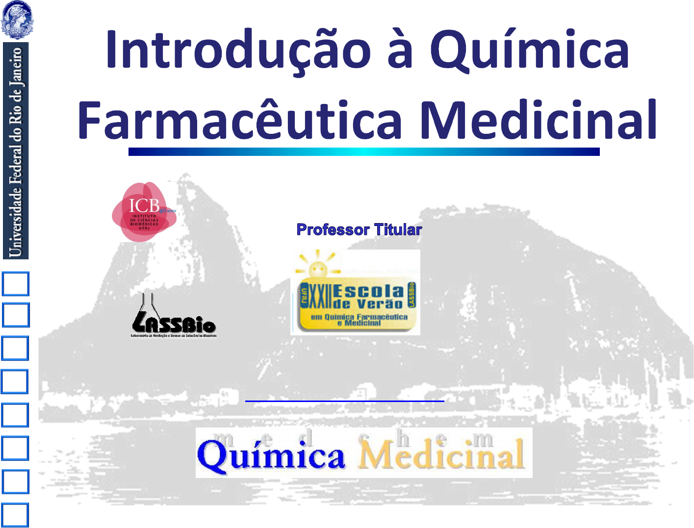 eliezer 2016 Introdução à Química Farmacêutica Medicinal Introdução à Química Farmacêutica Medicinal http://www.lassbio.icb.ufrj.br/ Laboratório de Avaliação e Síntese de Substâncias Bioativas Eliezer J. Barreiro Parte 3 SumárioSumárioSumárioSumário; DEFINIÇÃO, ObjetivosObjetivosObjetivosObjetivos,,,, multidisciplinaridade e Termos da QUÍMICA Medicinal; FÁRMACO X MEDICAMENTO; ESTÁGIOESTÁGIOESTÁGIOESTÁGIOS do processo de DDD; conceito de COMPOSTO-protótipo; ASASASAS fasesfasesfasesfases DA ação dos FÁRMACOS: PK & PD; QUEM são OS biorreceptores; o PARADIGMAPARADIGMAPARADIGMAPARADIGMA de Fischer; o centenário modelo chave-fechadura; ligações-H; os ALFABETOS bioquímicos; A importância das ligações frágeis; Topografia 3D dos BIORRECEPTORES; TIPOS de interações FÁRMACOS-biorreceptoresbiorreceptoresbiorreceptoresbiorreceptores;;;; Sítios DE reconhecimento MOLECULAR; SIMILARIDADE MOLECULAR; QUÍMICA COMPUTACIONAL; Pontos e grupos FARMACOFÓRICOS, auxofóricos e toxicofóricos; AAS; bent Samuelsson; Sune bergstron; John VANE; penicilina: Fleming; Ernest Chain; Howard FLOREY; Estatinas; AS razões moleculares DA ação dos fármacos = A estrutura química e a atividade: características estruturais dos FÁRMACOS; dissecação molecular; sutis efeitos da ESTRUTURA na atividade: James Black e o propranolol; fármacos e quiralidade; fatores conformacionais; metila; Planejamento RACIONAL; abordagem fisiológica; Estratégias clássicas e modernas de desenho MOLECULAR; concEito de estrutura PRIVILEGIADA, scaffold molecular & FRAGMENTO molecular; Técnicas hifenadas; Estratégias clássicas: BIOSOSTERISMO; hibridação molecular; simplificação molecular; OS FÁRMACOS inteligentes do século 21212121: fÁRMACOS multi-alvos;Tinibes; LASSBiio-1819; Inovação & patentes;epílogo Introdução Introdução Introdução Introdução aaaa QuímicaQuímicaQuímicaQuímica FarmacêuticaFarmacêuticaFarmacêuticaFarmacêutica MedicinalMedicinalMedicinalMedicinal Quiralidade AlaninaGlicina Valina IsoleucinaLeucina Lisina Fenilalanina AlaninaFenilalanina AlaninaTirosina Serina Cisteína HistidinaTriptofanoTirosina A importância das “ligações” frágeis... “ligações” de hidrogênio ... D—H……..A Linus C. Pauling 1901-1994 1954, 1962 2,6-3,2 A Proteínas, carboidratos, DNA, fosofolipídeos, canais iônicos Ligação de hidrogênio = H2OLigação de hidrogênio = H2O Carboidratos 20 amino-ácidos essenciais intermolecular Consequências ligação-H S N NH O NH CH3 O CH3 Sítio de reconhecimentomolecular Topografia dos Biorreceptores Fármaco Estrutura 3D do alvo terapêutico Interações pi Cation-pi Intramolecular O O N N H H H H NH N H O N H δδδδ+ δδδδ- N O N H δδδδ- δδδδ+ N H H H δδδδ-δδδδ+ δδδδ+δδδδ- H O H δδδδ+δδδδ- δδδδ- δδδδ+ δδδδ+ N H O δδδδ+ δδδδ- δδδδ- δδδδ+ Tipos de interações F-R ∆G = 20-40 kJ/mol ∆G = 12-20 kJ/mol ∆G = 4-12 kJ/mol ∆G = 2-10 kJ/mol ∆G = 2 kJ/mol ∆G = 2-4 kJ/mol ∆G = 4-30 kJ/mol Iônica (carga-carga) Carga-dipolo Dipolo-dipolo Carga-dipolo induzido Dipolo induzido-dipolo Dispersão (Van der Waals) Ligação-H doador aceptor PGE2PGF2αααα O CH3 CH3 OH H H H testosterona 1 17 8 14 O CH3 CH3 H H H O CH3 progesterona 17 1 8 14 CH3 HCH3 O H H O CH3 H 19 18 17 7 3 1 20 21 A B C D B/C C/D trans Esqueleto ciclopentano peridrofenantreno C19 C21 similaridade molecular 1,41 A progesterona testosterona SumárioSumárioSumárioSumário; – DEFINIÇÃO, ObjetivosObjetivosObjetivosObjetivos,,,, multidisciplinaridade e Termos da QUÍMICA Medicinal; FÁRMACO X MEDICAMENTO; ESTÁGIOESTÁGIOESTÁGIOESTÁGIOS do processo de DDD; conceito de COMPOSTO-protótipo; ASASASAS fasesfasesfasesfases DA ação dos FÁRMACOS: PK & PD; QUEM são OS biorreceptores; o PARADIGMAPARADIGMAPARADIGMAPARADIGMA de Fischer; o centenário modelo chave-fechadura; ligações-H; os ALFABETOS bioquímicos; A importância das ligações frágeis; Topografia 3D dos BIORRECEPTORES; TIPOS de interações FÁRMACOS-biorreceptoresbiorreceptoresbiorreceptoresbiorreceptores;;;; Sítios DE reconhecimento MOLECULAR; SIMILARIDADE MOLECULAR; QUÍMICA COMPUTACIONAL; Pontos e grupos FARMACOFÓRICOS, auxofóricos e toxicofóricos; AAS; bent Samuelsson; Sune bergstron; John VANE; penicilina: Fleming; Ernest Chain; Howard FLOREY; Estatinas; AS razões moleculares DA ação dos fármacos = A estrutura química e a atividade: características estruturais dos FÁRMACOS; dissecação molecular; sutis efeitos da ESTRUTURA na atividade: James Black e o propranolol; fármacos e quiralidade; fatores conformacionais; metila; Planejamento RACIONAL; abordagem fisiológica; Estratégias clássicas e modernas de desenho MOLECULAR; concEito de estrutura PRIVILEGIADA, scaffold molecular & FRAGMENTO molecular; Técnicas hifenadas; Estratégias clássicas: BIOSOSTERISMO; hibridação molecular; simplificação molecular; OS FÁRMACOS inteligentes do século 21212121: fÁRMACOS multi-alvos;Tinibes; LASSBiio-1819; Inovação & patentes;epílogo Introdução Introdução Introdução Introdução aaaa QuímicaQuímicaQuímicaQuímica FarmacêuticaFarmacêuticaFarmacêuticaFarmacêutica MedicinalMedicinalMedicinalMedicinal Estudos das interações F-R Ariel Warshel (1940 - ) Michael Levitt (1947 - ) Martin Karplus (1930 - ) Química Computacional “for the development of multiscale models for complex chemical systems” Modelagem & dinâmica molecular �DOWNLOAD DA ESTRUTURA do BIORRECEPTOR � construção do modelo PROTEIN DATA BANK (PDB) SELEÇÃO DA ESTRUTURA DE REFERÊNCIA ANCORAMENTO DOS LIGANTES DETERMINAÇÃO DA ENERGIA LIVRE DE INTERAÇÂO (∆∆∆∆Ginteração) SELEÇÃO DOS LIGANTES DETERMINAÇÃO DOS PONTOS FARMACOFÓRICOS Sybyl, Version 8.0, Tripos Associates (Licença # 7512) Spartan Pro; Wavefunction, Inc. (Licença # 1-001259 ) FlexX Eleição da Quimioteca (LASSBio = 1959) Metodologia: docking molecular