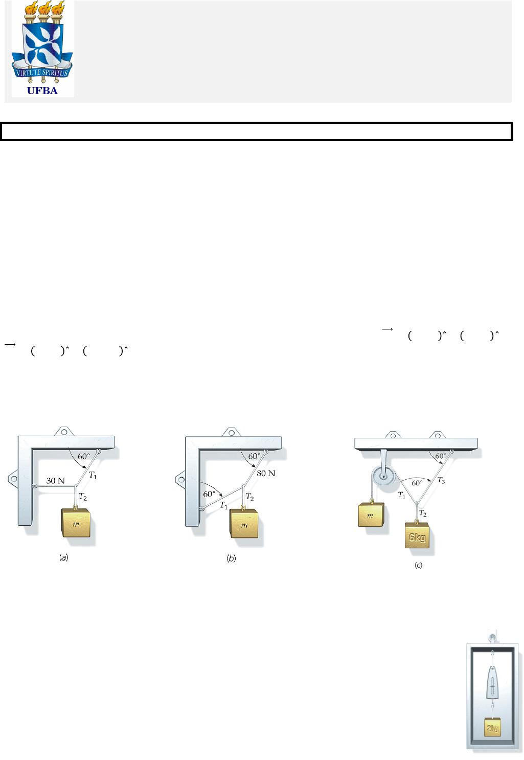 Universidade Federal da Bahia – Instituto de Física Departamento de Física de Terra e do Meio Ambiente Física Geral e Experimental IE – FIS121 3° lista de exercícios – Leis de Newton - Se a questão não for literal, considere a aceleração da gravidade como g = 9,81 m/s2 Exercício 1: Um projétil de massa 1,80 x 10-3 kg, movendo-se a 500 m/s, atinge um tronco de arvore e penetra 6,00 cm na madeira antes de parar. (a) Se a aceleração do projétil é constante, encontre a força (orientação inclusive) exercida pela madeira no projétil. (b) Se a mesma força atuasse sobre o projétil, com a mesma velocidade no impacto, mas se ele tivesse a metade da massa, quanto ele penetraria na madeira? Exercício 2: Se você empurra um bloco cuja massa é m1, sobre um chão sem atrito com uma força horizontal de magnitude F0, o bloco tem uma aceleração de 12 m/s2. Se você empurra um bloco diferente, de massa m2, com uma força horizontal de magnitude F0, sua aceleração é 3,0 m/s2. (a) Que aceleração produzira uma força horizontal de magnitude F0 sobre um bloco de massa m2 – m1? (b) Que aceleração produzirá uma força horizontal de magnitude F0 sobre um bloco de massa m2 + m1? Exercício 3: Um objeto de 4,0 kg é submetido a duas forças constantes, 𝐹! = 2,0 𝑁 𝚤 − 3,0 𝑁 𝚥 e 𝐹! = 4,0 𝑁 𝚤 − 11,0 𝑁 𝚥. O objeto está em repouso na origem no tempo t = 0. (a) Qual é a aceleração do objeto? (b) Qual é a sua velocidade no tempo t = 3,0 s? (c) Onde está o objeto no tempo t = 3,0 s? Exercício 4: Para os sistemas das figuras abaixo, encontre as massas e as tensões desconhecidas. Exercício 5: Uma força horizontal de 100 N empurra um bloco de 12 kg para cima, em um plano inclinado sem atrito que forma um ângulo de 25º com a horizontal. (a) Qual é a força normal que o plano inclinado exerce sobre o bloco? (b) Qual é a magnitude da aceleração do bloco? Exercício 6: Um bloco de 2,0 kg esta pendurado em uma escala de mola calibrada em Newtons que está presa no teto de um elevador. Qual a leitura da escala quando (a) o elevador está subindo com uma velocidade constante de 30 m/s; (b) o elevador está descendo com uma velocidade constante de 30 m/s; (c) o elevador está subindo a 20 m/s e ganhando velocidade à taxa de 3,0 m/s2? (d) Suponha agora que, de t = 0 até t = 5,0 s, o elevador sobe com uma velocidade constante de 10 m/s. Depois, sua velocidade é reduzida uniformemente até zero, durante os 4,0 s seguintes, de forma que ele esta em repouso em t = 9,0 s. Descreva a leitura de escala durante o intervalo 0 < t < 9,0 s. Exercício 7: Uma caixa de massa m2 = 3,5 kg está sobre uma estante horizontal sem atrito e presa por fios a caixas de massa m1 = 1,5 kg e m3 = 2,5 kg, como mostra a figura. As duas polias são sem atrito e sem massa. O sistema é largado do repouso. Após a largada, encontre (a) a aceleração de cada uma das caixas e (b) a tensão em cada fio. Exercício 8: Duas caixas de 100 kg são arrastadas sobre uma superfície horizontal sem atrito com uma aceleração constante de 1,00 m/s2, como mostrado na figura. Cada corda tem uma massa de 1,00 kg. Encontre a magnitude da força 𝐹 e a tensão nas cordas nos pontos A, B e C. Exercício 9: Durante uma apresentação teatral de Peter Pan, a atriz de 50 kg que representa Peter Pan deve voar verticalmente (descendo). Para acompanhar a música ela deve, a partir do repouso, ser baixada de uma distância de 3,2 m em 2,2 s com aceleração constante. Nos bastidores, uma superfície lisa inclinada de 50º suporta um contrapeso de massa m, como mostrado na figura. Mostre os cálculos que o operador deve fazer para encontrar (a) a massa de contrapeso a ser usada e (b) a tensão no fio. Exercício 10: Um bloco de 8,0 kg e outro de 10 kg, ligados por uma corda que passa sobre um encaixe sem atrito, deslizam sobre o plano inclinado sem atrito da figura. (a) Encontre a aceleração dos blocos e a tensão na corda. (b) Os dois blocos são substituídos por outros dois, de massa m1 e m2, de forma a não haver aceleração. Informe o que for possível sobre essas duas massas. Exercício 11: Um bloco de 20 kg, com uma polia presa a ele, desliza ao longo de um trilho sem atrito. Ele está conectado, por um fio sem massa, a um bloco de 5,0 kg, como mostra o arranjo da figura. Encontre (a) a aceleração de cada bloco e (b) a tensão no fio. Exercício 12: Se uma das massas da máquina de Atwood da figura é 1,2 kg, quanto deve valer a outra massa de forma a que o deslocamento de cada massa, durante o primeiro segundo após a largada, seja 0,30 m? Suponha uma polia sem massa e sem atrito e um fio sem massa. Respostas: 1) (a) -3750 N; (b) 3,00 cm 2) (a) 4 m/s2; (b) 2,4 m/s2 3) (a) 𝑎 = 1,5!𝑠2 𝚤 − 3,5!𝑠2 𝚥; (b) 𝑣 = 4,5!𝑠 𝚤 − 11!𝑠 𝚥; (c) 𝑟 = 6,8 𝑚 𝚤 − 16 𝑚 𝚥 4) (a) T1 = 60 N, T2 = 52 N e m = 5,3 kg; (b) T1 = 46,2 N, T2 = 46,2 N e m = 4,7 kg; (c) T1 = T3 = 34 N, T2 = 58,9 N e m = 3,5 kg 5) (a) 149 N; (b) 3,4 m/s2 6) (a) 19,6 N; (b) 19,6 N; (c) 25,6 N; (d) 19,6 N de 0 a 5 s e 14,6 N de 5 a 9 s 7) (a) 1,3 m/s2 e (b) T1 = 16,7 N e T2 = 21,3 N 8) F = 202 N, TA = 100 N, TB = 101 N e TC = 201 N 9) (a) m = 48 kg; (b) T = 424 N 10) (a) 1,4 m/s2 e T = 61,4 N; (b) !!!! = 1,19 11) (a) a20 = 2,45 m/s2 e a5 = 4,9 m/s2; (b) T = 25 N 12) 1,06 kg ou 1,36 kg
