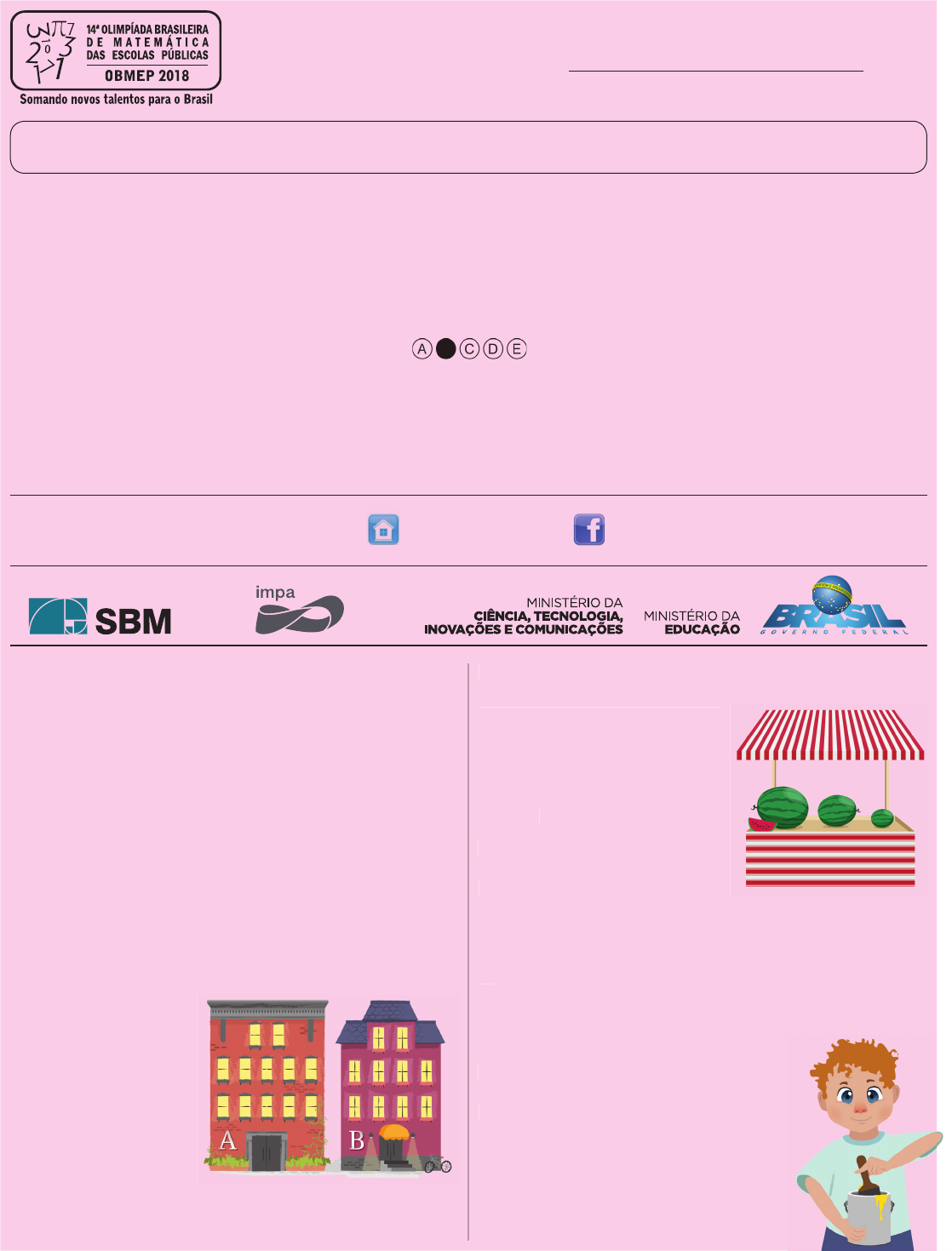3. Uma melancia média e duas melancias grandes custam o mesmo que oito melancias pequenas. Uma melancia média e uma pequena custam o mesmo que uma melancia grande. Quantas melancias pequenas podem ser compradas pelo mesmo preço de uma melancia grande? A) 3 B) 4 C) 5 D) 6 E) 7 4. Marcos comprou 21 litros de tinta. Ele usou água para diluir essa tinta até que a quantidade de água acrescentada fosse 30% do total da mistura. Quantos litros de água ele usou? A) 5 B) 6 C) 7 D) 8 E) 9 3. Uma melancia média e duas melancias grandes custam o mesmo que oito melancias pequenas. Uma melancia média e uma pequena custam o mesmo que uma melancia grande. Quantas melancias pequenas podem ser compradas pelo mesmo preço de uma melancia grande? A) 3 B) 4 C) 5 D) 6 E) 7 4. Marcos comprou 21 litros de tinta. Ele usou água para diluir essa tinta até que a quantidade de água acrescentada fosse 30% do total da mistura. Quantos litros de água ele usou? A) 5 B) 6 C) 7 D) 8 E) 9 2Nível8.º e 9.º anos do Ensino Fundamental1.ª FASE – 5 de junho de 2018 Nome completo do(a) aluno(a): _________________________________________________________________ INSTRUÇÕES 1. Preencha o cartão-resposta com seu nome completo, sexo, telefone, CPF, endereço eletrônico, data de nascimento, ano e turno em que estuda, e lembre-se de assiná-lo. 2. A duração da prova é de 2 horas e 30 minutos. 3. Cada questão tem cinco alternativas de resposta: A), B), C), D) e E) e apenas uma delas é correta. 4. Para cada questão marque a alternativa escolhida no cartão-resposta, preenchendo todo o espaço dentro do círculo correspondente, a lápis ou a caneta esferográfi ca azul ou preta (é preferível a caneta). 5. Marque apenas uma alternativa para cada questão. Atenção: se você marcar mais de uma alternativa, perderá os pontos da questão, mesmo que uma das alternativas marcadas seja correta. 6. Não é permitido o uso de instrumentos de desenho, calculadoras ou quaisquer fontes de consulta. 7. Não é permitido o uso de celulares, tablets ou quaisquer outros equipamentos eletrônicos. 8. Os espaços em branco na prova podem ser usados para rascunho. 9. Ao fi nal da prova, entregue-a ao professor junto com o cartão-resposta. www.obmep.org.br www.facebook.com/obmep Visite nossas páginas na Internet: 1. Miguel tinha em sua carteira várias notas de 2, 5, 10, 20 e 50 reais. Ele pagou 63 reais por um livro com seis dessas notas, sem ter troco a receber. Quantas notas de 2 reais ele usou? A) 0 B) 1 C) 2 D) 3 E) 4 2. Os edifícios A e B da fi gura não possuem janelas em suas laterais e têm o mesmo número de janelas na parte de trás. O edifício A tem mais janelas na frente do que atrás; já o edifício B tem mais janelas atrás do que na frente. Qual é o número total de janelas nos dois edifícios? A) 21 B) 23 C) 44 D) 46 E) 48 NÍVEL 2 OBMEP 20182 5. Juca colocou algumas bolinhas em uma caixa na qual cabem, no máximo, 100 bolinhas. Artur tirou 1/2 das bolinhas dessa caixa, depois Bernardo tirou 1/3 das restantes, em seguida Carlos tirou 1/4 das que sobraram e, fi nalmente, Danilo tirou 1/5 das que restaram. Quantas bolinhas fi caram na caixa? A) 0 B) 3 C) 6 D) 12 E) 24 6. Cinco crianças lançaram, cada uma, dois dados. A soma dos pontos obtidos nos dez dados foi 57. Quantas crianças, no mínimo, tiraram 6 em ambos os dados? A) 1 B) 2 C) 3 D) 4 E) 5 7. Qual é o valor da expressão 2 2242424 121212 242424 121212 − × ? A) 1/2 B) 3/4 C) 1 D) 3/2 E) 7/4 8. Um supermercado vende rolos idênticos de papel higiênico e faz as promoções abaixo: 1. Pague 5 e leve 6. 2. Pague 11 e leve 12. 3. Pague 14 e leve 18. 4. Pague 21 e leve 24. 5. Pague 31 e leve 36. Qual é a promoção mais vantajosa? A) Promoção 1 B) Promoção 2 C) Promoção 3 D) Promoção 4 E) Promoção 5 9. Maria escolheu um número inteiro. Ela somou a esse número os três números ímpares imediatamente inferiores e os dois números pares imediatamente superiores a ele e obteve 1414 como resultado. Qual é a soma dos algarismos do número que Maria escolheu? A) 12 B) 13 C) 14 D) 15 E) 16 10. Na igualdade abaixo, a, b e c são números inteiros positivos. Qual é o valor de c? 10 1 17 a b c = + + A) 2 B) 3 C) 4 D) 5 E) 7 13. Um estacionamento tem 10 vagas, uma ao lado da outra, inicialmente todas livres. Um carro preto e um carro rosa chegam a esse estacionamento. De quantas maneiras diferentes esses carros podem ocupar duas vagas de forma que haja pelo menos uma vaga livre entre eles? A) 56 B) 70 C) 71 D) 72 E) 80 14. João tem lápis nas cores verde, amarela e preta e quer colorir o tabuleiro da fi gura, de modo que: • cada quadradinho deve ser colorido com uma única cor; • quaisquer dois quadradinhos com um lado comum devem ser coloridos com cores diferentes. De quantas maneiras diferentes ele pode colorir esse tabuleiro? A) 12 B) 18 C) 24 D) 54 E) 81 15. Vovó Vera quis saber qual de suas cinco netinhas tinha feito um desenho na parede de sua sala. As netinhas fi zeram as seguintes declarações: • Emília: Não fui eu. • Luísa: Quem desenhou foi a Marília ou a Rafaela. • Marília: Não foi a Rafaela nem a Vitória. • Rafaela: Não foi a Luísa. • Vitória: Luísa não está dizendo a verdade. Se apenas uma das netinhas mentiu, quem fez o desenho? A) Emília B) Luísa C) Marília D) Rafaela E) Vitória NÍVEL 2OBMEP 2018 3 11. No trapézio ABCD da fi gura, os lados AB e CD são paralelos e o comprimento de CD é o dobro do comprimento de AB. O ponto P está sobre o lado CD e determina um triângulo ABP com área igual a 17. Qual é a área do trapézio ABCD? A) 32 B) 34 C) 45 D) 51 E) 68 12. Os produtos A, B e C foram avaliados pelos consumidores em relação a oito itens. Em cada item os produtos receberam notas de 1 a 6, conforme a fi gura. De acordo com essas notas, qual é a alternativa correta? A) O produto B obteve a maior nota no item propaganda. B) O produto de maior utilidade é o menos durável. C) O produto C 
