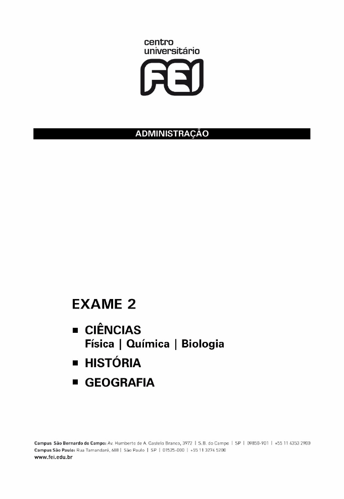 VESTIBULAR 2º/2017 1 INSTRUÇÕES - EXAME 2 1. Verifique se este caderno contém 60 questões numeradas de 1 a 60. 2. A duração total da prova é de 4 (quatro) horas e a permanência mínima em sala é de 90 minutos. 3. As respostas das questões deverão ser transcritas para a Folha de Respostas, que somente poderá ser solicitada ao fiscal da sala após o prazo de 60 minutos. Antes de solicitá-la, preencha o rascunho dessa folha, que está impresso no seu caderno de questões. 4. Cada questão apresenta cinco alternativas, das quais somente uma é correta. 5. Preencha a Folha de Respostas com muito cuidado, pintando com caneta azul ou preta os alvéolos correspondentes às suas respostas. Não esqueça de assiná-la. 6. Serão consideradas erradas as questões não respondidas, respondidas com mais de uma alternativa ou com respostas rasuradas. 7. As respostas erradas não anulam as respostas certas. 8. Não é permitido o uso de calculadoras. 2 CIÊNCIAS Adotar: g = 10 m/s2 sen 370 = 0,6 cos 370 = 0,8 sen 300 = cos 600 = 0,5 cos 300 = sen 600 = √� � sen 450 = cos 450 = √� � 1ª Questão. Em um dado instante, o automóvel A, com velocidade constante VA = 30 km/h, passa pelo km 14 de uma estrada retilínea. No mesmo instante, o automóvel B, com velocidade constante VB = 50 km/h, passa pelo km 10 da mesma estrada. Se os dois automóveis possuem movimento progressivo, em qual km da estrada os dois se encontrarão? (A) 16 (B) 22 (C) 18 (D) 24 (E) 20 2ª Questão. Um automóvel percorre uma curva plana horizontal de raio 250,0 m com velocidade de magnitude constante e igual a 54,0 km/h. Qual é a aceleração do automóvel durante a curva? (A) 1,0 m/s2 (B) 0,9 m/s2 (C) Zero (D) 11,7 m/s2 (E) 5,0 m/s2 3ª Questão. Na Terra, o peso de uma espaçonave é 50 kN. Qual será o peso desta espaçonave na Lua? Dado: a aceleração da gravidade na Lua é aproximadamente 1,63 m/s2. (A) 1 630 N (B) 8 150 N (C) 16 300 N (D) 3 067 N (E) 50 000 N 3 4 4ª Questão. Um bloco de massa m é puxado com uma força F, de acordo com a figura abaixo. Neste caso, é correto afirmar, sobre a força normal N, que: (A) N = mg (B) N > mg (C) N = mg + Fsenθ (D) N = mg – Fcosθ (E) N < mg 5ª Questão. Considere as afirmações abaixo: I. O trabalho de uma força qualquer que atua sobre um corpo é o produto da força pelo deslocamento do corpo. II. O trabalho de uma força qualquer que atua sobre um corpo é numericamente igual à variação da energia cinética. III. O trabalho da força resultante sobre um corpo é a variação da energia mecânica. Estão corretas: (A) Nenhuma das afirmações. (B) Somente a afirmação I. (C) Somente a afirmação II. (D) Somente as afirmações I e III. (E) Somente as afirmações I e II. 6ª Questão. Qual é a quantidade de calor necessária para fundir, a 00C, 60 g de gelo? Dado: calor latente de fusão do gelo: 80 cal/g. (A) 1 333 cal (B) 480 J (C) 1,33 cal (D) 480 cal (E) 4,8 kcal 7ª Questão. Em um calorímetro de capacidade térmica desprezível, estão 200 g de água a 20ºC. Qual será a temperatura de equilíbrio quando forem acrescentados 200 g de um metal a 180ºC? Dados: calor específico da água = 1 cal/gºC; calor específico do metal = 0,2 cal/gºC. (A) 35,4 ºC (B) 46,7 ºC (C) 50,0 ºC (D) 60,0 ºC (E) 62,8 ºC m F θ 5 6 8ª Questão. Uma luz monocromática se propaga no ar e atinge a superfície de um meio cujo índice de refração é n. Se o ângulo de incidência é 45º e o ângulo de refração é 30º, qual é o valor de n? (A) n = 0,5 (B) n = 2 3 (C) n = 2 (D) n = 2 2 (E) n = 2 2 9ª Questão. Dois resistores, de 20 Ω cada, são associados em série e submetidos a uma diferença de potencial de 10 V. A corrente medida no circuito vale: (A) 0,50 A (B) 0,20 A (C) 0,25 A (D) 0,40 A (E) 0,80 A 10ª Questão. Qual dos eletrodomésticos abaixo tem seu funcionamento baseado no efeito joule? (A) Geladeira (B) Forno a gás (C) Micro-ondas (D) Forno elétrico (E) Ventilador 11ª Questão. Sejam os átomos abaixo: 30 X50 27Y58 e Z Sabendo-se que o átomo Z é isóbaro do átomo Y e isótopo do átomo X, o número de nêutrons presentes no núcleo do átomo Z é: (A) 20 (B) 27 (C) 28 (D) 33 (E) 50 7 8 12ª Questão. Assinale a alternativa que contenha somente elementos da família dos gases nobres: (A) Xe, Ne, Ar, Rn (B) He, Ne, Ar, Rh (C) H, Ne, Ar, Xe (D) He, N, Ar, Rn (E) H, N, Ar, Xe 13ª Questão. O átomo de oxigênio não está presente nas moléculas de: (A) aldeídos. (B) ácidos carboxílicos. (C) álcoois. (D) alcenos. (E) cetonas. 14ª Questão. Quanto tempo levará para uma amostra radioativa de 10 g ser reduzida a 1,25 g , sabendo-se que o tempo de semi- desintegração é de 12 h? (A) 12 h (B) 24 h (C) 36 h (D) 48 h (E) 60 h 15ª Questão. A fórmula geral CnH2n+2 representa: (A) um alcino. (B) um alceno. (C) um álcool. (D) um alcano. (E) um alcadieno. 16ª Questão. Assinale a alternativa que representa somente propriedades coligativas: (A) criometria, ebuliometria e estequiometria. (B) criometria, ebuliometria e osmometria. (C) ebuliometria, estequiometria e osmometria. (D) ebuliometria, estequiometria e tonometria. (E) estequiometria, osmometria e tonometria. 9 10 17ª Questão. Na preparação de 2 L de solução de NaOH a 3 molar foi utilizada uma solução concentrada de NaOH a 12 molar e água. O volume de água adicionada à solução concentrada de NaOH foi: (A) 0,25 L (B) 0,50 L (C) 1,00 L (D) 1,50 L (E) 3,00 L 18ª Questão. O sistema representado pela reação hipotética: A + 2B ← → C apresenta as seguintes concentrações após o sistema atingir o equilíbrio: [ A ] = 3 mol/L [ B ] = 2 mol/L [C ] = 12 mol/L a constante de equilíbrio Kc deste sistema, em unidades de L/mol, será igual a: (A) 1 (B) 2 (C) 4 (D) 6 (E) 18 19ª Questão. Em processos de eletrólise, é correto afirmar que: (A) o anodo corresponde ao polo positivo e sofre a oxidação. (B) o anodo corresponde ao polo negativo e sofre a oxidação. (