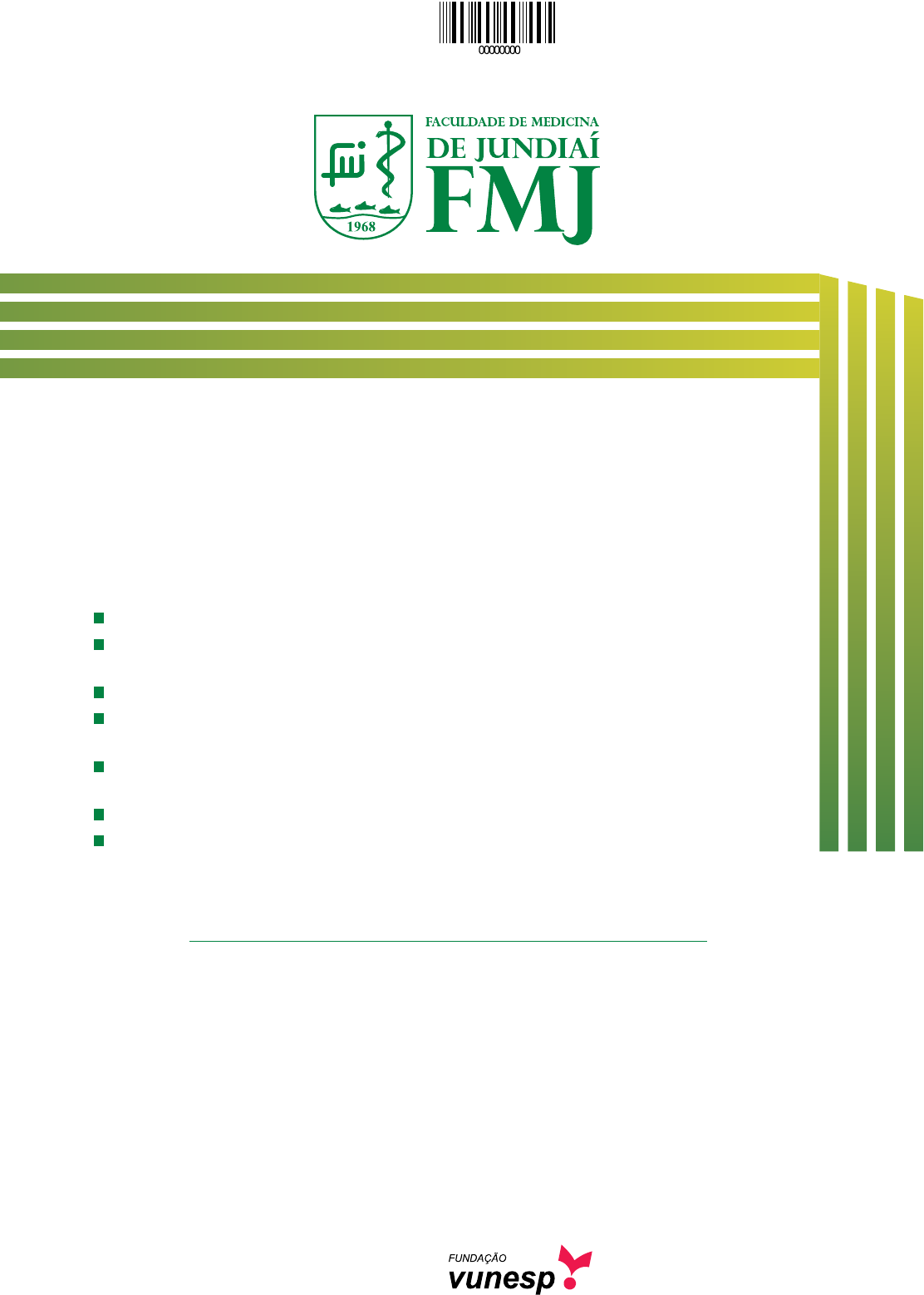 Vestibular 2015 Medicina 002. Prova de Conhecimentos Específicos e Redação Confira seus dados impressos neste caderno. Assine com caneta de tinta azul ou preta apenas no local indicado. Qualquer identificação no corpo deste caderno acarretará a atribuição de nota zero a esta prova. Esta prova contém 20 questões discursivas e uma proposta de redação, e terá duração de 4 horas. A resolução e a resposta de cada questão devem ser apresentadas no espaço correspondente, utilizando caneta de tinta azul ou preta. Não serão consideradas questões resolvidas fora do local indicado. Encontra-se neste caderno a Classificação Periódica, a qual, a critério do candidato, poderá ser útil para a resolução de questões. O candidato somente poderá sair do prédio depois de transcorridas 3 horas, contadas a partir do início da prova. Ao final da prova, antes de sair da sala, entregue ao fiscal a Folha de Redação e o Caderno de Questões. Assinatura do candidato 17.12.2014 2FMJU1401 | 002-ConhecEspecíficos-Redação 3 FMJU1401 | 002-ConhecEspecíficos-Redação RESolução E RESPoSta QuEStão 01 A expressão de um gene produziu um polipeptídio normal. A partir desse gene, ocorreram mutações em células cultivadas em três tubos de ensaio diferentes, que resultaram em três moléculas distintas: 1, 2, e 3. • Polipeptídio normal: leucina – prolina – histidina – arginina – serina – valina – glicina – alanina • Polipeptídio mutante 1: leucina – leucina – histidina – arginina – treonina – valina – glicina – alanina • Polipeptídio mutante 2: leucina – prolina – isoleucina – valina – valina – leucina – valina – leucina • Polipeptídio mutante 3: leucina – prolina – histidina – prolina – serina – valina – glicina – alanina a) Considerando apenas a sequência de aminoácidos fornecida, quantos códons do RNA foram necessários para sin- tetizar cada polipeptídio? Justifique sua resposta. b) Considerando as proteínas resultantes, qual das mutações resultou de uma provável deleção? Justifique sua resposta. RA SC UN HO 4FMJU1401 | 002-ConhecEspecíficos-Redação RESolução E RESPoSta QuEStão 02 Muitas moléculas podem atravessar a membrana plasmática. O gráfico ilustra dois transportes passivos pela membrana. a) Identifique os tipos de transportes representados por 1 e 2. b) O que caracteriza um transporte passivo? Por que a velocidade de entrada da substância torna-se constante depois de certo tempo, no transporte representado por 1? RA SC UN HO 5 FMJU1401 | 002-ConhecEspecíficos-Redação RESolução E RESPoSta QuEStão 03 Duas populações de ratos da mesma espécie colonizaram duas ilhas diferentes (x e y). As curvas de potencial biótico foram as mesmas nas duas situações, porém as curvas de crescimento real foram diferentes, como ilustram os gráficos. A linha tracejada corresponde à carga biótica, que foi a mesma nas duas ilhas. a) Em qual das ilhas a resistência ambiental foi maior? Justifique sua resposta levando em conta o tempo para atingir a carga biótica. b) Considere que no início do povoamento, as duas populações eram semelhantes geneticamente. Do ponto de vista da teoria sintética da evolução, explique por que não é correto afirmar que as duas populações finais são geneticamente idênticas às populações iniciais, tanto na ilha x como na ilha y. RA SC UN HO 6FMJU1401 | 002-ConhecEspecíficos-Redação RESolução E RESPoSta QuEStão 04 Beatriz desenvolveu um mioma (tumor benigno) e teve que se submeter a uma cirurgia de retirada do útero. Após a cirurgia, Beatriz desejou ter um filho, e pediu à Raquel, sua irmã, que fosse sua cessora temporária de útero (“barriga de aluguel”). Raquel disse ser impossível, alegando que havia se submetido à laqueadura após o nascimento de sua segunda filha e não poderia engravidar novamente. a) A negativa de Raquel quanto a engravidar é pertinente? Justifique sua resposta. b) Se os ovários de Raquel tivessem sido removidos, seria difícil ser “barriga de aluguel”, caso não recebesse hormônios, principalmente no início da gestação. Explique por que, nessas condições, seria difícil manter uma gravidez e mencione os hormônios que ela deveria receber. RA SC UN HO 7 FMJU1401 | 002-ConhecEspecíficos-Redação RESolução E RESPoSta QuEStão 05 Plantas da mesma espécie foram submetidas a dois procedimentos, a saber: 1. suas gemas apicais foram retiradas e no lugar delas foram colocados blocos de ágar com auxina. 2. suas gemas apicais foram retiradas e no lugar delas foram colocados blocos de ágar puro. a) Qual dos procedimentos corresponde à poda realizada por fruticultores? Explique por que fruticultores realizam esse procedimento. b) Qual dos procedimentos seria semelhante ao crescimento normal da planta? Explique a resposta fisiológica das gemas laterais nessa condição. RA SC UN HO 8FMJU1401 | 002-ConhecEspecíficos-Redação RESolução E RESPoSta QuEStão 06 Caso um mosquito não infectado pique uma pessoa infectada, ele fica infectado e pode depois transmitir a malária a outras pessoas não infectadas. Em geral, dez dias a seis semanas após uma pessoa ter sido infectada aparecem os sin- tomas da malária, como febre alta e tremores. A malária causada pelas bactérias Plasmodium vivax, P. ovale e P. malariae provoca destruição dos glóbulos vermelhos pelos parasitas, em intervalos específicos. Uma vez diagnosticada, o médico deve receitar medicamentos específicos o mais rápido possível, para evitar complicações. (Guia Veja de Medicina e Saúde, 2008. Adaptado.) a) Do ponto de vista biológico, o texto apresenta uma informação incorreta. Identifique esse erro e faça a devida correção. b) Pesquisadores decifraram o genoma do mosquito Anopheles darlingi (transmissor da malária no Brasil) e isso levou à descoberta de genes envolvidos com o sistema sensorial e outros que codificam proteín