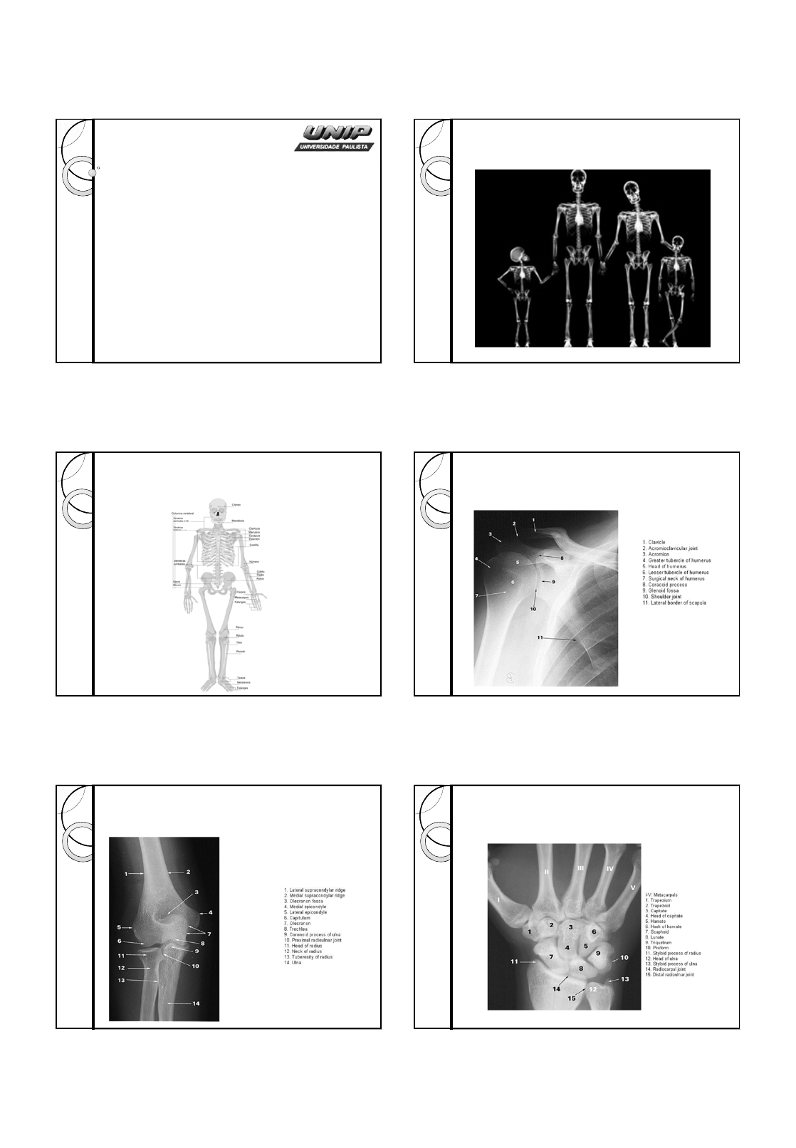 28/8/2013 1 MMSS Ombro – Cotovelo – Punho e Dedos Profa. Ms. Thaís Santos Contenças Anatomia Radiológica Anatomia Radiológica Ombro Cotovelo Punho e Dedos 28/8/2013 2 Punho e Dedos Terminologia de Trauma Esquelético � Luxação ◦ quando o contato articular dos ossos que formam a articulação é completamente perdido. ◦ o retorno a normalidade pode provocar uma fratura por avulsão. � Entorse ◦ torção ou distensão forçada de uma articulação, resultando em ruptura parcial dos ligamentos. ◦ os sintomas são similares aos de uma fratura, e as radiografias ajudam na diferenciação entre uma entorse e uma fratura. � Fratura ◦ descontinuidade do tecido ósseo. � Contusão ◦ tipo de trauma com uma possível fratura em avulsão. Terminologia de Trauma Esquelético � Luxação Terminologia de Trauma Esquelético � Entorse Terminologia de Trauma Esquelético � Fratura Tipos de fratura � Fratura simples (fechada) ◦ a estrutura óssea não atravessa a pele. � Fratura composta (aberta) ◦ a estrutura óssea projeta-se através da pele. 28/8/2013 3 Tipos de fratura � Fratura incompleta ◦ Não ultrapassa toda a estrutura (a estrutura óssea não é quebrada em duas partes). É mais comum em crianças.; � Fratura completa ◦ a quebra é completa e inclui o corte transversal da estrutura óssea. Ela é quebrada em duas partes; � Fratura cominutiva ◦ a estrutura óssea é estilhaçada ou esmagada no local do impacto, resultando em dois ou mais fragmentos; Tipos de fratura Tipos de fratura � Fraturas com denominações específicas ◦ COLLES: fratura do punho na qual o rádio distal é fraturado com o fragmento distal deslocado posteriormente (angulação anterior do ápice). ◦ SMITH (COLLES invertida): essa é uma fratura do rádio distal com deslocamento anterior (angulação posterior do ápice). ◦ POTT: fratura completa da fíbula distal com trauma importante da articulação do tornozelo, associada frequentemente a fratura da tíbia distal ou maléolo medial. Fratura de Colles/Smith Fratura de Colles Fratura de Pott 28/8/2013 4 Radiografia OMBRO Complexo do ombro � Esterno, costelas, clavícula, escápula e úmero. Articulação do Ombro OMBRO 28/8/2013 5 Articulação do Ombro 1. Clavícula. 2. Acrômio. 3. Tuberosidade maior do úmero. 4. Tuberosidade menor do úmero. 5. Colo do úmero 6. úmero. 7. Processo coracóide. 8. Escápula. 9. Costela. Seta, Espaço articular glenoumeral. Articulação do Ombro Incidência 3 – Inclinação caudal 30º - Fundamentalmente utilizada para avaliação do esporão ântero-inferior do acrômio na síndrome do impacto. Incidência 4 – Inclinação cranial 20º - Frente simples, com inclinação cranial da ampola em 20º. - Útil na avaliação da articulação acromioclavicular, pois a inclinação cranial elimina a sobreposição da parte posterior do acrômio. Deve ser feita com baixa penetração radiográfica Perfil axilar 28/8/2013 6 Lesões no manguito rotador Variadas e de diferentes graus de gravidade, mais comuns: Degenerativas: lesões crônicas que ocorrem devido a formação de um acúmulo ósseo que danifica o tendão; Traumatismo local: lesões agudas, resultantes de quedas. � Grupo muscular formado por quatro músculos: ◦ Supra-espinhoso ◦ Infra-espinhoso ◦ Redondo menor ◦ M. Sudescapular � Função principal: manter a cabeça do úmero na cavidade glenóide quando o úmero se movimenta, garantindo a estabilização da articulação. Lesões no manguito rotador Manguito Rotador Vista Anterior Posterior Lesões no manguito rotador Alterações inflamatórias e degenerativas do manguito rotador e da região subacromial. Síndrome do Impacto Lesões no manguito rotador Síndrome do impacto Movimentos repetitivos, como arremesso superior (vôlei) Síndrome do impacto 28/8/2013 7 Degenerações Zona crítica do supra espinhoso� região hipovascularizada Traumatismo Desgaste Ruptura Reparação Condição rara e de etiologia desconhecida que resulta da interrupção anormal da migração caudal da escápula no período embrionário; Movimentos indolores; Abdução reduzida. Elevação congênita da escápula Presença do osso omovertebral, que une a escápula à coluna vertebral; Estrutura óssea que se estende da borda medial da escápula em direção à clavícula e à região occipital, diferente do padrão habitual do osso omovertebral. Elevação congênita da escápula (Escápula = omoplata) Tratamento cirúrgico da deformidade visa à melhora estética e funcional; Osteotomias Ressecções ósseas Liberações musculares com reposicionamento da escápula Associação destas. Elevação congênita da escápula Trata-se de uma síndrome bastante rara, cuja caracterização principal é uma fusão congênita de duas das sete vértebras cervicais. Síndrome de Klippel-Feil 28/8/2013 8 A distrofia fascioescapulumeral (DFEU) é um quadro de caracteriza-se pela degeneração da musculatura da cintura escapular, causando fraqueza desta. Clinicamente, o paciente apresenta escápula alada, além da visível atrofia muscular Escápula Alada Os indivíduos afetados referem dor progressiva no ombro, impossibilidade de realizar atividades habituais como pentear os cabelos, alimentar-se e alcançar objetos acima da cabeça (déficit de elevação do membro superior acometido). Exame por imagem Radiografia simples Simples de frente verdadeira Exame por imagem Radiografia simples Simples axilar Exame por imagem Radiografia do túnel supra espinhal Simples axilar A espinha da escápula deve estar a 90 graus em relação ao chassi Estuda o contorno do acrômio na região subacromial Osteófito na região subacromial Exame por imagem Radiografia simples Artrografia de duplo contraste (pneumoartrografia) Determina uma ruptura e a extensão dela Lesão com extravasamento de contraste Exame por imagem 28/8/2013 9 Ressonância magnética Ressonância magnética Ressonância magnética 1