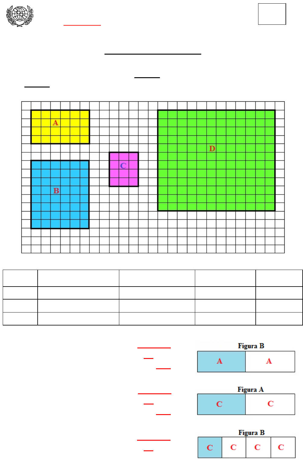 Colégio Pedro II – Campus Humaitá I Nome: GABARITO 5º ano - Turma: ________ Data: ____ /____/_________ Alterando dimensões da Figura 1) No espaço da grade, considerando comprimento (horizontal) e largura (vertical), faça quatro figuras da seguinte forma: Figura B (azul): duplique somente a largura da Figura A; Figura C (rosa): reduza à metade somente o comprimento da figura A; Figura D (verde): duplique o comprimento e triplique a largura da figura A. Preencha a tabela com as informações e medidas das figuras que você construiu e pintou. Número de quadradinhos no interior Dimensões comprimento x largura Perímetro (u) Área (u.a.) Figura B 6 x 8 = 48 6 u x 8 u 2 x (6 + 8) = 28 6 x 8 = 48 Figura C 3 x 4 = 12 3 u x 4 u 2 x (3 + 4) = 14 3 x 4 = 12 Figura D 12 x 12 = 144 12 u x 12 u 2 x (12 + 12) = 48 12 x 12 = 144 De acordo com a tabela que você preencheu, responda e represente a fração graficamente. a) Quantas vezes a figura A cabe na figura B? 48 ÷ 24 = 2 Que fração a figura A representa da figura B? 1/2 Que percentual da figura B a figura A representa? 50% b) Quantas vezes a figura C cabe na figura A? 24 ÷ 12 = 2 Que fração a figura C representa da figura A? 1/2 Que percentual da figura A a figura C representa? 50% c) Quantas vezes a figura C cabe na figura B? 48 ÷ 12 = 4 Que fração a figura C representa da figura B? 1/4 Que percentual da figura B a figura C representa? 25% d) Quantas vezes a figura A cabe na figura D? 144 ÷ 24 = 6 Que fração a figura A representa da figura D? 1/6 e) Quantas vezes a figura B cabe na figura D? 144 ÷ 48 = 3 Que fração a figura B representa da figura D? 1/3 f) Quantas vezes a figura C cabe na figura D? 144 ÷ 12 = 12 Que fração a figura C representa da figura D? 1/12 Pergunta: As figuras desenhadas por você representam ampliações ou reduções da Figura A? Não. Justifique. Para que houvesse redução ou ampliação da figura A, todas as dimensões deveriam ser multiplicadas ou divididas pelo mesmo número. Isto não aconteceu. Repare que as áreas das figuras construídas a partir da figura A não são produtos ou divisores do quadrado de um número natural. 2) Marque um X na resposta certa em cada caso. a) A área da Figura I é: ( ) duas vezes a área da figura II. ( X ) quatro vezes a área da figura II. ( ) seis vezes a área da figura II. ( ) oito vezes a área da figura II. b) A professora pediu que quatro de seus alunos desenhassem o retângulo abaixo na malha quadriculada, ampliando, reduzindo ou mudando a figura de posição. Veja. Quais crianças conseguiram cumprir a tarefa? (Lembre o conceito de ampliação ou redução) ( ) Bia e Carol ( ) Léo e Carol ( ) Lucas e Bia ( X ) Léo e Lucas Justifique sua resposta. Lucas acertou, pois manteve as dimensões da figura executando apenas uma mudança de posição (rotação). Léo acertou, pois executou uma ampliação multiplicando todas as dimensões por 2. �